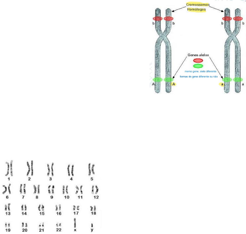 Genética Cromossomos: alguns conceitos e analogias Cada cromossomo ➔formado por uma única molécula de DNA extremamente longa, que contém uma série de genes. O genoma humano contém 23 pares de cromossomos, ou seja, 46 moléculas de DNA, sendo 44 diferentes autossomos e 2 diferentes cromossomos sexuais. O cromossomo sexual, especialmente o Y, contém genes cruciais para determinar o sexo. O cromossomo X possui uma região que é similar ao Y, chamada de região pseudoautosomal, onde ocorre emparelhamento e recombinação durante a meiose. Isso é importante para a herança e determinação do sexo. Conceitos Cromossos homólogos: Os pares de autossomos são chamados de cromossomos homólogos porque cada par contém versões semelhantes dos genes, um de origem materna e outro de origem paterna. Eles compartilham os mesmos locais gênicos ao longo de sua extensão. Homologo: formas iguais, mesmo tamanho, mesmos genes. Exemplo: O gene da lactase, responsável pela quebra da lactose, está presente em indivíduos, mas as variações nos pares de bases ao nível molecular criam diferentes formas do gene, conhecidas como alelos. Essas variações podem influenciar a capacidade de um indivíduo de digerir a lactose, resultando em intolerância à lactose em alguns casos. Os cromossomos homólogos estão presentes apenas em células somáticas de organismos diploides. Isso significa que em células somáticas, onde há dois conjuntos de cromossomos (um proveniente do pai e outro da mãe), os cromossomos homólogos estão presentes em pares, representando as versões maternas e paternas dos cromossomos. Em células sexuais haploides, como espermatozoides e óvulos, os cromossomos homólogos não estão presentes, já que contêm apenas um conjunto de cromossomos. 2 números - 2n23 = 46 Células gaméticas passam por meiose, não por mitose. Durante a meiose, o material genético é reduzido pela metade, resultando em células haploides que contêm apenas um conjunto de cromossomos. Isso é essencial para garantir que, após a fertilização, o número diploide de cromossomos seja restaurado na célula resultante, formando um organismo diploide. Organização Genética Imagine que cada célula do nosso corpo é como uma biblioteca, e cada biblioteca contém trilhões de livros. Cada livro representa um par de cromossomos, e como somos organismos diploides, temos 23 pares de livros duplicados, totalizando 46 livros (ou cromossomos) em cada biblioteca. Dentro de cada livro (ou cromossomo), existem capítulos que representam os genes. Esses genes são como as instruções que dizem à célula como funcionar e quais características expressar. Por fim, as palavras dentro de cada capítulo são como os nucleotídeos, as unidades básicas do código genético. Cada palavra (ou nucleotídeo) compõe as instruções genéticas contidas em cada gene. Então, na nossa "primeira biblioteca", teríamos: • 23 livros (ou cromossomos) da mãe, representando os cromossomos herdados dela. • 23 livros (ou cromossomos) do pai, representando os cromossomos herdados dele. Esses 46 livros (ou cromossomos) formariam a nossa biblioteca inicial, ou seja, o conjunto completo de material genético que recebemos dos nossos pais no momento da concepção. Essa biblioteca inicial é a base para a construção do nosso organismo. Cromossomos e ciclo celular A estrutura do núcleo é dinâmica. Os cromossomos de uma célula alteram a sua estrutura e as suas atividades de acordo com o estágio do ciclo de divisão celular. Tudo abaixo é material genético, mas estão em formatos diferentes Ciclo celular Série de processos que uma célula precisa efetuar para conseguir se dividir. A grande maioria das células além de duplicar seus cromossomos para que ocorra a divisão de material genético, também duplica seu volume e suas organelas citoplasmáticas em cada ciclo celular. O ciclo celular é o processo pelo qual uma célula passa para crescer e se dividir em duas células filhas. Ele é dividido em duas principais fases: interfase e mitose (ou meiose em células sexuais). Durante a interfase, a célula cresce, duplica seus componentes e se prepara para a divisão. É composta por três etapas: G1 (crescimento celular), S (síntese de DNA, onde o DNA é replicado) e G2 (preparação para a divisão). A mitose (ou meiose) é a fase de divisão celular, que consiste em prófase (condensação do DNA), metáfase (alinhamento dos cromossomos), anáfase (separação dos cromossomos), e telófase (formação de duas novas células). O ciclo celular é crucial para o crescimento, reparação e renovação dos tecidos no organismo. Anotações: - Interfase é o estágio mais longo do ciclo celular, representando cerca de 23 horas em um relógio, durante o qual as células vivem e realizam suas funções normais. A divisão celular entra em cena para organizar e replicar o material genético, preparando a célula para a divisão propriamente dita. Interfase: cromatina visualizada como uma massa única e difusa (material descondensado). Divisão celular: a cromatina está altamente compactada, constituindo os cromossomos Cromatina e os cromossomos representam dois aspectos morfológicos e fisiológicos da mesma estrutura. Na interfase, o DNA está menos condensado e a célula realiza suas funções normais, como replicação e expressão gênica. Na mitose, o DNA é altamente condensado em cromossomos visíveis ao microscópio e é distribuído de maneira equitativa entre as células filhas. Interfase os cromossomos estão menos condensados e muito ativos, havendo a produção de proteínas para a célula através de um fluxo de informação genética partindo do DNA. A Mitose ou Fase M, é a fase onde os cromossomos estão altamente condensados e inativos, prontos para a divisão da célula. Auge da condensação: apenas divide - por isso é altamente compactado. Mitose x meiose Meiose nos gametas é um processo reducional: d