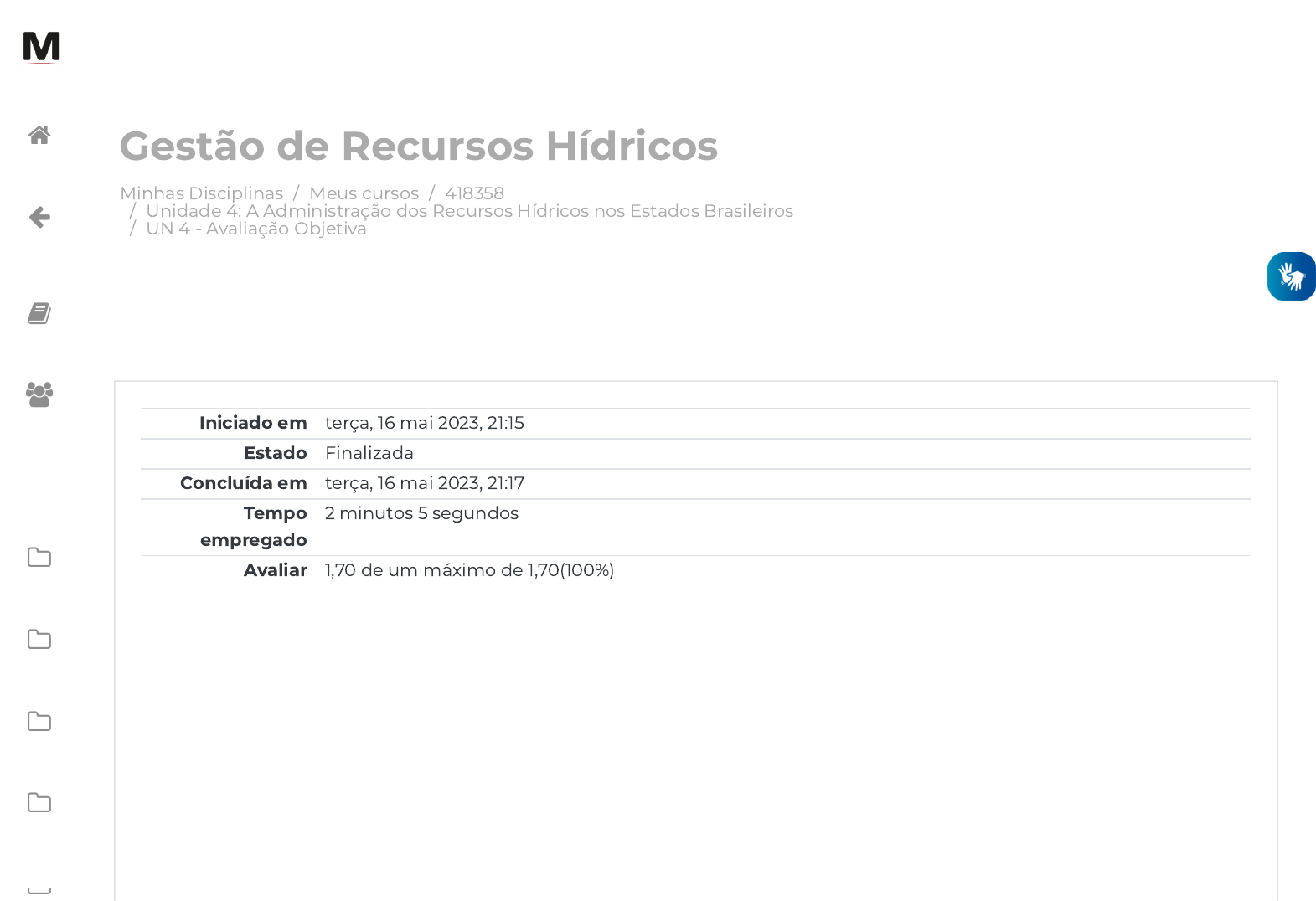 23/05/2023, 09:37 UN 4 - Avaliação Objetiva: Revisão da tentativa https://avap.multivix.edu.br/mod/quiz/review.php?attempt=3041283&cmid=1316923 1/7 Minhas Disciplinas / Meus cursos / 418358 / Unidade 4: A Administração dos Recursos Hídricos nos Estados Brasileiros / UN 4 - Avaliação Objetiva Gestão de Recursos Hídricos Iniciado em terça, 16 mai 2023, 21:15 Estado Finalizada Concluída em terça, 16 mai 2023, 21:17 Tempo empregado 2 minutos 5 segundos Avaliar 1,70 de um máximo de 1,70(100%) https://avap.multivix.edu.br/my/ https://avap.multivix.edu.br/course/view.php?id=20197 https://avap.multivix.edu.br/course/view.php?id=20197§ion=5 https://avap.multivix.edu.br/mod/quiz/view.php?id=1316923 https://avap.multivix.edu.br/my/ https://avap.multivix.edu.br/course/view.php?id=20197 https://avap.multivix.edu.br/user/index.php?id=20197 https://avap.multivix.edu.br/course/view.php?id=20197§ion=1 https://avap.multivix.edu.br/course/view.php?id=20197§ion=2 https://avap.multivix.edu.br/course/view.php?id=20197§ion=3 https://avap.multivix.edu.br/course/view.php?id=20197§ion=4 https://avap.multivix.edu.br/course/view.php?id=20197§ion=5 https://avap.multivix.edu.br/ 23/05/2023, 09:37 UN 4 - Avaliação Objetiva: Revisão da tentativa https://avap.multivix.edu.br/mod/quiz/review.php?attempt=3041283&cmid=1316923 2/7 Questão 1 Correto Atingiu 0,34 de 0,34 A gestão e o planejamento dos recursos hídricos dependem de conhecimento e informações. A Informação é a base do sucesso de qualquer operação, com os recursos hídricos não seria diferente. As informações básicas necessárias para o gerenciamento bem estruturado são: características físicas dos sistemas hídricos; comportamento hidroclimatológico; dados socioeconômicos. Qual operação citada a seguir é útil para a obtenção destas informações? Escolha uma opção: a. Reuniões dos comitês de bacia com participação popular e geração de dados. b. Gerenciamento por bacia hidrográ�ca para identi�car as características locais. c. Controle de dados através de um sistema de gestão implementado em pontos diferentes. d. Desenvolvimento de tecnologias para leitura de dados dos recursos hídricos. e. Monitoramento pluviométrico e �uviométrico de diversos pontos. https://avap.multivix.edu.br/my/ https://avap.multivix.edu.br/course/view.php?id=20197 https://avap.multivix.edu.br/user/index.php?id=20197 https://avap.multivix.edu.br/course/view.php?id=20197§ion=1 https://avap.multivix.edu.br/course/view.php?id=20197§ion=2 https://avap.multivix.edu.br/course/view.php?id=20197§ion=3 https://avap.multivix.edu.br/course/view.php?id=20197§ion=4 https://avap.multivix.edu.br/course/view.php?id=20197§ion=5 https://avap.multivix.edu.br/ 23/05/2023, 09:37 UN 4 - Avaliação Objetiva: Revisão da tentativa https://avap.multivix.edu.br/mod/quiz/review.php?attempt=3041283&cmid=1316923 3/7 Questão 2 Correto Atingiu 0,34 de 0,34 No Estado de São Paulo existem dois órgãos que estão diretamente ligados ao monitoramento das águas. O Departamento de Águas e Energia Elétrica, DAEE e a Companhia Ambiental do Estado de São Paulo, CETESB. O DAEE é responsável por monitorar a quantidade das águas através da pluviometria e da �uviometria, já a CETESB é responsável por monitorar a qualidade das águas através de coletas de amostras e análises laboratoriais. Os dois possuem pontos de monitoramento �xos em diversos corpos hídricos para a coleta dos dados. Além das funções de monitoramento, o DAEE e a CETESB tem as funções de gerar a outorga e a licença ambiental, respectivamente. No sistema de gestão de recursos hídricos qual a função destas duas autorizações, outorga e licença? Escolha uma opção: a. Garantir água para todos de forma controlada e restrita. b. Controlar o uso dos recursos hídricos para garantir uma distribuição adequada a todos. c. Gerar dados para elaborar o relatório de situação dos recursos hídricos. d. Limitar o número de usuários, somente poucas pessoas tem autorização de captar água. e. Limitar o número de construções, assim como a captação de água e o lançamento de e�uentes. https://avap.multivix.edu.br/my/ https://avap.multivix.edu.br/course/view.php?id=20197 https://avap.multivix.edu.br/user/index.php?id=20197 https://avap.multivix.edu.br/course/view.php?id=20197§ion=1 https://avap.multivix.edu.br/course/view.php?id=20197§ion=2 https://avap.multivix.edu.br/course/view.php?id=20197§ion=3 https://avap.multivix.edu.br/course/view.php?id=20197§ion=4 https://avap.multivix.edu.br/course/view.php?id=20197§ion=5 https://avap.multivix.edu.br/ 23/05/2023, 09:37 UN 4 - Avaliação Objetiva: Revisão da tentativa https://avap.multivix.edu.br/mod/quiz/review.php?attempt=3041283&cmid=1316923 4/7 Questão 3 Correto Atingiu 0,34 de 0,34 A outorga e a cobrança são instrumentos de gestão de recursos hídricos e estão previstos na Lei 9633/97. A cobrança pelo uso da água não é um imposto, mas um recurso �nanceiro que deve servir para a preservação da água e estabelecer que a água é um bem público e de valor econômico, portanto seu uso deve ser pago. Em relação a cobrança, avalie as a�rmações a seguir. I. A cobrança tem como objetivo obter verba para a recuperação das bacias hidrográ�cas. II. Estimular o investimento em controle da poluição é um dos objetivos da cobrança. III. A cobrança possui como um dos objetivos dar ao usuário uma sugestão do real valor da água. IV. Incentivar a utilização de tecnologias limpas e poupadoras de recursos hídricos também é um dos objetivos da cobrança. Fonte: ANA, Agência Nacional de Águas. Disponível in: <https://www.ana.gov.br/gestao-da- agua/cobranca>; Acesso em 17 set 2019. É correto apenas o que se a�rma em Escolha uma opção: a. I, II, III e IV b. II e IV https://www.ana.gov.br/gestao-da-agua/cobranca%3E https://avap.multivix.edu.br/my/ https://avap.multivix.edu.br/course/vi