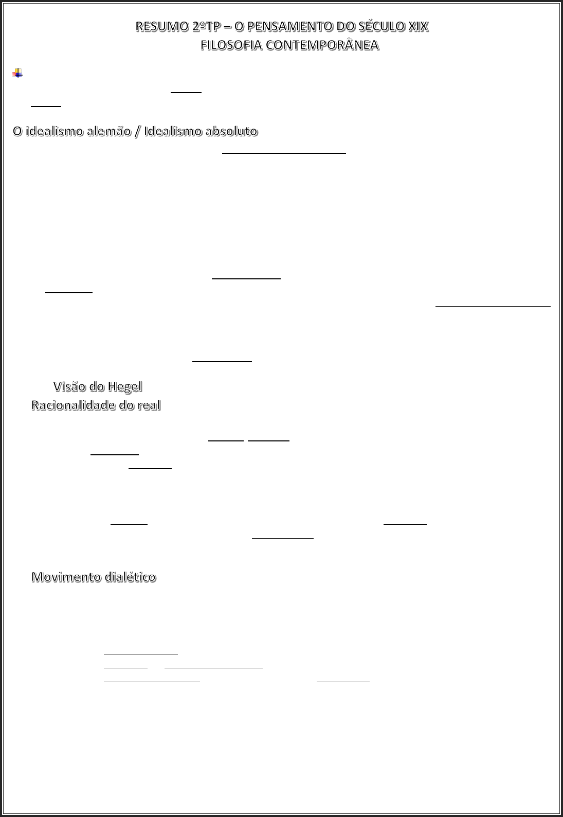 Filosofia - Aluno 2055 EMANUEL FREITAS OBS: Na filosofia, trabalhamos o conceito de sujeito e objeto, sendo o sujeito um ser que tem consciência, um observador, uma entidade. O sujeito se relaciona com outra entidade, uma entidade que é observada, esse é o objeto. • O termo "idealismo" faz referência à Teoria das ideias de Platão. Porém, no período moderno, esse termo é ressignificado e bastante difundido. Ele passa a ser empregado em dois sentidos: epistemológico e romântico. Distinta do Positivismo, mas bastante ligada ao romantismo. Teve em Friedrich Hegel seu máximo expoente. • O Idealismo Alemão é também chamado de Idealismo Absoluto, pois tem por finalidade frisar a tese de que o Eu ou Espírito é o princípio único de tudo e que fora dele não existe nada. • Ele desenvolveu-se no contexto da Revolução Francesa e de suas consequências no mundo europeu, como as guerras napoleônicas. Doutrina filosófica que, na sua aproximação da realidade, coloca em primeiro lugar o modo como se processa o conhecimento na consciência de quem conhece (sujeito) e somente em segundo lugar a realidade que é conhecida (objeto). Ou seja, uma doutrina é idealista quando concebe a noção de que o sujeito tem um papel mais determinante que o objeto no processo de conhecimento. o Há vários tipos de idealismo. Platão, principal idealista da antiguidade, e sua teoria das ideias; Descartes e sua formulação do cogito; e Kant e o conhecimento a priori e a posteriori. Somente podemos conhecer as nossas ideias → O mundo interior da nossa consciência, o mundo subjetivo. • Hegel, autor da obra “Fenomenologia do Espírito”, construiu uma obra que é apontada como ponto culminante do racionalismo. Ele elaborou um sistema filosófico abrangente, pois buscou resposta para mais questões, tentando reconciliar a filosofia com a realidade. Hegel entendia a realidade como um processo análogo (semelhantes, mas com origens distintas) ao pensamento. Ele dizia que o real é racional e o racional é real. I. A realidade possui racionalidade ou identifica-se com esta. II. A razão possui a realidade ou identifica-se com esta. • Assim, Hegel rompeu com a distinção entre sujeito e objeto. Para ele, a realidade se identificaria totalmente com o espirito (ideia ou razão), enquanto a racionalidade seria o fundamento de tudo o que existe, inclusive da natureza. • Para Hegel, a realidade não é apenas uma substância, mas sim um sujeito com vida própria que pode atuar. o Entender a realidade como espírito é entende-la nesse seu atuar constante, ou seja, movimento ou processo. É entende-la como devir (mudança pelo que as coisas passam). O movimento dialético se processaria em três momentos: (as sentenças ao lado são EXEMPLOS para melhorar o entendimento). 1. Ser em si (TESE) → Crescimento/Construção das cidades, construindo estradas, expandindo para o mar. 2. Ser outro ou fora de si (ANTÍTESE) → Idade Média (Fuga das cidades, volta para o campo) 3. Ser para si (SÍNTESE)→ Retomada das cidades + Globalização (“transbordou” o limite anterior, a tese) o Esses momentos se sucederiam com um movimento espiral, assim cada momento final, que seria a síntese, seria a tese de um movimento posterior. • Para Hegel, para compreender a dialética da realidade é necessário que a razão se afaste do entendimento comum e se coloque no ponto de vista do absoluto. A consciência que consegue isso atinge a Razão ou o Saber Absoluto, ou seja, supera o entendimento finito e adquire a certeza de toda a realidade. Assim, alcança a unidade entre ser e pensar, harmonizando a subjetividade com objetividade. • O pensamento de Hegel vai se apresentar como um grande sistema, havendo a relação entre finito e infinito. o O trabalho da filosofia seria superar o entendimento finito e limitado das coisas finitas e limitadas para alcançar o saber absoluto, que é o saber da coisa em si. • Ele, tentou buscar o caminho do conhecimento finito ao conhecimento absoluto. No que concerne à natureza, rompeu com a visão romântica, que a divinizava, proclamando a superioridade do espírito, que se realiza na história dos seres humanos por meio de sua liberdade. Em relação ao espírito, o filósofo distinguiu três instâncias. O espírito subjetivo – refere-se ao indivíduo e à consciência individual. O espirito objetivo – refere-se às instituições e aos costumes produzidos pelo Homem, expressão da liberdade humana; O espirito absoluto – a arte, a religião e a filosofia como espírito que se auto compreende. • Para Hegel, a história é o desdobramento do espírito objetivo → O espírito é a realização da liberdade humana na sociedade, manifestando-se no direito, na moral e na ética (família, sociedade e estado) o O Estado político é o momento mais elevado do espírito objetivo (de modo que o indivíduo só existe sendo um membro do Estado). Portanto, a história seria o desdobramento do espírito no tempo. • Para ele, todas as coisas existentes, mesmo as piores, fazem parte de um plano racional e, portanto, têm um sentido dentro do processo histórico. o Recebeu críticas, pois pode levar a uma certa conformidade diante as injustiças sociais. Ele criticava as noções abstratas como as ideias, espirito e a razão, que se baseavam no idealismo hegeliano. Ele propôs que a filosofia deveria partir do concreto, do ser humano considerado como um ser natural e social. o Essa sua posição filosófica, que tem como ponto de partida o ser concreto, é chamada de materialismo. • Além disso, Feuerbach criticou o idealismo de Hegel, na qual chamou de “especulação vazia””. Defendendo, assim, que a filosofia deveria ser a partir do ser concreto (ser humano considerado um ser natural e social). • Feuerbach criticou as religiões e disse que não foi Deus que nos criou, mas a gente criou Ele. (materialismo) • Junto a Friedrich Engels, Marx lança a obra 