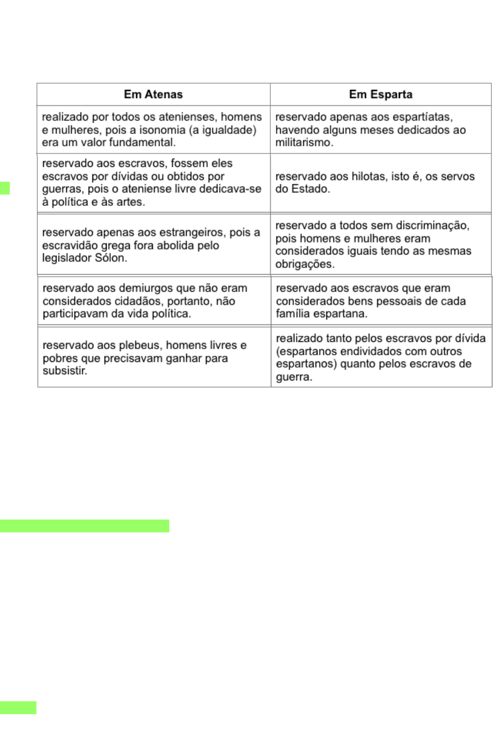 AVALIAÇÃO DE HISTÓRIA - 1º ANOS – 2º BIMESTRE TESTE – INDIVIDUAL – CONSULTA AUTORIZADA AO MATERIAL ADEQUADO NÃO RASURAR OU ANOTAR A FOLHA DE PERGUNTAS. 1) (IFSP) Em Atenas e em Esparta, as mais importantes polis gregas da antiguidade. o trabalho era preferencialmente distribuído do seguinte modo: a) b) c) d) e) 2) (UNESP) “A cidade-Estado clássica parece ter sido criada paralelamente pelos gregos e pelos etruscos e/ou romanos. No caso destes últimos, a influência grega foi inegável, embora difícil de avaliar e medir.” (Ciro Flamarion S. Cardoso. A cidade-Estado antiga,1985.) Aponte quais eram as características comuns às cidades-Estados clássicas: I. Possuíam governo tripartido em assembleia, conselho e certo número de magistrados escolhidos entre os homens elegíveis. II. Os cidadãos podiam participar de forma direta no processo político. III. Havia separação entre os órgãos de governo e de justiça. a) As afirmativas I e II estão corretas. b) Apenas a afirmativa III está correta. c) As afirmativas I e III estão corretas. d)Apenas a afirmativa II está correta. e) As afirmativas I, II e III estão corretas. 3) (UFPI) As afirmativas a seguir estão relacionadas com os povos gregos na antiguidade. Assinale a sequência correta sobre as alternativas Verdadeiras e Falsas. 1 - Os atenienses criaram a democracia como forma de governo. Dessa prática política, estavam excluídos de participação as mulheres, os estrangeiros e os escravos. 2 - Os atenienses construíram no século V a.C. um vasto império que controlava a Grécia, o Egito, a Palestina e a Babilônia. 3 - A cidade de Esparta tinha uma estrutura social rígida e dividia-se em: espartanos, classe privilegiada; os periecos, que se dedicavam ao comércio e os hilotas, pessoas que assumiam a função de servos. 4 - Os atenienses, durante as Guerras Médicas, venceram os espartanos e, em seguida, fizeram a unificação de todas as cidades-estado gregas. a) 1 e 3 b) 1, 3 e 4 c) 3 e 4 d) 2 e 3 e)1 e 2 4) (ENEM) Para Platão, o que havia de verdadeiro em Parmênides era que o objeto de conhecimento é um objeto de razão e não de sensação, e era preciso estabelecer uma relação entre objeto sensível ou material que privilegiasse o primeiro em detrimento dosegundo. Lenta, mas irresistivelmente, a Doutrina das ideias formava-se em sua mente. O texto faz referência à relação entre razão e sensação, um aspecto essencial da Doutrina das Ideias de Platão (427 a.C. 346 a.C.). De acordo com o texto, como Platão se situa diante dessa relação? a) estabelecendo um abismo intransponível entre as duas. b) privilegiando os sentidos e subordinando o conhecimento a eles. c) atendo-se à posição de Parmênides de que razão e sensação são inseparáveis. d) afirmando que a razão é capaz de gerar conhecimento, mas a sensação não. e) rejeitando a posição de Parmênides de que a sensação é superior à razão. 5) (Mackenzie) Na Pólis grega e no Império Romano, o trabalhador escravo esteve na origem das grandes realizações, podendo-se afirmar que: a) tanto na Grécia como em Roma, eram instrumentos vivos e participavam da vida política, respectivamente da Bulé e do Senado. b) os escravos podiam pertencer exclusivamente aos cidadãos e realizavam assembléias que defendiam seus direitos. c) a fonte principal de abastecimento de escravos, tanto em Roma como na Grécia, era o comércio com as tribos africanas. d) a invasão Macedônia na Grécia e as guerras de expansão romanas determinaram o fim da escravidão. e) o sistema de produção era baseado na força de trabalho de prisioneiros de guerra ou populações escravizadas. 6) (UNESP) “A partir do século VII a.C., muitas comunidades nas ilhas, na Grécia continental, nas costas da Turquia e na Itália construíram grandes templos destinados a deuses específicos: os deuses de cada cidade. As construções de templos foram verdadeiramente monumentais. [...] Tornaram-se as novas moradias dos deuses. Não eram mais deuses de uma família aristocrática ou de uma etnia, mas de uma pólis. Eram os deuses da comunidade como um todo. A religião surgiu, assim, como um fator aglutinador das forças cooperativas da pólis. [...] A construção monumental foi influenciada por modelos egípcios e orientais. Sem as proezas de cálculo matemático, desenvolvidas na Mesopotâmia e no Egito, os grandes monumentos gregos teriam sido impossíveis.” (GUARINELLO, Norberto Luiz. História antiga, 2013) Segundo o texto, um papel fundamental da religião, na Grécia antiga, foi o de: a) eliminar as diferenças étnicas e sociais e permitir a igualdade social. b) estabelecer identidade e vínculos comunitários e unificar as crenças. c) impedir a persistência do paganismo e afirmar os valores cristãos. d) eliminar a integração política, militar e cultural entre as cidades-estados. e) valorizar as crenças aristocráticas e eliminar as formas de culto populares. 7) (UNESP) “A cidade tira de seu império uma parte da honra, da qual todos vós vos gloriais, e que deveis legitimamente apoiar; não vos esquiveis às provas, se não renunciais também a buscar as honras; e não penseis que se trata apenas, nesta questão, de ser escravos em vez de livres: trata-se da perda de um império, e do risco ligado ao ódio que aí contraístes.” (Péricles apud Pierre Cabanes. Introdução à história da Antiguidade, 2009). O discurso de Péricles, no século V a.C., convoca os atenienses para lutar na Guerra do Peloponeso e enfatiza: a) a rejeição à escravidão em Atenas e a defesa do trabalho livre como base de toda sociedade democrática. b) a defesa da democracia, por Atenas, diante das ameaças aristocráticas de Roma. c) a rejeição à tirania como forma de governo e a celebração da república ateniense. d) a defesa do território ateniense, frente à investida militar das tropas cartaginesas. e) a defesa do poder de Atenas e a sua disposiçã