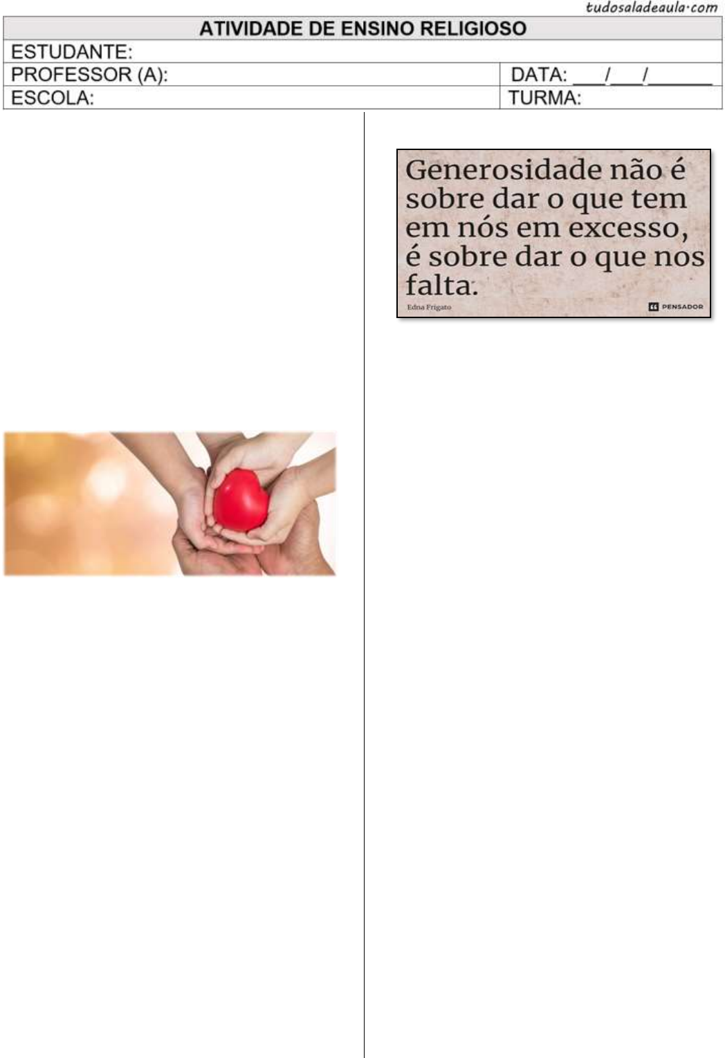 VALORES HUMANOS: A GENEROSIDADE Os valores humanos são definidos como um conjunto de princípios que facilitam a convivência humana em sociedade. Esses princípios são muito importantes e sempre fizeram parte da conquista da liberdade e para o desenvolvimento humano em comunidade. Colocá- los em prática representa a capacidade de o ser humano amar e respeitar o próximo. A Generosidade A generosidade é um conceito profundamente arraigado em nossas interações sociais e na construção de uma sociedade mais compassiva e solidária. Vamos explorar o que exatamente significa ser generoso, sua importância e como essa qualidade pode influenciar positivamente nossas vidas. A generosidade é a disposição de compartilhar recursos, tempo, conhecimento ou afeto com os outros, sem esperar algo em troca. É um ato altruístico, motivado pelo desejo de ajudar e fazer a diferença na vida de alguém. A generosidade pode se manifestar de diversas maneiras, desde doar dinheiro para uma causa nobre até ajudar alguém em apuros ou simplesmente oferecer um ouvido atento a alguém que precisa desabafar. A Importância da Generosidade A generosidade contribui para a construção de comunidades mais fortes e coesas. Ela promove empatia e solidariedade, criando conexões significativas entre as pessoas. Quando somos generosos, contribuímos para um ambiente onde as necessidades dos outros são reconhecidas e atendidas. Essa disposição para ajudar gera um ciclo positivo de apoio mútuo. Além disso, a generosidade consegue melhorar nossa própria saúde mental e bem-estar. O ato de ajudar os outros libera endorfinas, os chamados "hormônios da felicidade", que nos fazem sentir bem e satisfeitos. Portanto, ser generoso não apenas beneficia os destinatários de nossa generosidade, mas também traz recompensas pessoais, aumentando nosso próprio contentamento. Leia e reflita com seus colegas: Você se considera disposto (a) a praticar esse valor humano? Pense. O ato de ser generoso, mesmo em pequenos gestos, pode fazer uma grande diferença na vida de alguém. Pode ser tão simples quanto sorrir para um estranho na rua ou oferecer auxílio a alguém em apuros. Reflexão Somos todos confrontados com desafios e dificuldades em nossas vidas, e um ato generoso pode ser uma luz brilhante em momentos sombrios. Às vezes, um gesto de generosidade pode inspirar outros a fazerem o mesmo, criando um efeito dominó de bondade. Tudo Sala de Aula ___________ATIVIDADE DE FIXAÇÃO___________ 1. Descreva o conceito de generosidade e forneça exemplos de como ela pode ser praticada no dia a dia. ___________________________________________ ___________________________________________ ___________________________________________ ___________________________________________ 2. Com base no texto, explique com suas palavras como a generosidade pode melhorar não apenas a vida daqueles que a recebem, mas também a vida daqueles que a praticam. ___________________________________________ ___________________________________________ ___________________________________________ ___________________________________________ ___________________________________________ 3. Apresente exemplos de atitudes simples exercidas em nosso cotidiano que podem ser consideradas atos de generosidade. ___________________________________________ ___________________________________________ ___________________________________________ ___________________________________________ ___________________________________________ 4. Observe os elementos não verbais do texto abaixo e responda. Qual mensagem a imagem visa transmitir? Em sua opinião, qual a importância da generosidade na vida das pessoas? ___________________________________________ ___________________________________________ ___________________________________________ ___________________________________________ 5. Nas imagens abaixo, marque apenas aquela que não apresenta um exemplo de generosidade. a) b) c) d) 6. Observe os elementos verbais e não verbais da imagem e responda. Com base na imagem e na informação de que um ato de generosidade está sendo filmado para ser compartilhado nas redes sociais, discuta a ideia de como as mídias sociais podem influenciar ou distorcer a motivação por trás de atos altruístas. Como isso pode afetar a percepção das pessoas sobre a generosidade? ___________________________________________ ___________________________________________ ___________________________________________ ___________________________________________ 7. De acordo com o texto, como são definidos os valores humanos? a) Princípios que promovem a igualdade e a equidade entre as pessoas. b) Princípios que enfatizam a competição na sociedade. c) Princípios que facilitam a convivência humana em sociedade. d) Princípios que promovem uma boa convivência e aumenta o individualismo. 8. Qual é a importância da generosidade na construção de comunidades mais fortes, conforme o texto? a) A generosidade não desempenha um papel significativo na construção de comunidades. b) A generosidade promove a competição e a solidariedade entre as pessoas. c) A generosidade promove empatia e solidariedade, criando conexões significativas. d) A generosidade promove um ambiente harmonioso e antissocial. 9. Qual é a principal mensagem do texto em relação à generosidade? a) A generosidade é uma qualidade desnecessária na sociedade moderna. b) A generosidade deve ser praticada com cuidado, pois devemos ser generosos apenas em algumas ocasiões. c) A generosidade aumenta a capacidade de confiar nas pessoas, e aumenta o grau de competitividade entre as comunidades. d) A generosidade é fundamental para construir uma sociedade compassiva e solidária. 10. Observe a tirinha e responda. Na tira, é mencionado o valor humano generosidade que significa a) a capacidade de ser sincero e honesto com as pessoas. b) a disposição de compartilhar recursos, tempo, conhecimento ou afeto com os outros, se