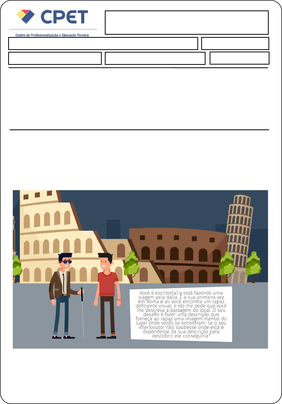 Desenvolvimento e Interpretação de textos Aluno (a): Data: / / 202___. Atividade Prática Final NOTA: INSTRUÇÕES: · Esta Avaliação contém 1 (uma) questão, totalizando 10 (dez) pontos. · Você deve preencher dos dados no Cabeçalho para sua identificação · Nome / Data de entrega · As respostas devem ser digitadas abaixo de cada pergunta. · Ao terminar, grave o arquivo com o nome Avaliação Pesquisa/Prática. · Envio o arquivo pelo sistema. Para fazer uma boa descrição, o autor precisa ser detentor de um bom vocabulário e apelar aos cinco sentidos do receptor. Uma descrição bem feita deve revelar o que foi observado em alguém, em algum objeto ou em algum lugar; ela pretende que o receptor possa perceber o que está sendo descrito, criando uma imagem mental por meio de um retrato verbal que não se resume a enumerar adjetivos e fazer comparações, mas se propõe a captar o traço distintivo, particular, o que diferencia aquele ser descrito de todos os demais de sua espécie. Elabore a sua descrição de modo que, por meio das características descritas, o interlocutor seja capaz de identificar qual local famoso está sendo descrito. Atividade Prática image1.png image2.png