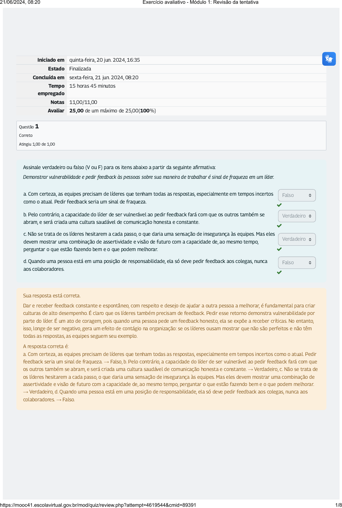 Iniciado em quinta-feira, 20 jun. 2024, 16:35 Estado Finalizada Concluída em sexta-feira, 21 jun. 2024, 08:20 Tempo empregado 15 horas 45 minutos Notas 11,00/11,00 Avaliar 25,00 de um máximo de 25,00(100%) Questão 1 Correto Atingiu 1,00 de 1,00 Assinale verdadeiro ou falso (V ou F) para os itens abaixo a partir da seguinte a�rmativa: Demonstrar vulnerabilidade e pedir feedback às pessoas sobre sua maneira de trabalhar é sinal de fraqueza em um líder. a. Com certeza, as equipes precisam de líderes que tenham todas as respostas, especialmente em tempos incertos como o atual. Pedir feedback seria um sinal de fraqueza. b. Pelo contrário, a capacidade do líder de ser vulnerável ao pedir feedback fará com que os outros também se abram, e será criada uma cultura saudável de comunicação honesta e constante. c. Não se trata de os líderes hesitarem a cada passo, o que daria uma sensação de insegurança às equipes. Mas eles devem mostrar uma combinação de assertividade e visão de futuro com a capacidade de, ao mesmo tempo, perguntar o que estão fazendo bem e o que podem melhorar. d. Quando uma pessoa está em uma posição de responsabilidade, ela só deve pedir feedback aos colegas, nunca aos colaboradores. Falso Verdadeiro Verdadeiro Falso Sua resposta está correta. Dar e receber feedback constante e espontâneo, com respeito e desejo de ajudar a outra pessoa a melhorar, é fundamental para criar culturas de alto desempenho. É claro que os líderes também precisam de feedback. Pedir esse retorno demonstra vulnerabilidade por parte do líder. É um ato de coragem, pois quando uma pessoa pede um feedback honesto, ela se expõe a receber críticas. No entanto, isso, longe de ser negativo, gera um efeito de contágio na organização: se os líderes ousam mostrar que não são perfeitos e não têm todas as respostas, as equipes seguem seu exemplo. A resposta correta é: a. Com certeza, as equipes precisam de líderes que tenham todas as respostas, especialmente em tempos incertos como o atual. Pedir feedback seria um sinal de fraqueza. → Falso, b. Pelo contrário, a capacidade do líder de ser vulnerável ao pedir feedback fará com que os outros também se abram, e será criada uma cultura saudável de comunicação honesta e constante. → Verdadeiro, c. Não se trata de os líderes hesitarem a cada passo, o que daria uma sensação de insegurança às equipes. Mas eles devem mostrar uma combinação de assertividade e visão de futuro com a capacidade de, ao mesmo tempo, perguntar o que estão fazendo bem e o que podem melhorar. → Verdadeiro, d. Quando uma pessoa está em uma posição de responsabilidade, ela só deve pedir feedback aos colegas, nunca aos colaboradores. → Falso. 21/06/2024, 08:20 Exercício avaliativo - Módulo 1: Revisão da tentativa https://mooc41.escolavirtual.gov.br/mod/quiz/review.php?attempt=4619544&cmid=89391 1/8 Questão 2 Correto Atingiu 1,00 de 1,00 Questão 3 Correto Atingiu 1,00 de 1,00 Assina a alternativa que apresenta o que muitas pesquisas mostram sobre o tipo de feedback que as mulheres recebem: a. É mais preciso do que o recebido pelos homens. b. É igual ao feedback dado aos homens nas organizações. c. É o fator-chave que está permitindo que as mulheres cheguem rapidamente a cargos de alta gerência. d. É muito genérico, o que afeta signi�cativamente seu progresso na organização. Sua resposta está correta. Pesquisas mostram que as mulheres recebem feedbacks mais vagos que os homens sobre seu desempenho e que isso afeta signi�cativamente seu progresso na organização. Consequentemente, é importante que as mulheres acostumem seus chefes, colegas e equipe a lhes dar feedback preciso. Por exemplo, em vez de se contentar com algo como "você teve um bom ano e talvez precise melhorar sua comunicação", elas podem perguntar em quais realizações e atitudes especí�cas eles se baseiam para parabenizá-las pelo seu ano e quais recomendações pontuais eles têm para ajudá-las a se comunicarem melhor A resposta correta é: É muito genérico, o que afeta signi�cativamente seu progresso na organização. No que consiste a liderança visionária, indique Verdadeiro ou Falso para as a�rmativas a seguir: a. É a que tem o melhor impacto sobre o clima organizacional. b. É a que produz uma alta rotatividade porque as pessoas não se sentem parte da visão que o líder transmite. c. É aquela que se baseia nas competências de "autoconhecimento", "liderança inspiradora", "autocon�ança", "empatia", "transparência" e "capacidade de catalisar mudanças". d. Deve ser usada quando as pessoas da equipe são especialistas ou têm o mesmo nível de conhecimento que o líder. Verdadeiro Falso Verdadeiro Falso Sua resposta está correta. O estilo visionário é o que tem o melhor impacto sobre o clima. É muito útil para lançar novos empreendimentos ou quando a empresa — ou um projeto em alguma área — está à deriva ou quando uma situação crítica precisa ser resolvida. Os líderes visionários inspiram, mas não impõem; eles deixam liberdade para que cada pessoa escolha sua estratégia para caminhar em direção a essa visão, e é por isso que suas equipes tendem a ter uma rotatividade muito baixa. Seu sucesso se baseia nas competências de "autoconhecimento", "liderança inspiradora", "autocon�ança", "empatia", "transparência" e "capacidade de catalisar mudanças". A resposta correta é: a. É a que tem o melhor impacto sobre o clima organizacional. → Verdadeiro, b. É a que produz uma alta rotatividade porque as pessoas não se sentem parte da visão que o líder transmite. → Falso, c. É aquela que se baseia nas competências de "autoconhecimento", "liderança inspiradora", "autocon�ança", "empatia", "transparência" e "capacidade de catalisar mudanças". → Verdadeiro, d. Deve ser usada quando as pessoas da equipe são especialistas ou têm o mesmo nível de conhecimento que o líder. → Fa