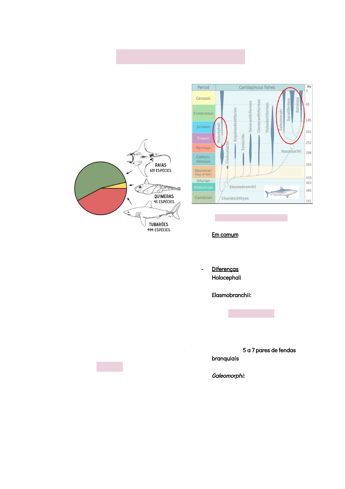 Chondrichthyes - Peixes Cartilaginosos - A minoria dos peixes atuais - Em torno de 1060 spp. atuais e 3 linhagens - raias, tubarões e quimeras - Principalmente marinha, com algumas espécies de água doce - Animais homodonti - dentes de apenas uma forma, independente do tamanho - Animais heterodonti - dentes com diferentes formas e funções - 2 grandes linhagens: Elasmobranchii e Holocephali Filogenia Elasmobranchii + Holocephali - Em comum - escamas placóides, dentição peculiar, clásper (órgão copulatório) - Diferenças - Holocephali: crânio autoestílico - Elasmobranchii: anfistinia, hiostilia Elasmobranchii - Galeomorphi, Squaliformes e Batoidea - Possuem de 5 a 7 pares de fendas branquiais - Galeomorphi: grande parte dos tubarõea atuais, possuem nadadeira anal - Squalomorphis: Sem nadadeira anal - Tubarões de fundo Batoidea - Todos com 5 pares de fendas branquiais apenas - Possuem ferrão na cauda e podem causar acidentes graves nos rios - Fam. Potamotrygonidae Holocephali (quimeras) - Mais antiga que os demais grupos - Maioria vive abaixo de 2.500 m e principalmente em oceanos temperados Morfologia Chondrichthyes - Rostro (focinho) - Boca - Fendas Branquiais - Espiráculo (resquício da primeira fenda branquial) - Nadadeiras: - peitoral - dorsal (sempre ímpares) - caudal - anal Espiráculo - Tubarões pelágicos: serve para oxigenar o sangue que vai para os olhos e cérebro através de vasos especiais - Raias e tubarões bentônicos: a água entra pelo espiráculo na região dorsal e sai pelas fendas branquiais na região ventral - Principal função - animais de fundo tem boca na região ventral, encostada no substrato, o que impede a passagem de água pela boca, além de ter pedras e areia, podendo machucar as brânquias Tipos de Nadadeiras Caudais - A grande maioria tem a epicerca - o lobo superior é maior - mais flexível e compensa a tendência de afundar - Alguns tem homocerca - os lobos têm o mesmo tamanho - altas velocidades por mais tempo, áreas abertas - Escamas - Escamas placóides ou dentículos dérmicos - ossos de origem dérmica, bem pequenos e transparentes - Evoluíram das placas ósseas dos Placodermi - Possuem polpa, dentina e esmalte, a mesma estrutura dos dentes humanos, por exemplo - Sempre voltadas para trás - da cabeça em direção à cauda - Por que? Diminuem a turbulência do fluxo da água próximo à superfície do corpo - aumento da eficiência da natação - As escamas podem ser usadas como característica taxonômica e paleobiológica, uma vez que têm diferentes formas Dentes - Substituição contínua - a cada 7 ou 8 dias - Dentes presos por ligamentos desde o interior da cartilagem até a porção carnosa da boca - Heterodontia em algumas espécies Tegumento - Epiderme e derme - Cromatóforos - Células sensoriais táteis - Glândulas de veneno no epitélio associadas a espinhos dorsais (raias, quimeras e alguns tubarões) - Sistema linha lateral: células ciliadas envoltas por cúpula gelatinosa (neuromastos) - mecanorrecepção - um “tato a distância”, não precisam que um animal encoste neles para que ele seja percebido - Órgãos eletrorreceptores ou Ampolas de Lorenzini - Derivadas da linha lateral: eletrorrecepção - exclusivas de raias, tubarões e quimeras - detectam diferença de potencial elétrico Esqueleto - Condrocrânio - pode ser parcialmente calcificado, mas não pode ser considerado um tec.ósseo - Processo rostral - Maxilas - Nad, Dorsal e Nad Peitorais - Nad. Pélvicas - Nad. Caudal - Vértebras Hiostilia - tubarões modernos - maxilas sustentadas pelo ílio mandibular Anfistilia - tubarões basais - maxilas parte sustentadas pelo condrocrânio e parte pelo ílio Autostilia - quimeras - maxilas sustentadas pelo condrocrânio Em grupos mais basais podemos encontrar a notocorda presente Morfologia interna - Todo peixe contém apenas um átrio e um ventrículo - Peixes tem circulação simples - O epitélio que reveste o interior do intestino é enrolado - válvula espiral - Aumenta a superfície de absorção - Glândula retal - exclusiva - excreta o excesso de sal que é engolido junto da água do mar - Fígado - grande e rico em óleo, diminuindo a densidade do animal e auxiliando na flutuabilidade - Brânquias se originam como evaginações da faringe - Bombeamento bucal: movimento da água através da ação bombeadora da boca e músculos da região da faringe - Ventilação forçada: alguns tubarões perderam a capacidade de bombear e precisam nadar continuamente com a boca aberta Sistema contra corrente - Se os sistemas fossem unidirecionais o sangue deixaria de ser oxigenado no momento em que entrasse em equilíbrio osmótico em relação à água Flutuabilidade - Esqueleto cartilaginoso (mais leve que o esqueleto ósseo) - Compostos nitrogenados no sangue e músculos (são menos densos que a água e criam flutuabilidade positiva) - Grande quantidade de óleo no fígado - Espécies bentônicas diminuíram a quantidade de óleo (flutuabilidade negativa)