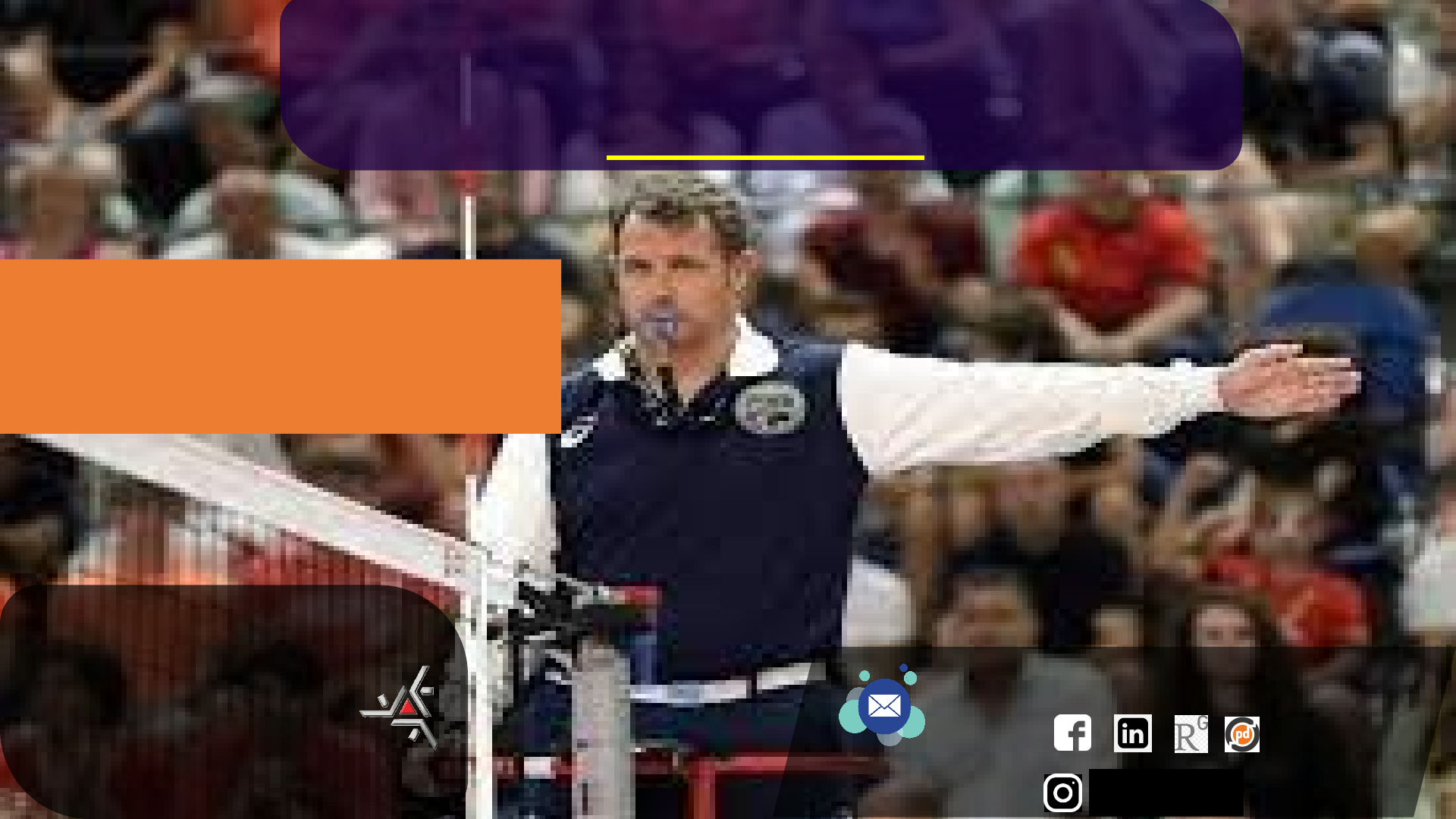 ESPORTES COLETIVOS VOLEIBOL abelfreitag affreitag@uem.br Doutor em Educação Física MBA em Gestão Empresarial Mestre em Ciências da Saúde Especialista em Gestão de Saúde Bacharel em Educação Física Prof. Dr. Abel Felipe Freitag OS ÁRBITROS, SUAS RESPONSABILIDADES E SINAIS MANUAIS OFICIAIS História, terminologia e princípios do treinamento desportivo da Musculação I II III IV Noções de arbitragem Fundamentos técnicos defensivos Princípios técnicos ofensivos Princípios técnicos defensivos Princípios táticos ofensivos Sistemas ofensivos Sistemas defensivos Princípios táticos defensivos Valor educativo da Modalidade Princípios pedagógicos para o ensino da Modalidade Vivência e aplicação dos conteúdos no âmbito de rendimento Vivência e aplicação dos conteúdos no âmbito escolar História e Terminologia / considerações gerais Propostas, objetivos e perspectivas da Modalidade Regras oficiais Fundamentos técnicos ofensivos CONTEÚDO PROGRAMÁTICO REVISÃO DA AULA PASSADA... Interrupções: regulares, tempo de descanso, substituições, solicitações indevidas Retardamentos: tipos, sanções, interrupções excepcionais Intervalos: tempo entre os SETS, troca de quadra O jogador líbero: designação, equipamento, ações, resignação de um novo líbero Conduta dos participantes: jogo honesto, condutas impróprias, escala de sanções Advertência Penalidade Expulsão Desqualificação ATUALIDADES E CURIOSIDADES... Maior público da história: Brasil X União Soviética 95.887 pagantes TABELA DE PONTUAÇÃO 3x0 ou 3x1 = 03 pontos Derrota = 0 pontos 3x2 (tie-break) = 02 ou 01 ponto (ganhador/perdedor) WO = - 02 pontos OU 02 pontos CBB, 2022 4 ou 2 2 (somente eles apitam) CBB, 2022 1º árbitro 2º árbitro Árbitro de desafio Árbitro reserva Apontador Apontador assistente Juízes de linha CBB, 2022 Localização: em pé sobre a cadeira de arbitragem Autoridade: sobre a equipe e membros da arbitragem Autorizado a anular as decisões de outros árbitros Controla o trabalho dos boleiros e enxugadores rápidos Decide se equipamentos e condições da quadra estão apropriados para o jogo Responsabilidades: Inspeciona bolas e área de jogo Realiza o sorteio com os capitães das equipes Emite advertências 1º árbitro 2º árbitro Árbitro de desafio Árbitro reserva Apontador Apontador assistente Juízes de linha CBB, 2022 Localização: de pé, fora da área de jogo e próximo ao poste Autoridade: a) Assistente do 1º árbitro b) Sem apitar, pode sinalizar as faltas fora de sua competência c) Controla o trabalho dos apontadores d) Controla o número de tempos de descanso e substituições Responsabilidades: Falta de posição da equipe receptora Contato faltoso de jogador com a rede Ao final da partida, confere e assina a súmula 1º árbitro 2º árbitro Árbitro de desafio Árbitro reserva Apontador Apontador assistente Juízes de linha CBB, 2022 Localização: na cabine de desafio Responsabilidades: Supervisiona o processo de contestação Usa uniforme de árbitro oficial Após o processo de Desafio, informa o 1º árbitro sobre a natureza da falta Ao final da partida, assina a súmula 1º árbitro 2º árbitro Árbitro de desafio Árbitro reserva Apontador Apontador assistente Juízes de linha CBB, 2022 Localização: em uma posição separada Responsabilidades: Usar uniforme de árbitro Substituir o 2º árbitro em sua ausência Controlar as plaquetas de substituição Ajudar o 2º árbitro a manter a zona livre limpa Controlar os jogadores substitutos na área de aquecimento e no banco Entregar ao 2º árbitro quatro bolas de jogo 1º árbitro 2º árbitro Árbitro de desafio Árbitro reserva Apontador Apontador assistente Juízes de linha CBB, 2022 Localização: sentado na mesa do apontador Responsabilidades: Preenche a súmula Usa a campainha ou outro aparelho sonoro para comunicar irregularidades Antes do início do jogo: registra os dados das equipes e dos jogadores; registra a formação inicial de cada equipe Durante a partida: registra os pontos e as advertências, controla o intervalo No final da partida: registra o resultado final; assina a súmula e colhe as assinaturas dos capitães e dos árbitros 1º árbitro 2º árbitro Árbitro de desafio Árbitro reserva Apontador Apontador assistente Juízes de linha CBB, 2022 Localização: sentado ao lado do apontador Responsabilidades: Registra as trocas que envolvem o líbero Assiste o apontador em suas funções administrativas Antes da partida: prepara a folha de substituição do líbero; súmula reserva Durante a partida: registra o controle das trocas/designação do líbero; opera o placar manual; confere se os placares estão corretos Ao final da partida: assina o formulário de controle do líbero e a submete para conferência 1º árbitro 2º árbitro Árbitro de desafio Árbitro reserva Apontador Apontador assistente Juízes de linha CBB, 2022 Localização: nos cantos da quadra. Cada um controla a linha final/lateral Responsabilidades: sinalizam com bandeiras a bola “dentro” ou “fora” Qualquer jogador, exceto o sacador, que está pisando fora da quadra de jogo As faltas dos pés do sacador A bola que cruza fora das antenas da rede CBB, 2022 CBB, 2022 CBB, 2022 CBB, 2022 CBB, 2022 CBB, 2022 CBB, 2022 CBB, 2022 VOLEI BRASIL: CONFEDERAÇÃO BRASILEIRA DE VOLEIBOL. Regras oficiais de Voleibol 2021-2024. REFERÊNCIAS OBRIGADO! 23 image2.jpg image3.png image4.png image5.png image6.png image7.jpeg image8.png image9.png image1.jpg image10.png image11.png image12.png image13.png image14.png image15.png image16.png image17.png image18.png image19.png image20.png image21.png image22.png image23.png image24.png image25.png image26.png image27.png image28.png image29.png image30.png