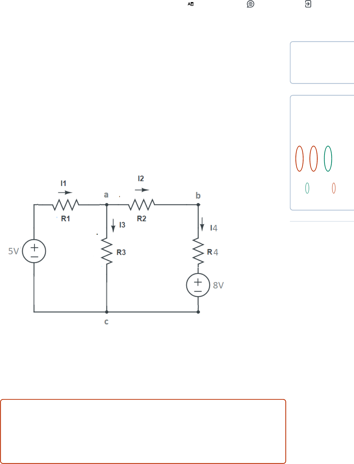 Questão 1 Incorreta Questão com problema? Os circuitos eletrônicos encontram aplicações nas mais diversas áreas como automação, transmissões de rádio e TV, computadores entre outras. Há dois métodos eficientes para o cálculo das correntes e tensões em um circuito como o da figura: análise nodal e a análise de malhas. Fonte: Elaborado pela autora Dados: R =10Ω, R =2Ω, R =5Ω e R =5Ω Assinale a alternativa que apresenta corretamente o valor da soma das correntes I , I , I e I representadas na figura. Sua resposta Incorreta 7,75A 1 2 3 4 1 2 3 4 Pontuação 4/ Questões realizadas: de 3 1 2 3 Acertou Errou Anterior Próximo Correção do exercício da unidade Tamanho da fonte Falar com o tutor Sair da correção Solução esperada 66,75A Comentário Vamos nomear os nós de a e b no circuito, conforme a figura e aplicar a Lei de Kirchhoff. Nó a: 𝐼1 = 𝐼2 + 𝐼3𝐼3 = 𝐼1 - 𝐼2𝐼3 = 𝑖1 - 𝑖2 Malha 1 -5 + 𝑅1 · 𝐼1 + 𝑅3 · 𝐼3 = 0𝑅1 · 𝑖1 + 𝑅3 · � 𝑖1 - 𝑖2 � = 5𝑖1 · �𝑅1 + 𝑅3 � - 𝑖2 · �𝑅3 � = 5 Malha 2 𝑅2 · 𝐼2 + 𝑅4 · 𝐼4 + 8 - 𝑅3 · 𝐼3 = 0𝑅2 · 𝐼2 + 𝑅4 · 𝑖2 + 8 - 𝑅3 · � 𝑖1 - 𝑖2 � = 0𝑖1 · � - 𝑅3 � + 𝑖2 · �𝑅2 + 𝑅3 + 𝑅4 � = - 8 𝑖1 · �𝑅2 + 𝑅� - 𝑖2 · �𝑅3 � = 5𝑖1 · � 10 + 5 � - 𝑖2 · 5 = 5𝑖1 · 15 - 𝑖2 · 5 = 5𝑖1 · 3 - 𝑖2 = 1 𝑖1 · � - 𝑅3 � + 𝑖2 · �𝑅2 + 𝑅3 + 𝑅4 � = - 8𝑖1 · � - 5 � + 𝑖2 · 12 = - 8Resolvendo o sistema linear: 𝑖1 · 3 - 𝑖2 = 1 𝑖1 · � - 5 � + 𝑖2 · 12 = - 8 𝑖1 · 3 - 𝑖2 = 1 � ×12 � 𝑖1 · � - 5 � + 𝑖2 · 12 = - 8 𝑖1 · 36 - 𝑖2 · 12 = 12 𝑖1 · � - 5 � + 𝑖2 · 12 = - 8 Somando as duas equações: 𝑖1 · 36 - 𝑖2 · 12 = 12 + 𝑖1 · � - 5 � + 𝑖2 · 12 = - 8 𝑖1 · �31� = 4𝑖1 = 31 4 𝑖1 = 7, 75𝐴 𝑖1 · 3 - 𝑖2 = 1𝑖2 = 𝑖1 · 3 - 1𝑖2 = 7, 75 · 3 - 1𝑖2 = 22, 25𝐴𝐼1 = 𝐼2 + 𝐼3𝐼3 = 𝐼1 - 𝐼2𝐼3 = 7, 75 - 22, 25𝐼3 = - 14, 5𝐴 𝐼1 = 7, 75𝐴𝐼2 = 22, 25𝐴𝐼3 = 14, 5𝐴𝐼4 = 𝐼2 = 22, 25 Lembre-se que o sinal negativo significa o sentido da corrente foi assumido errado.Somando:𝐼𝑇 = 𝐼1 + 𝐼2 + 𝐼3 + 𝐼4𝐼𝑇 = 7, 75 + 22, 25 + 14, 5 + 22, 25𝐼𝑇 = 66, 75𝐴