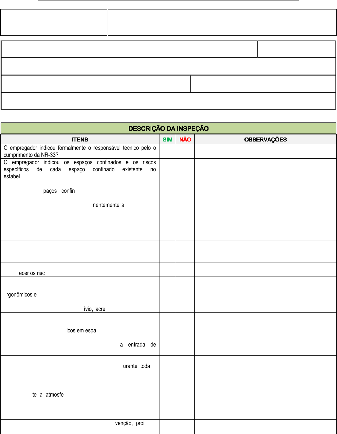 Blog Segurança do TrabalhoBlog Segurança do TrabalhoBlog Segurança do TrabalhoBlog Segurança do Trabalho WWW.BLOGSEGURANCADOTRABALHO.COM.BRWWW.BLOGSEGURANCADOTRABALHO.COM.BRWWW.BLOGSEGURANCADOTRABALHO.COM.BRWWW.BLOGSEGURANCADOTRABALHO.COM.BR Empresa: Data da Inspeção: ____/_____/______ Inspetor (es): Responsável pelo Local de Trabalho / Setor: Local de Trabalho / Setor: Referências Técnicas: DESCRIÇÃO DA INSPEÇÃODESCRIÇÃO DA INSPEÇÃODESCRIÇÃO DA INSPEÇÃODESCRIÇÃO DA INSPEÇÃO ITENSITENSITENSITENS SIMSIMSIMSIM NNNNÃOÃOÃOÃO OBSERVAÇÕESOBSERVAÇÕESOBSERVAÇÕESOBSERVAÇÕES O empregador indicou formalmente o responsável técnico pelo o cumprimento da NR-33? O empregador indicou os espaços confinados e os riscos específicos de cada espaço confinado existente no estabelecimento? O empregador implementou uma gestão em segurança e saúde no trabalho em espaços confinados, por medidas técnicas de prevenção, administrativas, pessoais e de emergência e salvamento, de forma a garantir permanentemente ambientes com condições adequadas de trabalho? Observação A gestão de segurança e saúde deve ser planejada, programada, implementada e avaliada, incluindo medidas técnicas de prevenção, medidas administrativas e medidas pessoais e capacitação para trabalho em espaços confinados. São adotadas como medidas técnicas de prevenção, identificar, isolar e sinalizar os espaços confinados para evitar a entrada de pessoas não autorizadas? São adotadas como medidas técnicas de prevenção, antecipar e reconhecer os riscos nos espaços confinados? São adotadas como medidas técnicas de prevenção, proceder à avaliação e o controle dos riscos físicos, químicos, biológicos, ergonômicos e mecânicos? São adotadas como medidas técnicas de prevenção, prever a implantação de travas, bloqueios, alívio, lacre e etiquetagem? São adotadas como medidas técnicas de prevenção, a implementação de medidas necessárias para eliminação ou controle dos riscos atmosféricos em espaços confinados? São adotadas como medidas técnicas de prevenção, a avaliação da atmosfera nos espaços confinados, antes da entrada de trabalhadores, para verificar se o seu interior é seguro? São adotadas como medidas técnicas de prevenção, manter condições atmosféricas aceitáveis na entrada e durante toda a realização dos trabalhos, monitorando, ventilando, purgando, lavando ou inertizando o espaço confinado? São adotadas como medidas técnicas de prevenção, monitorar continuamente a atmosfera nos espaços confinados nas áreas onde os trabalhadores autorizados estiverem desempenhando as suas tarefas, para verificar se as condições de acesso e a permanência são seguras? São adotadas como medidas técnicas de prevenção, proibir a ventilação com oxigênio puro? NOME DA EMPRESA CHECK LISTCHECK LISTCHECK LISTCHECK LIST ---- ESPAÇOS CONFINADOS ESPAÇOS CONFINADOS ESPAÇOS CONFINADOS ESPAÇOS CONFINADOS ((((NR NR NR NR 33333333)))) Blog Segurança do Blog Segurança do Blog Segurança do Blog Segurança do TrabalhoTrabalhoTrabalhoTrabalho WWWWWWWWWWWW.BLOGSEGURANCADOTRABALHO.COM.BR.BLOGSEGURANCADOTRABALHO.COM.BR.BLOGSEGURANCADOTRABALHO.COM.BR.BLOGSEGURANCADOTRABALHO.COM.BR WWWWWWWWWWWW....BBBBLLLLOOOOGGGGSSSSEEEEGGGGUUUURRRRAAAANNNNCCCCAAAADDDDOOOOTTTTRRRRAAAABBBBAAAALLLLHHHHOOOO....CCCCOOOOMMMM....BBBBRRRR São adotadas como medidas técnicas de prevenção, testar os equipamentos de medição antes de cada utilização? São adotadas como medidas técnicas de prevenção, utilizar equipamento de leitura direta, intrinsecamente seguro, provido de alarme, calibrado e protegido contra emissões eletromagnéticas ou interferências de radiofreqüência? Os equipamentos fixos e portáteis, inclusive os de comunicação e de movimentação vertical e horizontal, são adequados aos riscos dos espaços confinados? Os equipamentos têm certificados ou possuem documento contemplado no âmbito do Sistema Brasileiro de Avaliação da Conformidade – INMETRO? As avaliações atmosféricas iniciais são realizadas fora do espaço confinado? São adotadas medidas para eliminar ou controlar os riscos de incêndio ou explosão em trabalhos a quente, tais como solda, aquecimento, esmerilhamento, corte ou outros que liberem chama aberta, faíscas ou calor? São adotadas medidas para eliminar ou controlar os riscos de inundação, soterramento, engolfamento, incêndio, choques elétricos, eletricidade estática, queimaduras, quedas, escorregamentos, impactos, esmagamentos, amputações e outros que possam afetar a segurança e saúde dos trabalhadores? São adotadas como medidas administrativas, manter cadastro atualizado de todos os espaços confinados, inclusive dos desativados, e respectivos riscos? São adotadas como medidas administrativas, definir medidas para isolar, sinalizar, controlar ou eliminar os riscos do espaço confinado? São adotadas como medidas administrativas, manter sinalização permanente junto à entrada do espaço confinado, conforme o Anexo I da NR-33? São adotadas como medidas administrativas, implementar procedimento para trabalho em espaço confinado? São adotadas como medidas administrativas, adaptar o modelo de Permissão de Entrada e Trabalho às peculiaridades da empresa e dos seus espaços confinados? São adotadas como medidas administrativas, preencher, assinar e datar, em três vias, a Permissão de Entrada e Trabalho antes do ingresso de trabalhadores em espaços confinados? Observação: A Permissão de Entrada e Trabalho é válida somente para cada entrada. São adotadas como medidas administrativas, possuir um sistema de controle que permita a rastreabilidade da Permissão de Entrada e Trabalho? São adotadas como medidas administrativas, encerrar a Permissão de Entrada e Trabalho quando as operações forem completadas, quando ocorrer uma condição não prevista ou quando houver pausa ou interrupção dos trabalh