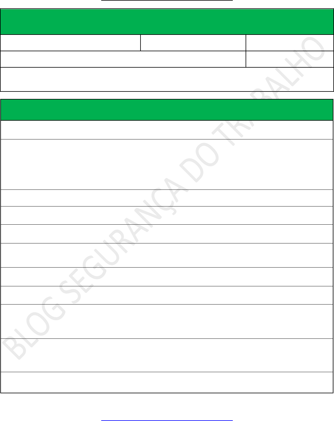 Blog segurança do Trabalho WWW.BLOGSEGURANCADOTRABALHO.COM.BR WWW.BLOGSEGURANCADOTRABALHO.COM.BR PERMISSÃO DE TRABALHO – PT Fábrica: Setor: Máquina ou Local: Solicitante: Escopo: Funcionários envolvidos: PROCEDIMENTO 1. Todos os trabalhos de manutenção, reforma, ampliação realizados pela Manutenção da (nome da empresa) e terceiros, necessitam de uma "Permissão de Trabalho - PT", formal para realização dos trabalhos nas suas respectivas áreas. 2. A emissão da "Permissão de Trabalho - PT" será obtida após a realização de uma "Análise de Riscos do Trabalho - ART" - para avaliação dos riscos potenciais envolvidos, bem como as medidas de controle a serem aplicadas, devendo participar , no mínimo, as seguintes pessoas: - Supervisor da Área onde será executado o serviço; - Responsável pelo Trabalhos ( Engenharia, Manutenção, Meio Ambiente, Produção); - Supervisão da empresa Contratada; - Técnico de Segurança da (nome da empresa) ou empresa contratada quando houver. 3- Na ART deverá ser avaliado e garantido o atendimento aos itens estabelecidos, antes da emissão da "Permissão de Trabalho - PT", obtendo as respectivas assinaturas das pessoas acima. 4- A validade da " Permissão de trabalho - PT" deverá ser definida pela equipe emitente, por no máximo 5 dias, podendo ser revalidada todo dia formalmente pela equipe por mais 2 vezes no mesmo formulário. 5- Os emitentes, Cipeiros e Brigadistas deverão realizar inspeções nas frentes de trabalho, em períodos diferentes e anotar data e hora da inspeções e paralisar os trabalhos casos encontre alguma não conformidade em relação ao estabelecidos na ART ou outra que possam gerar riscos de acidentes. 6- Ocorrendo a paralisação dos trabalhos por motivos de não conformidade a "Permissão de Trabalho" poderá ser retirada e cancelada, sendo necessário a abertura de outra ART e Permissão de Trabalho. O Reinicio dos trabalhos somente poderá ocorrer após a solução da não conformidade e autorizados dos emitentes da nova ART e PT. 7- Caso haja mudança de escopo de trabalho ou alguma nova atividade não contemplada pela ART em que não foram analisada as medidas de eliminação/ controle dos riscos, a PT e ART vigentes deverão ser automaticamente cancelados e uma nova ART e PT deverá ser aberta. 8- Após o termino dos trabalhos, a supervisão executante deverá encaminhar para o depto de segurança a ART e PT para arquivamento por um período de 6 meses. 9- As recomendações estabelecidas no formulário da ART são básicas, para permitir o início dos trabalhos que, em função da sua natureza e complexidade poderá ser acrescida de novos riscos potencias. Este modelo de formulário serve apenas como orientação básica, e não como levantamento único de todos os riscos presentes na frente de trabalho e auxiliará a identificação de controles complementares de riscos não identificados a serem implantados paralelamente aos aqui recomendados, de modo a garantir um ambiente de trabalho livre de incidentes. 10 - As recomendações estabelecidas no formulário da ART são obrigatório quando a resposta for sim a pergunta da ART, quando não aplicável marcar no quadros respectivos. Se houver algum item não conforme o serviço não deverá ser liberada até a devida adequação do item não conforme. Portanto, o responsável pela supervisão dos trabalhos deverão providenciar a adequação de todos os itens aplicáveis ao trabalho para posterior acionamento os responsáveis pela liberação da permissão de trabalho. Blog segurança do Trabalho WWW.BLOGSEGURANCADOTRABALHO.COM.BR WWW.BLOGSEGURANCADOTRABALHO.COM.BR INSPEÇÃO DOS EMITENTES DA PERMISSÃO NOME DO INSPETOR DATA HORÁRIO ASSINATURA INSPEÇÃO DA CIPA E/OU BRIGADA DE EMERGÊNCIA NOME DO INSPETOR DATA HORÁRIO ASSINATURA