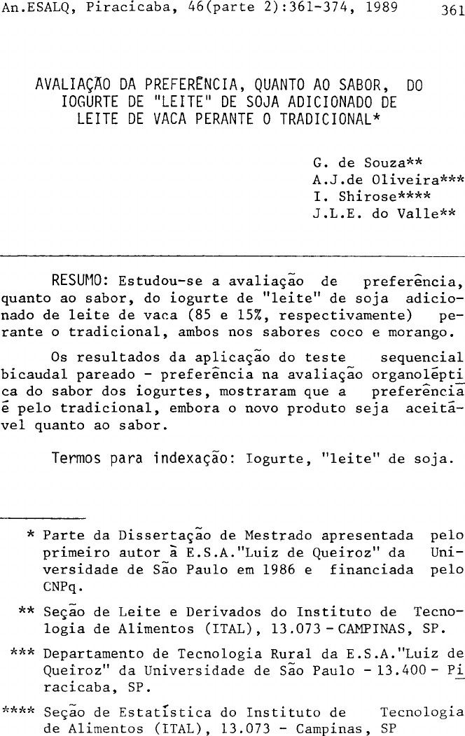 AVALIAÇÃO DA PREFERÊNCIA, QUANTO AO SABOR, DO IOGURTE DE "LEITE" DE SOJA ADICIONADO DE LEITE DE VACA PERANTE O TRADICIONAL* G. de Souza** A.J.de Oliveira*** I. Shirose**** J.L.E. do Valle** RESUMO: Estudou-se a avaliação de preferência, quanto ao sabor, do iogurte de "leite" de soja adicio nado de leite de vaca (85 e 15%, respectivamente) pe rante o tradicional, ambos nos sabores coco e morango. Os resultados da aplicação do teste sequencial bicaudal pareado - preferência na avaliação organolepti¬ ca do sabor dos iogurtes, mostraram que a preferência ê pelo tradicional, embora o novo produto seja aceitá vel quanto ao sabor. Termos para indexação: Iogurte, "leite" de soja. * Parte da Dissertação de Mestrado apresentada pelo primeiro autor à E.S.A."Luiz de Queiroz" da Uni versidade de São Paulo em 1986 e financiada pelo CNPq. ** Seção de Leite e Derivados do Instituto de Tecno logia de Alimentos (ITAL), 13.073 - CAMPINAS, SP. *** Departamento de Tecnologia Rural da E.S.A."Luiz de Queiroz" da Universidade de Sao Paulo - 13.400 - Pi¬ racicaba, SP. **** Seção de Estatística do Instituto de Tecnologia de Alimentos (ITAL), 13.073 - Campinas, SP EVALUATION OF THE FLAVOR PREFERENCE OF THE SOYBEAN MILK YOGHURT ADDED OF COW'S MILK CONFRONTED WITH THE TRADITIONAL ABSTRACT: A test was made to evaluate flavor preference between cow milk added soybean milk yoghurt (85 and 15% respectively), and traditional yoghurt. The results of the application of the sequential two-sided paired preference comparison test in the organoleptic evaluation of the flavor of the yoghurts showed that the preference is for the traditional yoghurt, not with standing the acceptable flavor of the new product. Index terms: Yoghurt, soybean milk. INTRODUÇÃO O iogurte de "leite" de soja adicionado de leite de vaca ê um produto resultante da fermentação da mis tura de "leite" de soja e leite de vaca pelas bactérias lácticas Streptococcus th.ermoph.ilus e Lactobacillus bulgaricus (STANIER et alii, 1976; SUGIMOTO et alii, 1981). Este produto destaca-se por ser excelente fonte de proteína de õtima qualidade para alimentação humana, de fãcil digestibilidade, de características organo- lépticas agradáveis ao paladar e de reduzidos índices de colesterol, gorduras saturadas e lactose (SUGIMOTO et alii, 1981). No seu processo de fabricação, a adição de leite de vaca ao "leite" de soja estimula o crescimento e pro duçao de ácido lãctico pelas bactérias lácticas, prin cipalmente o Lactobacillus bulgaricus, aumenta o valor http://th.ermoph.ilus nutritivo e melhora o seu sabor, aroma, acidez, consis tência e textura (MOON & REINBOLD, 1976); PINTHONG et alii, 1980; STEINBERG, 1979; SUGIMOTO et alii, 1981). Estudo anterior (SOUZA et alii, 1989) mostrou que o iogurte de "leite" de soja adicionado de leite de va ca (85 e 15%, respectivamente) e aceitável no sabor na tural e que adicionado de frutas e essências, sua acei tabilidade I maior. Supoe-se que em termos de sabor, o iogurte tra dicional (leite de vaca) seja o mais preferido, mas es ta hipótese precisa ser refutada ou nao experimental mente. Dessa forma, o objetivo desse trabalho foi o de avaliar a preferência deste novo produto, quanto ao sa bor, perante o tradicional, ambos nos sabores morango e coco. Escolheu-se estes sabores por serem os mais comuns no mercado e da preferência da maioria dos con sumidores . MATERIAL E MÉTODOS Foram utilizadas as seguintes matérias-primas: 1. "Leite" de soja produzido no Instituto de Tec nologia de Alimentos (ITAL); 2. Leite pasteurizado tipo B; 3. Polpa de morango com 60% de açúcares totais e PH 3,4; 4. "Leite" de coco concentrado com pH 5,7 e 42% de gordura; 5. Corante bordeaux S em solução 5%; 6. Leite em pó integral; 7. Açúcar cristal; 8. Maisena; 9. Essência de coco; 10. Essência de morango; 11. Cultura lãctica para iogurte, mista de Strepto coccus thermophilus + Lactobacillus bulgaricus com 80°D (graus Dornic) de acidez e pH 4,2 per_ tecente ã coleção de culturas lãcticas da Seção de Leite e Derivados do ITAL. As formulações do iogurte de "leite" de soja adi cionado de leite de vaca e do tradicional encontram-se na Tabela 1 e o fluxograma da obtenção dos mesmos na Fi gura 1. 0 procedimento da obtenção do produto encontra- se descrito em SOUZA et alii (1988). Os produtos (iogurte tradicional e iogurte de "leite" de soja) foram preparados na véspera da avalia ção organoléptica e mantidos sob refrigeração entre 4 e 6°C. Para avaliar a preferencia do sabor do iogurte de "leite" de soja adicionado de leite, de vaca perante o tradicional, ambos com polpa de morango ou leite de co co, conduziu-se o experimento organoléptico pareado preferencia, utilizando-se o teste seqüencial bicaudal de Wald (STEINER, 1966) com os seguintes parâmetros P Q = -j (nao há preferência entre o iogurte de "leite" de soja adicionado de leite de vaca e o tradi cional) ; 3 . . p^ = (iogurte tradicional mais preferido que o iogur te de "leite" de soja adicionado de leite de va ca); P2 = (iogurte de "leite" de soja adicionado de leite de vaca mais preferido que o iogurte tradicio nal) ; e os riscos: = 0,025 = probabilidade de dizer que o iogurte de "leite" de soja adicionado de leite de va ca ê mais preferido que o iogurte tradi cional, quando na verdade, nao existe pre ferência entre eles; = 0,025 - probabilidade de dizer que o iogurte tra dicional ê mais preferido que o iogurte de "leite" de soja, quando na verdade, nao existe preferência entre eles; (3^ = 0,05 - probabilidade de dizer que nao existe pre ferência entre o iogurte de "leite" de soja adicionado de leite de vaca e o tradicional, quando na verdade, o iogurte de "leite" de soja é mais preferido que o tradicional; 02 = 0,05 - probabilidade de dizer que nao existe pre ferência entre o iogurte de "leite" de soja adicionado de leite de vaca e o tradicional, quando na verdade, o tradicional i o mais preferido. 0 teste seqüe