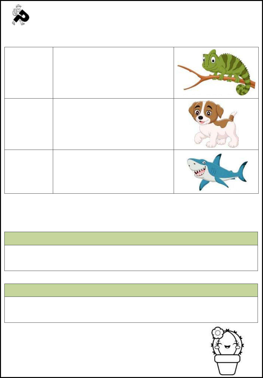 ATIVIDADES DE LÍNGUA PORTUGUESA CADERNO DE CALIGRAFIA 1 - Escreva o texto no caderno de caligrafia e realize a atividade proposta. CAMALEÃO Ele muda de cor com o auxílio de pigmentos presentes nas células de sua pele, isto é, o que chamamos de “mimetismo”. CÃO Por ter uma visão apurada, percebe mudanças de movimentos de uma pessoa assustada, assim, quando ela foge, ele pode perceber uma presa fácil. TUBARÃO Os estudiosos acreditam que os primeiros tubarões surgiram há mais ou menos 300 milhões de anos. 2 - Agora selecione os verbos contidos no texto acima e copie nas tabelas abaixo de acordo com os tempos verbais em que eles estão conjugados. PASSADO PRESENTE Realize as atividades com carinho e dedicação! Beijinhos, Marília.