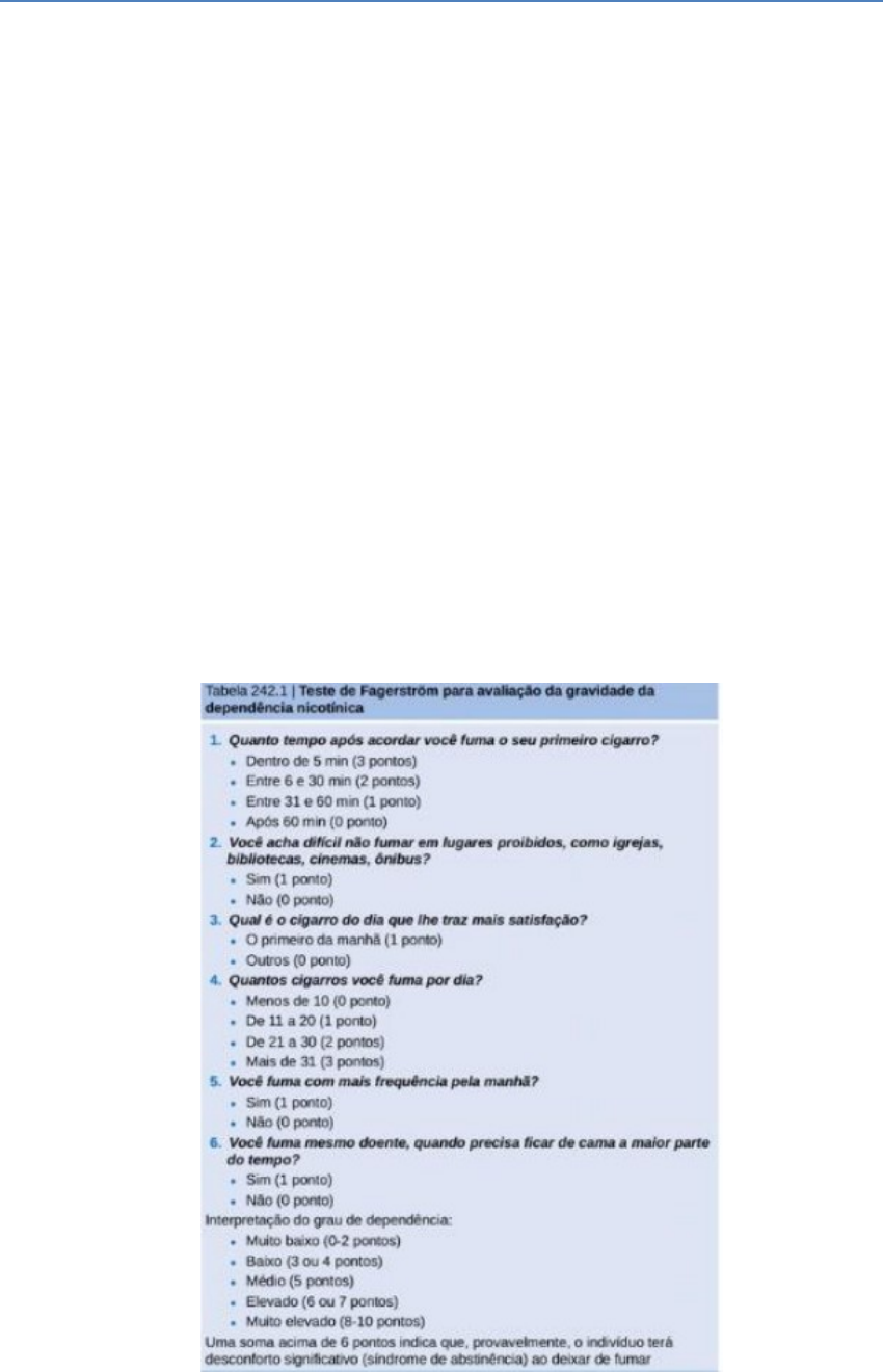 Doenças como Fator de Risco o Tabagismo · Vários tipos de câncer. · Doenças do aparelho respiratório (enfisema pulmonar, bronquite crônica, asma e infecções respiratórias). · Doenças cardiovasculares (angina, IAM, HAS, aneurismas, AVC e trombose) · Há ainda outras doenças relacionadas ao tabagismo: úlcera do aparelho digestivo, osteoporose, catarata, patologias buco-dentais, impotência sexual no home, infertilidade na mulher, menopausa precoce e complicações na gravidez · Morbimortalidade relacionada ao tabaco: o tabagismo é o principal responsável por quase: · 100% das mortes por câncer de pulmão. 30% das mortes por outros tipos de câncer. 85% dos óbitos por bronquite crônica e enfisema pulmonar. 25% dos óbitos por doenças cerebrovasculares. 45% das mortes por IAM · Câncer e Tabagismo: Leucemia mieloide aguda. Câncer de bexiga. Câncer de pâncreas. Câncer de fígado. Câncer de colo de útero. Câncer de esôfago. Câncer nos rins. Câncer de laringe. Câncer de pulmão. Câncer de cavidade oral e Câncer de estômago. · Abordagem: Centrada na pessoa. Estabelecer maior empatia possível. Avaliar a relação com o tabagismo. Avaliar transtornos de ansiedade associados. Avaliar o grau de dependência da nicotina (Fargestrom). Avaliação a motivação da pessoa em parar de fumar Teste de Fagerstrom: · Fases de Mudança dos Pacientes Tabagistas: Pré-contemplação. Contemplação. Preparação. Ação e Manutenção Entrevista Motivacional · Benefícios de Parar de Fumar: · Após 20 minutos: a pressão sanguínea e a pulsação voltam ao normal. · Após 2 horas: não há mais nicotina circulando no sangue. · Após 8 horas: o nível de oxigênio no sangue se normaliza. · Após 12-24 horas: os pulmões já funcionam melhor. · Após 2 dias: o olfato já percebe melhor os cheiros e o paladar já degusta melhor a comida. · Após 3 semanas: a respiração se torna mais fácil e a circulação melhora. · Após 1 anos: o risco de morte por IAM é reduzido à metade. · Após 10 anos: o risco de sofrer infarto será igual ao das pessoas que nunca fumaram Dinâmica de Grupo · Tempo de duração: cerca de 2 meses · 1º mês: grupos semanais · 2º mês: grupos quinzenais · Cada sessão dura em média 30 minutos. Máximo de 12 pessoas. · Troca experiências, motivação, partilha de ganhos, mas também perdas. · Cuidado com as características pessoas de cada pessoa · Primeiro encontro: Utilizar a característica do encontro em conjunto para motivar a troca de experiência, como motivos para parar de fumar, pontos negativos do tabagismo. · Explicar o real motivo da nicotina causar dependência. Evitar gatilhos · Orientar sobre percalços – fissuras, síndrome de abstinência. Explicar a terapia farmacológica. · Marca o dia D · Próximos encontros: Empatia. Metas alcançáveis e atingíveis. Parabenizar progressos. Desestimular gatilhos · Saber sempre do reforço positivo: mudança de hábitos, reconhecimento familiar · Acompanhar evolução de cada um, em que etapa esta. Abordagem individual Tratamento Farmacológico · Quando usar: · Fumantes moderados, ou seja, que fumam 20 cigarros por dia. · Fumantes que fumam o primeiro cigarro até 30 minutos após acordar e fumam, no mínimo, 10 cigarros por dia. · Fumantes com score do teste de Fargerstrom igual ou maior do que 5, ou avaliação individual, a critério do profissional. · Fumantes que já tentaram para de fumar apenas com TCC. · Fumantes que não possuem contraindicações clínicas. · Decisão a critério profissional · Reposição de nicotina: · Goma de mascar: 2-4 mg. Média de 8-12 mg dia. Máximo: 24 mg/dia. 20-30 minutos de ação. · Pastilha: 2-4 mg. Mínimo: 9mg/dia. Máximo: 15 mg/dia. Mais rapidamente absorvidas. · Adesivos Trandérmicos: 7,14 e 21 mg. Coincidir com o dia D · Bupropiona: Antidepressivo atípico, inibe a receptação de dopamina e noroepinefrina. Fármaco de 1ª escolha. Redução da compulsão de fumar. Disponível na dose de 150mg · Posologia: iniciar com 150 mg até o dia 3 aumentar para 300 mg em duas tomadas a partir do 4º dia. · Usar por no máximo semanas. Programar com relação ao dia D, não iniciar no dia. · Efeitos adversos: sensação de boca seca e insônia (por isso não dar a noite), cefaleia, tontura e aumento da PA · Vareniclina: Agonista parcial de receptores nicotínicos · Posologia: 1 comprimido de 0,5 mg 1 vez ao dia (1º - 3º dia). 1 comprimido de 0,5 mg de 12 em 12 horas do quarto ao 7º dia. 1 comprimido de 1mh de 12 em 12 horas a partir do 8º dia até o final do tratamento. · A pessoa deve programar o dia D uma semana após o início da varenciclina. Recomenda-se o uso por 12 semanas · Efeitos colaterais: náuseas · Prognóstico: Recaída frequente principalmente nas primeiras 2 semanas após a cessação. A maioria precisa de diversas tentativas. Diferenciar lapso de recaída. Ganho de peso – 2 a 4 kg em 6 meses, devido a redução do metabolismo, piora da ansiedade, redução da atividade física, aumento da ingesta calórica, necessidade manipular as mãos com alguma coisa image1.png image2.png