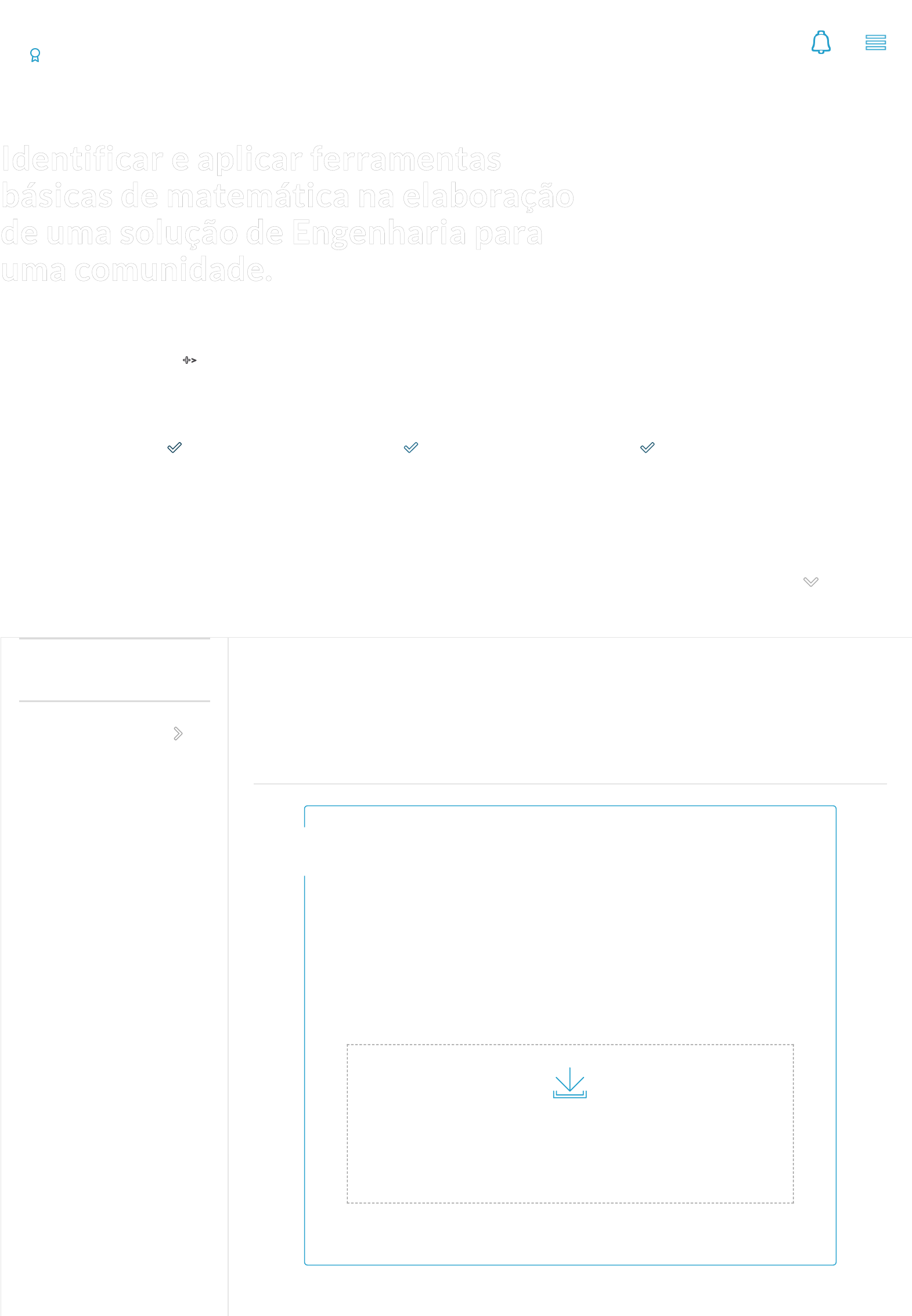 06/07/2023, 20:23 Liga Online https://app.ligaeducacional.com.br/projeto/14828/fase/55709 1/5 AT I V I D A D E S AVA L I A Ç Ã O Avaliação Envio de Arquivo Tipo de avaliação: Arquivo Número de tentativas: 2 Gravar um vídeo de no máximo 5 minutos que apresente os resultados encontrados por você, de forma consolidada e concisa. Arraste aqui seus arquivos! Ou clique para procurar. O limite do upload é de 3 arquivo(s) Identificar e aplicar ferramentasIdentificar e aplicar ferramentas básicas de matemática na elaboraçãobásicas de matemática na elaboração de uma solução de Engenharia parade uma solução de Engenharia para uma comunidade.uma comunidade. MATEMÁTICA APLICADA À ENGENHARIA E N T E N D A S E U P R O J E T O >> FASE 1 E N T R E G A 2 0 / 0 5 / 2 0 2 3 FASE 2 E N T R E G A 1 0 / 0 6 / 2 0 2 3 FASE 3 E N T R E G A 0 7 / 0 7 / 2 0 2 3 ENTREGA FINAL E N T R E G A 1 1 / 0 7 / 2 0 2 3 PROJETO CALENDÁRIO INTERAÇÕESRafael de Lima Campos 06/07/2023, 20:23 Liga Online https://app.ligaeducacional.com.br/projeto/14828/fase/55709 2/5 Quiz nota 2 Tipo de avaliação: Quiz Número de tentativas: 2 Tentativas usadas: 1 Tentativa 01 Nota 2 entregue em 06/07/23 às 20:21 Gabarito Pergunta Determinada turbina geradora de energia leva aproximadamente 10 minutos para atingir potência (energia por tempo, P) plena e constante. A partir deste momento, qual a derivada da potência, em relação ao tempo sen(t) T P^t ZERO ln(t) Pergunta É possível modelar como a concentração de determinado poluente ambiental decai, conforme se afasta da fonte poluidora, por meio da função 1/X. Sabendo disso, o somatório das concentrações, ao longo da distância X é uma função: 1º grau Exponencial Senoidal Logarítmica 2º grau 8 PROJETO CALENDÁRIO INTERAÇÕESRafael de Lima Campos 06/07/2023, 20:23 Liga Online https://app.ligaeducacional.com.br/projeto/14828/fase/55709 3/5 Pergunta Sabe-se que, pelo limite fundamental de sen(x)/x = 1, para valores de x próximos a zero, é possível simpli�car os cálculos físicos para pequenas oscilações. De fato, é satisfatório substituir sen(x) por x, para ângulos menores que 20° (0,35 rad). Sendo assim, aplicar aproximação para o termo g.sen(x), da equação do pêndulo, onde g é a constante gravitacional, torna este termo em uma: Função de 3º grau Função Trigonométrica Função de 1º grau Função Logarítmica Função Exponencial Pergunta A derivada representa uma taxa de variação, no limite em que a variação da variável independente tende a zero. Vejamos o caso: você percorre determinada distância (X) em certo tempo (t). Neste caso, a velocidade pode ser de�nida como dX/dt. Assim, ao observar a velocidade em intervalos de tempos pequenos, nos aproximamos do conceito de velocidade instantânea. Assim, pode-se a�rmar que: A velocidade instantânea é uma representação física da derivação. O quadrado da velocidade instantânea é uma representação física da derivação. O dobro da velocidade instantânea é uma representação física da derivação. A velocidade instantânea não se aplica ao conceito derivação. A metade da velocidade instantânea é uma representação física da derivação. Pergunta O estoque de determinada mercadoria (M), em um centro de distribuição pode ser de�nido como o balanço da quantidade existente (Mo), do �uxo de entrada de novas unidades (E) e do �uxo de saída, para entrega aos consumidores (S). Ou seja: M = Mo + E – S. Sabendo que Mo é uma constante, que E pode ser de�nido por E(t) = a.ln(b.t) e que S segue a função S(t) = c.sen(w.t), a taxa de variação da quantidade de mercadoria no tempo é: a.b/ln(bt) + c.w.cos(wt) a.b/ln(bt) + c.w.cos(wt) a.b/ln(bt) – c.w.cos(wt) b.ln(bt) – w.cos(wt) PROJETO CALENDÁRIO INTERAÇÕESRafael de Lima Campos 06/07/2023, 20:23 Liga Online https://app.ligaeducacional.com.br/projeto/14828/fase/55709 4/5 a.b.ln(bt) + c.w.cos(wt) Pergunta Determinado organismo unicelular se multiplica de tal forma, que sua população dobra a cada minuto. Em um experimento laboratorial, no tempo t=0 foram colocar 2 indivíduos sob o microscópio. Depois de 5 minutos, quantos organismo devem existir nesta amostra, e qual a função que melhor descreve o crescimento da população, neste experimento. 32, exp(X) 32, ln(2).exp(2X) 64, exp(X.ln(2)) 64, 2.exp(X.ln(2)) 16, exp(X) Pergunta Um computador é capaz de realizar uma quantidade enorme de cálculo por segundo. Com o passar das gerações de processadores, esta capacidade aumenta. Se utilizarmos este conceito é possível acreditar que a cada nova geração de processadores: Não importa a geração de processadores, eles sempre calculam com exatidão a integral para qualquer função. Os processadores das novas gerações têm os mesmos resultados das integrais, quando eles realizam a soma de seus termos, para um mesmo intervalo de tempo, quando comparada a geração anterior. Os processadores das novas gerações são capazes de aproximações melhores, nos resultados das integrais, quando os mesmo realiza a soma de seus termos, para um mesmo intervalo de tempo, quando comparada a geração anterior. Computadores não são capazes de realizar integrações. Os processadores das novas gerações têm aproximações piores, nos resultados das integrais, quando estes realizam a soma de seus termos, para um mesmo intervalo de tempo, quando comparada a geração anterior. Pergunta Durante todo tempo, diversos corpos celestes se aproximam e se afastam de nosso planeta. A observação da trajetória dos mesmos é importante para estudar potenciais perigos as sociedades humanas. Suponha que, nas proximidades do planeta um destes corpos celestes tenha sua trajetória descrita como X = at²+bt+c, onde X é a distância do mesmo com a Terra, e t é o tempo a partir do momento em que o corpo foi detectado. Na fórmula, considere a positivo (a > 0). É possível dizer que: A trajetória tem um ponto de