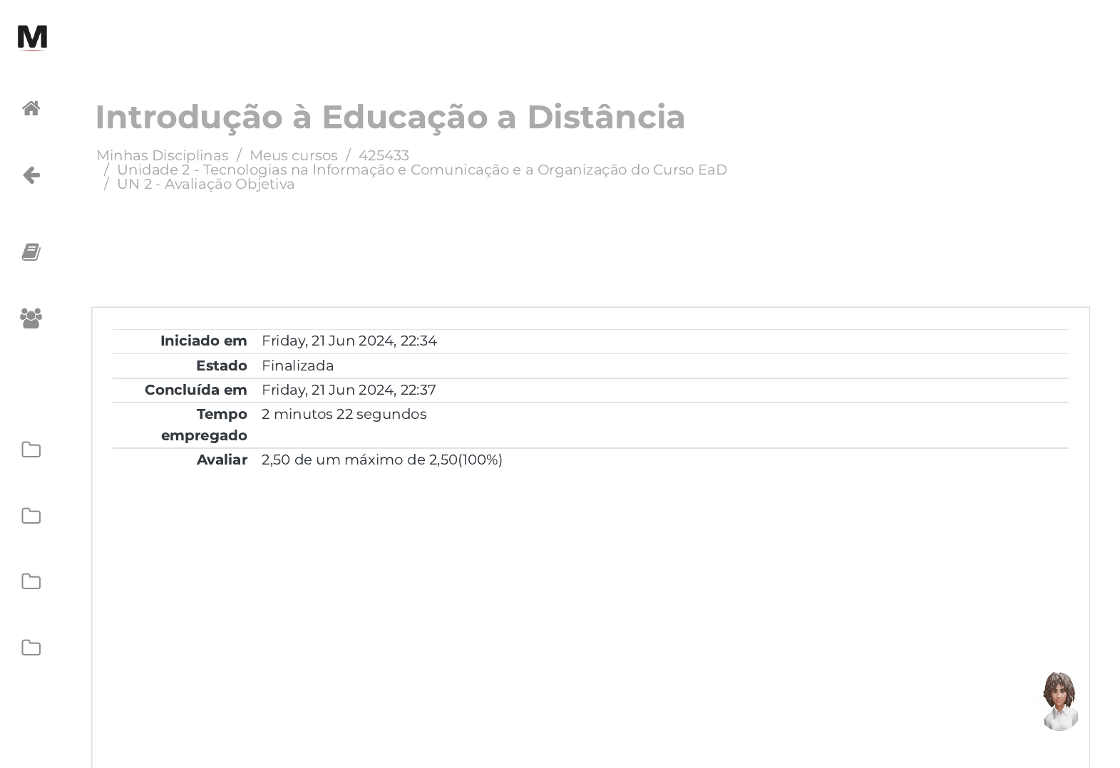 Minhas Disciplinas / Meus cursos / 425433 / Unidade 2 - Tecnologias na Informação e Comunicação e a Organização do Curso EaD / UN 2 - Avaliação Objetiva Introdução à Educação a Distância Iniciado em Friday, 21 Jun 2024, 22:34 Estado Finalizada Concluída em Friday, 21 Jun 2024, 22:37 Tempo empregado 2 minutos 22 segundos Avaliar 2,50 de um máximo de 2,50(100%) https://avap.multivix.edu.br/my/ https://avap.multivix.edu.br/course/view.php?id=24755 https://avap.multivix.edu.br/course/view.php?id=24755§ion=4 https://avap.multivix.edu.br/mod/quiz/view.php?id=1578148 https://avap.multivix.edu.br/my/ https://avap.multivix.edu.br/course/view.php?id=24755 https://avap.multivix.edu.br/user/index.php?id=24755 https://avap.multivix.edu.br/course/view.php?id=24755§ion=1 https://avap.multivix.edu.br/course/view.php?id=24755§ion=2 https://avap.multivix.edu.br/course/view.php?id=24755§ion=3 https://avap.multivix.edu.br/course/view.php?id=24755§ion=4 https://avap.multivix.edu.br/course/view.php?id=24755§ion=5 https://avap.multivix.edu.br/course/view.php?id=24755§ion=6 https://avap.multivix.edu.br/ https://avap.multivix.edu.br/ https://avap.multivix.edu.br/ https://avap.multivix.edu.br/ https://avap.multivix.edu.br/ https://avap.multivix.edu.br/ https://avap.multivix.edu.br/ https://avap.multivix.edu.br/ Questão 1 Correto Atingiu 0,50 de 0,50 Os critérios de avaliação empregados no Ensino a Distância Multivix são: I. Para os 1° e 2° períodos, o aluno deve obter no mínimo 6,00 pontos, para ser aprovado; II. A partir do 3º período, a pontuação mínima para aprovação são 7,00 pontos; III. Para os 1º e 2º períodos, o aluno não possui Avaliação Final, sendo possível somente a partir do 3º período; IV. O aluno que cursa o 1º ou 2º período, poderá realizar sua Prova Final, sem data prevista, ou seja, na data e horário que preferir; V. Independente do período, o pontuação mínima para aprovação são 7,00 pontos. Escolha uma opção: a. IV e V b. II e III c. III e IV d. I e II e. I e V https://avap.multivix.edu.br/ https://avap.multivix.edu.br/ https://avap.multivix.edu.br/ https://avap.multivix.edu.br/ https://avap.multivix.edu.br/ https://avap.multivix.edu.br/ https://avap.multivix.edu.br/ https://avap.multivix.edu.br/ Questão 2 Correto Atingiu 0,50 de 0,50 Por várias gerações, o desenvolvimento tecnológico vem in�uenciando diretamente no avanço da Educação à Distância, de acordo com as gerações, assinale a alternativa correta: I. A primeira geração foi marcada pelo ensino por correspondência, onde os materiais eram enviados por e-mail; II. A segunda geração foi marcada pela comunicação televisivas, sendo possível acesso a materiais impressos. III. A terceira geração conhecida como analógica, possui veículos de comunicação como radiofônicas e/ou televisivas. IV. A quarta geração foi marcada pela internet e uso de computador, sendo possível a comunicação que ocorre no EAD, por atendimento síncrono e assíncrono. V. A quinta geração ainda vigente, é marcada nos dias de hoje pela internet, web e aprendizagem �exível. Escolha uma opção: a. I, II e III b. III, IV e V c. I, IV e V d. II, III e IV e. II, IV e V https://avap.multivix.edu.br/ https://avap.multivix.edu.br/ https://avap.multivix.edu.br/ https://avap.multivix.edu.br/ https://avap.multivix.edu.br/ https://avap.multivix.edu.br/ https://avap.multivix.edu.br/ https://avap.multivix.edu.br/ Questão 3 Correto Atingiu 0,50 de 0,50 A comunicação acelerada é uma das características mais marcantes da sociedade em que vivemos atualmente, com todo o avanço tecnológico e mudanças nos usos de tecnologias de informação e comunicação. O envio e recebimento de mensagens, materiais hipertextuais, teleconferências, videoconferências, ferramenta de construção colaborativa de textos, interações síncronas ou assíncronas, todas estas são possibilidades deste novo jeito de nos comunicar, que é tão utilizado na EaD. A partir dessas novas ferramentas e tecnologias, algumas características passam a fazer parte do nosso dia a dia. Assinale a alternativa que apresenta uma dessas características: Escolha uma opção: a. O sincronismo em comunicação é tido como um tipo de comunicação que, ao ser disponibilizado, não ocorre apenas em um determinado período de tempo. b. A comunicação síncrona permite que todos os envolvidos na comunicação, sejam emissores, sejam receptores, recebam a mensagem em tempos diferentes. c. A comunicação bilateral na EaD pode ocorrer apenas entre tutor e aluno, sendo que o tutor é sempre o emissor e o aluno o receptor. d. A comunicação de massa possibilita que vários emissores compartilhem sua mensagem com um receptor apenas. e. A comunicação ocorre de forma unilateral, bidirecional ou de massa, e todos que têm acesso à internet conseguem realizar tais formas de comunicação. https://avap.multivix.edu.br/ https://avap.multivix.edu.br/ https://avap.multivix.edu.br/ https://avap.multivix.edu.br/ https://avap.multivix.edu.br/ https://avap.multivix.edu.br/ https://avap.multivix.edu.br/ https://avap.multivix.edu.br/ Questão 4 Correto Atingiu 0,50 de 0,50 Um dos principais pontos para a melhoria da vida em grupo é a comunicação, esta veio se tornando cada vez mais possível, graças ao avanço tecnológico e mudanças nos usos de tecnologias de informação e comunicação. Todas essas ferramentas são instrumentos que proporcionam que a Educação à Distância aconteça, de forma rápida, prática e acessível. Na Educação a Distância a comunicação acontece através de interações que ocorrem sem sincronia de tempo, assinale a alternativa correta: Escolha uma opção: a. Comunicação social b. Comunicação síncrona c. Comunicação assíncrona d. Expressões comunicacionais e. Comunicação dialógica https://avap.multivix.edu.br/ https://avap.multivix.edu.br/ https://avap.multivix.edu.br/ https://avap.multiv