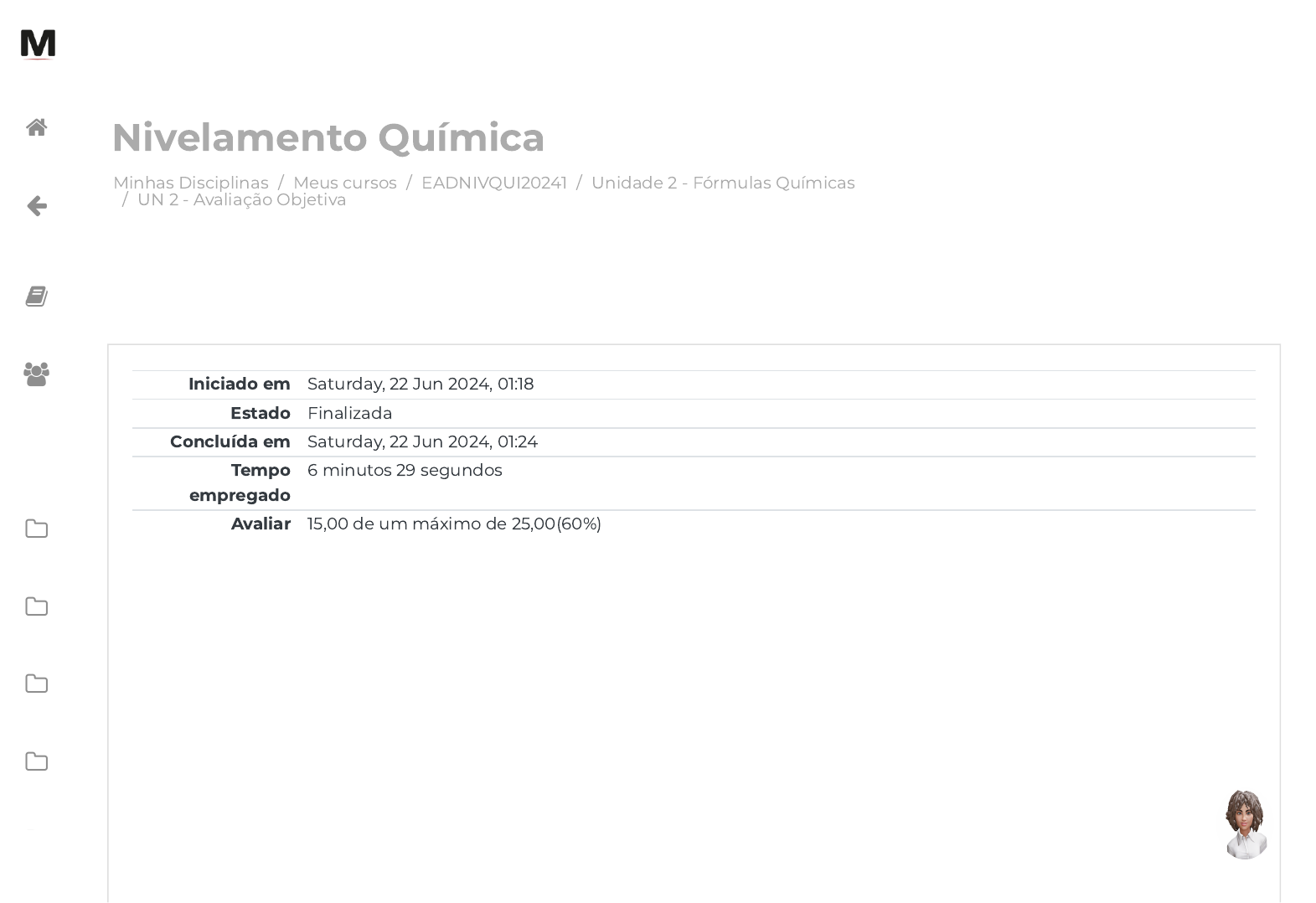 Minhas Disciplinas / Meus cursos / EADNIVQUI20241 / Unidade 2 - Fórmulas Químicas / UN 2 - Avaliação Objetiva Nivelamento Química Iniciado em Saturday, 22 Jun 2024, 01:18 Estado Finalizada Concluída em Saturday, 22 Jun 2024, 01:24 Tempo empregado 6 minutos 29 segundos Avaliar 15,00 de um máximo de 25,00(60%) https://avap.multivix.edu.br/my/ https://avap.multivix.edu.br/course/view.php?id=24754 https://avap.multivix.edu.br/course/view.php?id=24754§ion=3 https://avap.multivix.edu.br/mod/quiz/view.php?id=1578125 https://avap.multivix.edu.br/my/ https://avap.multivix.edu.br/course/view.php?id=24754 https://avap.multivix.edu.br/user/index.php?id=24754 https://avap.multivix.edu.br/course/view.php?id=24754§ion=1 https://avap.multivix.edu.br/course/view.php?id=24754§ion=2 https://avap.multivix.edu.br/course/view.php?id=24754§ion=3 https://avap.multivix.edu.br/course/view.php?id=24754§ion=4 https://avap.multivix.edu.br/course/view.php?id=24754§ion=5 https://avap.multivix.edu.br/course/view.php?id=24754§ion=6 https://avap.multivix.edu.br/ https://avap.multivix.edu.br/ https://avap.multivix.edu.br/ https://avap.multivix.edu.br/ https://avap.multivix.edu.br/ https://avap.multivix.edu.br/ Questão 1 Incorreto Atingiu 0,00 de 5,00 Abaixo estão relacionadas as fórmulas de cinco substâncias: I) CH4 II) C2H6 III) C3H6 IV) C4H8 V) C5H12 Quais substâncias têm a mesma fórmula empírica? Escolha uma opção: I, III, V. III, IV. I, V. I, II. II, V. https://avap.multivix.edu.br/ https://avap.multivix.edu.br/ https://avap.multivix.edu.br/ https://avap.multivix.edu.br/ https://avap.multivix.edu.br/ https://avap.multivix.edu.br/ Questão 2 Correto Atingiu 5,00 de 5,00 Questão 3 Correto Atingiu 5,00 de 5,00 Sabendo-se que o Nitrogênio faz parte da família 5A e o hidrogênio faz apenas 1 ligação. Qual a fórmula molecular do composto formado por estes dois elementos? Escolha uma opção: NH N H N H N3H N H 3 3 2 3 2 2 2 Sabendo-se que a fórmula molecular da Glicose é C H O , qual é sua fórmula empírica? Escolha uma opção: C H O CH O CHO CH O CH O 6 12 6 2 3 2 2 3 3 2 https://avap.multivix.edu.br/ https://avap.multivix.edu.br/ https://avap.multivix.edu.br/ https://avap.multivix.edu.br/ https://avap.multivix.edu.br/ https://avap.multivix.edu.br/ Questão 4 Correto Atingiu 5,00 de 5,00 Analise as a�rmativas abaixo e marque a alternativa CORRETA: Escolha uma opção: As fórmulas moleculares e empíricas são sinônimos, sendo iguais em todos os compostos. As fórmulas empíricas são as fórmulas verdadeira, que indicam exatamente o quanto de cada elemento estão na substância. As fórmulas empíricas são mais simples, escritas com maiores números inteiros possíveis. A fórmula molecular da água é H O e a fórmula empírica é HO. Para alguns compostos, principalmente os iônicos, a fórmula molecular e a fórmula empírica são a mesma. 2 https://avap.multivix.edu.br/ https://avap.multivix.edu.br/ https://avap.multivix.edu.br/ https://avap.multivix.edu.br/ https://avap.multivix.edu.br/ https://avap.multivix.edu.br/ Questão 5 Incorreto Atingiu 0,00 de 5,00 (FUVEST) Um composto submetido à decomposição produziu hidrogênio (H2) e silício (Si) na proporção, respectivamente, de 3,0 g para 28,0 g. No composto original, quantos átomos de hidrogênio estão combinados com um átomo de silício? Massas molares: H2 = 2,0 g/mol; Si = 28,0 g/mol. Escolha uma opção: 4 2 3 1 5 ◄ UN 1 - Avaliação Objetiva Seguir para... UN 3 - Avaliação Objetiva ► https://avap.multivix.edu.br/mod/quiz/view.php?id=1578124&forceview=1 https://avap.multivix.edu.br/mod/quiz/view.php?id=1578126&forceview=1 https://avap.multivix.edu.br/ https://avap.multivix.edu.br/ https://avap.multivix.edu.br/ https://avap.multivix.edu.br/ https://avap.multivix.edu.br/ https://avap.multivix.edu.br/