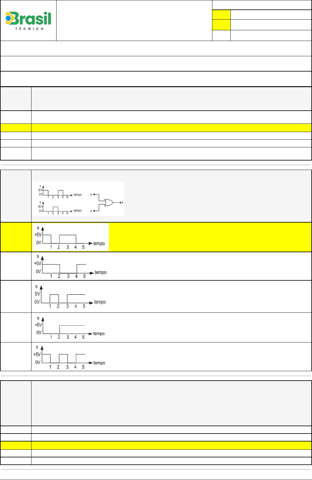 Pincel Atômico - 22/06/2024 11:44:45 1/2 Exercício Caminho do Conhecimento - Etapa 11 (22706) Atividade finalizada em 22/06/2024 11:44:32 (2100292 / 1) LEGENDA Resposta correta na questão # Resposta correta - Questão Anulada X Resposta selecionada pelo Aluno Disciplina: ELETRÔNICA [992746] - Avaliação com 4 questões, com o peso total de 13,00 pontos [capítulos - 113] Turma: Curso Técnico: Eletrotécnica - Grupo: BT EAD - 01/2024 - BT EAD ELE [108660] Aluno(a): 91557395 - EMANUEL JUNIO GOMES DE ALMEIDA - Respondeu 4 questões corretas, obtendo um total de 13,00 pontos como nota [349997_1461 38] Questão 001 Mapa de Karnaugh é um método de simplificação gráfico criado por Edward Veitch (1952) e aperfeiçoado pelo engenheiro de telecomunicações Maurice Karnaugh. Chamamos esse diagrama de mapa, visto este ser um mapeamento biunívoco a partir de uma tabela verdade da função que está a ser analisada. Sobre esse mapa, marque a opção CORRETA. O método de leitura por "mapa de Karnaugh" é considerado mais complicado que a "álgebra booleana", pois torna mais complexo o problema de erro nas simplificações. X Ele é utilizado para simplificar uma equação lógica ou para converter uma tabela verdade no seu circuito lógico correspondente. Os mapas de Karnaugh podem apresentar até no máximo 3 variáveis. Somente é implementado quando existem múltiplas entradas e múltiplas saídas, tornando mais simples a solução. Quanto maior o número de entradas no mapa de Karnaugh, mais simples e torna o método, já que fica mais fácil identificar as células adjacentes do mapa. [349998_1461 26] Questão 002 Um circuito eletrônico digital, representado na Figura abaixo, através de sua simbologia lógica equivalente, apresenta duas entradas (x e y) e uma saída (s) e trabalha com lógica positiva na qual a tensão mais positiva é atribuída como sendo o estado “1” lógico. Conhecendo−se a forma de onda dos sinais de entrada x e y, mostrados na mesma Figura, qual é a forma de onda do sinal de saída s? X [349997_1461 39] Questão 003 Analise as afirmativas abaixo. No que se refere ao uso dos Mapas de Karnaugh, para obtenção de funções lógicas a partir de tabelas-verdade, aplicam-se os seguintes princípios: I- A combinação de células que for selecionada deve incluir todas as células pelo menos uma vez. Uma célula pode participar de mais de uma combinação. If- As combinações devem ser selecionadas com a finalidade de incluir o maior número possível de células, de tal modo que todas as células sejam incluídas pelo menor número possfvel de combinações. lii- A característica essencial dos mapas de Karnaugh é que as células podem ser agrupadas horizontal, vertical e diagonalmente. Apenas a afirmativa li é falsa. Apenas a afirmativa I é falsa. X Apenas a afirmativa lii é falsa. Apenas as afirmativas I e lii são falsas. Apenas as afirmativas I e li são falsas.. Pincel Atômico - 22/06/2024 11:44:45 2/2 [349997_1461 31] Questão 004 Analise as afirmativas identificando com “V" as VERDADEIRAS e com “F" as FALSAS assinalando a seguir a alternativa CORRETA, na sequência de cima para baixo: ( ) Um decodificador é um dispositivo cuja saída será ativada apenas quando uma única combinação binária (código correto) estiver presente em suas entradas. ( ) Contadores atuam como chaves controladas digitalmente que selecionam e conectam uma entrada lógica de cada vez ao pino de saída. Muitos sinais de dados diferentes podem compartilhar a mesma via de dados. ( ) Em sistemas digitais, muitos dispositivos têm de compartilhar a via de dados, que costuma ser denominada barramento de dados. ( ) Circuitos osciladores possuem diversas aplicações em sistemas digitais, dentre elas estão seleção de dados, roteamento de dados, sequenciamento de operações, conversões paralelo-série, geração de formas de onda e geração de funções lógicas. X V-F-F-V F-F-V-V F-V-F-F V-V-V-F V-F-V-F