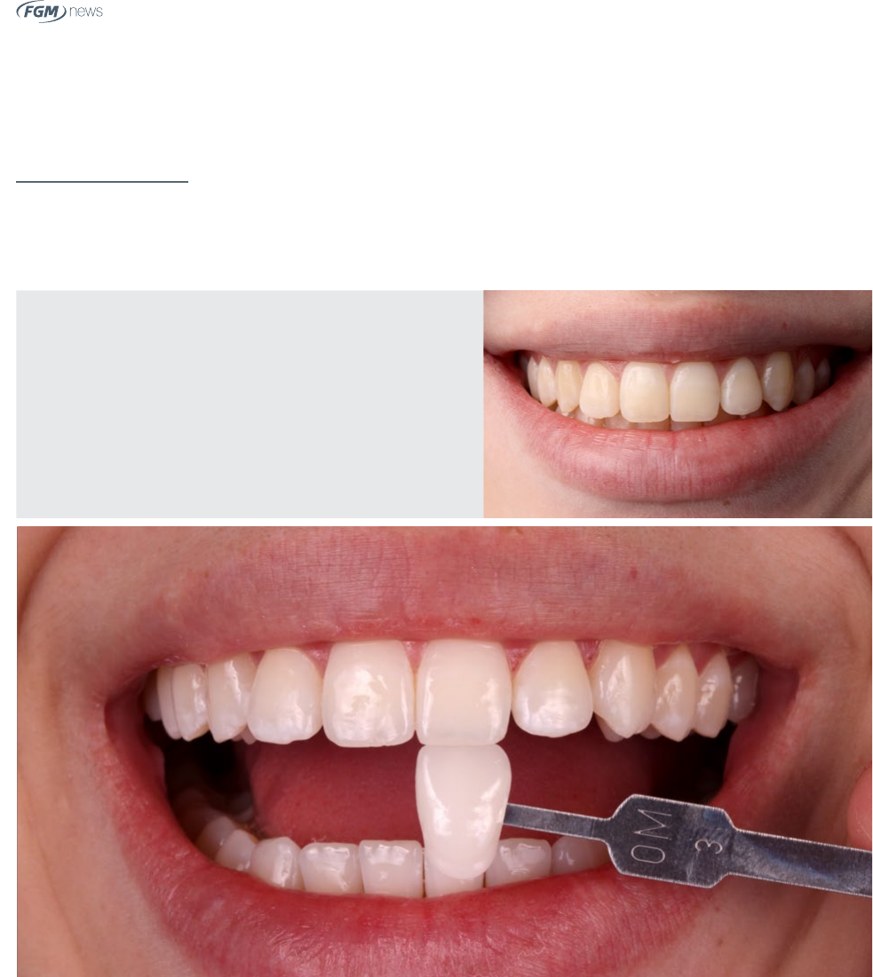 VOLUME 19 | FGM NEWS24 A QUEIXA Paciente do sexo feminino, 23 anos. Dentes amarelados. Clareamento em consultório: protocolo simples e confortável favorecendo a estética do sorriso AUTORES: Dr. Bruno Lippmann e Dra. Rafaella Ronchi Zinelli Inicial Final O EXAME CLÍNICO/RADIOGRÁFICO Dentes vitais saudáveis mostrando coloração inicial próxima ao A3 e A3,5. O TRATAMENTO Optou-se por realizar 3 sessões de clareamento ambulatorial, sem associação com géis caseiros. Em cada consulta o gel foi aplicado 3x de 15 minutos cada, e o intervalo entre sessões foi de 7 dias. VOLUME 19 | FGM NEWS 25 1 a 3. Fotos iniciais de sorriso e intrabucal. 4 e 5. Tomada de cor com escala Vita Classical, similar a A3 e A3,5 para caninos. 6. Profilaxia para remoção da placa. 7. Aplicação de Desensibilize KF2% (FGM) durante 10 minutos para redução da hipersensibilidade ao clareamento. 8. Aplicação da barreira gengival Top dam(FGM) recobrindo a margem gengival e 0,5mm da superfície dental. 2 3 PASSO A PASSO: 4 5 1 6 7 8 VOLUME 19 | FGM NEWS26 Dra. Rafaella Ronchi Zinelli“ “ A técnica de consultório provê excelentes resultados e pode ser conduzida de maneira segura e confortável para o paciente. Um aliado interessante do clareamento ambulatorial é o dessensibilizante em gel, que é capaz de reduzir a hipersensibilidade inerente ao clareamento sem diminuir sua eficácia. 9 e 10. Preparo do gel clareador Whiteness HP (FGM), misturando peróxido e espessante na proporção 3:1. A mistura deve ser homogeneizada durante 40 segundos para obtenção da viscosidade de gel adequada para aplicação. 9 10 11 a 14. O gel deve ser aplicado de modo a cobrir a superfície vestibular dos dentes em uma fina camada. Ao longo da aplicação, o gel muda de cor (vermelho para incolor) indicando o progresso da reação química. A aplicação do gel deve ser de 15 minutos, quando então este deve ser removido com sugador cirúrgico. Em uma sessão, sugere-se aplicar 3x de 15 minutos. 11 12 13 14 VOLUME 19 | FGM NEWS 27 15. Após a remoção completa do gel com sugador e jatos de ar/água, remove-se o Top dam(FGM). 16. Para concluir a sessão, faz-se o polimento com pasta diamantada Diamond Excel (FGM) e disco de feltro Diamond (FGM). 17 a 19. Resultado final após 3 sessões, mostrando cor dos dentes similar a 0M3 (mais claro que B1). 15 16 MATERIAIS FGM UTILIZADOS PERÓXIDO DE HIDROGÊNIO PARA CLAREAMENTO EM CONSULTÓRIO DESSENSIBILIZANTE PARA CLAREAMENTO EM CONSULTÓRIO AFASTADOR LABIAL PASTA DE POLIMENTO DIAMANTADA DISCO DE FELTRO Whiteness HP Desensibilize KF2% Arcflex Diamond Excel Diamond 17 18 19 BARREIRA GENGIVAL FOTOPOLIMERIZÁVEL Top dam