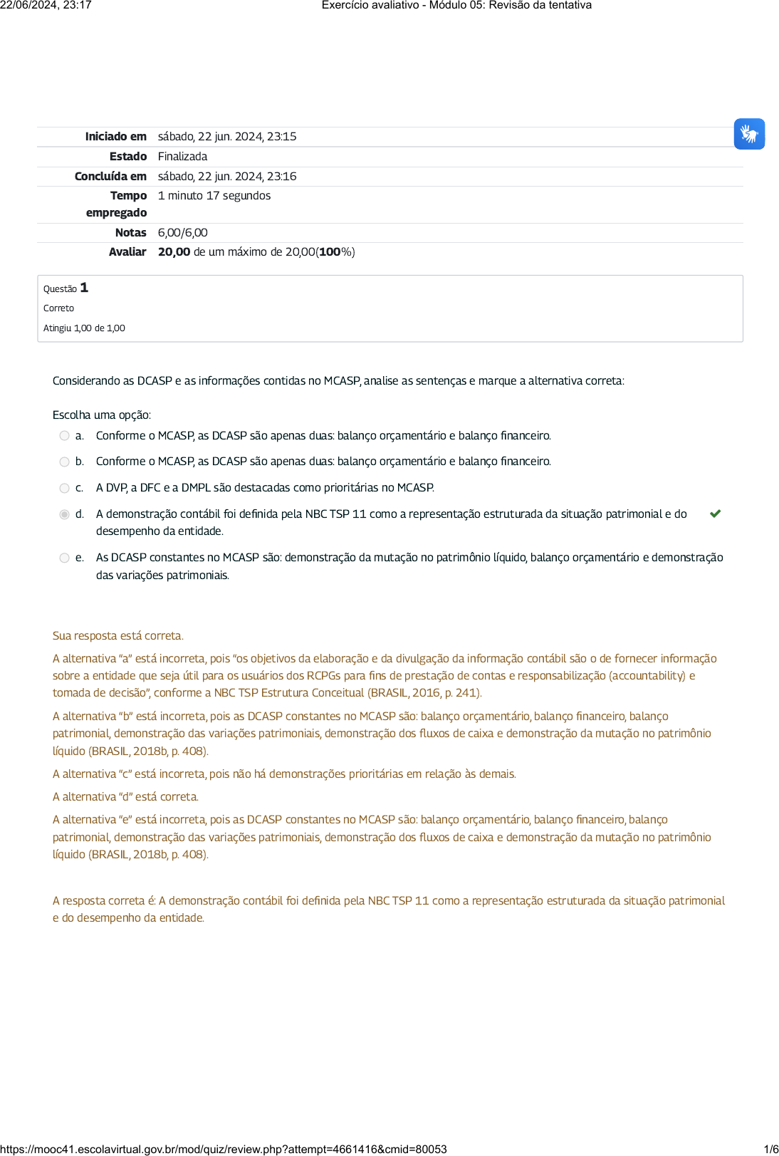 Iniciado em sábado, 22 jun. 2024, 23:15 Estado Finalizada Concluída em sábado, 22 jun. 2024, 23:16 Tempo empregado 1 minuto 17 segundos Notas 6,00/6,00 Avaliar 20,00 de um máximo de 20,00(100%) Questão 1 Correto Atingiu 1,00 de 1,00 Considerando as DCASP e as informações contidas no MCASP, analise as sentenças e marque a alternativa correta: Escolha uma opção: a. Conforme o MCASP, as DCASP são apenas duas: balanço orçamentário e balanço �nanceiro. b. Conforme o MCASP, as DCASP são apenas duas: balanço orçamentário e balanço �nanceiro. c. A DVP, a DFC e a DMPL são destacadas como prioritárias no MCASP. d. A demonstração contábil foi de�nida pela NBC TSP 11 como a representação estruturada da situação patrimonial e do desempenho da entidade. e. As DCASP constantes no MCASP são: demonstração da mutação no patrimônio líquido, balanço orçamentário e demonstração das variações patrimoniais. Sua resposta está correta. A alternativa “a” está incorreta, pois “os objetivos da elaboração e da divulgação da informação contábil são o de fornecer informação sobre a entidade que seja útil para os usuários dos RCPGs para �ns de prestação de contas e responsabilização (accountability) e tomada de decisão”, conforme a NBC TSP Estrutura Conceitual (BRASIL, 2016, p. 241). A alternativa “b” está incorreta, pois as DCASP constantes no MCASP são: balanço orçamentário, balanço �nanceiro, balanço patrimonial, demonstração das variações patrimoniais, demonstração dos �uxos de caixa e demonstração da mutação no patrimônio líquido (BRASIL, 2018b, p. 408). A alternativa “c” está incorreta, pois não há demonstrações prioritárias em relação às demais. A alternativa “d” está correta. A alternativa “e” está incorreta, pois as DCASP constantes no MCASP são: balanço orçamentário, balanço �nanceiro, balanço patrimonial, demonstração das variações patrimoniais, demonstração dos �uxos de caixa e demonstração da mutação no patrimônio líquido (BRASIL, 2018b, p. 408). A resposta correta é: A demonstração contábil foi de�nida pela NBC TSP 11 como a representação estruturada da situação patrimonial e do desempenho da entidade. 22/06/2024, 23:17 Exercício avaliativo - Módulo 05: Revisão da tentativa https://mooc41.escolavirtual.gov.br/mod/quiz/review.php?attempt=4661416&cmid=80053 1/6 Questão 2 Correto Atingiu 1,00 de 1,00 Considerando as DCASP e as informações prestadas pelo balanço patrimonial, analise as sentenças e marque a alternativa correta: Escolha uma opção: a. Os ativos não circulantes referem-se aos passivos não classi�cados como circulantes. b. O balanço patrimonial é estruturado unicamente em: ativo circulante, ativo não circulante, passivo circulante e passivo não circulante. c. A classi�cação dos elementos patrimoniais considera a segregação em “circulante” e “não circulante”, fundamentada em seus atributos de conversibilidade e exigibilidade. d. A classi�cação por fonte é padronizada. Logo, basta cada ente adotá-la. e. Não há restrições para que os atos sejam considerados como atos potenciais do ativo e do passivo. Sua resposta está correta. A alternativa “a” está incorreta, pois a de�nição apresentada na alternativa refere-se aos passivos não circulantes. Os ativos não circulantes referem-se aos ativos não classi�cados como circulantes. A alternativa “b” está incorreta, pois, de acordo com o MCASP, o balanço patrimonial está estruturado em: ativo circulante e não circulante; passivo circulante e não circulante; e patrimônio líquido. A alternativa “c” está correta. A alternativa “d” está incorreta, pois a classi�cação por fonte não segue uma padronização, portanto cabe a cada ente adaptá-la à sua realidade. A alternativa “e” está incorreta, pois somente devem ser considerados como atos potenciais do ativo e do passivo os que estiverem na condição a executar. A resposta correta é: A classi�cação dos elementos patrimoniais considera a segregação em “circulante” e “não circulante”, fundamentada em seus atributos de conversibilidade e exigibilidade. 22/06/2024, 23:17 Exercício avaliativo - Módulo 05: Revisão da tentativa https://mooc41.escolavirtual.gov.br/mod/quiz/review.php?attempt=4661416&cmid=80053 2/6 Questão 3 Correto Atingiu 1,00 de 1,00 Considerando as informações prestadas pela DVP, analise as sentenças e marque a alternativa correta: Escolha uma opção: a. A DVP reduz as variações veri�cadas no patrimônio e interfere no resultado patrimonial do exercício. b. A DVP será elaborada utilizando-se as classes 3 (VPD) e 4 (VPA) do PCASP. c. Os valores registrados em VPAs e VPDs são encerrados ao �nal do exercício e representam o resultado patrimonial do exercício levado para a conta de ativo circulante. d. O resultado patrimonial do período é apurado pelas consonâncias e equivalências entre as VPAs e as VPDs. e. O resultado patrimonial do exercício é decorrente de transações no setor público que, exclusivamente, aumentam o patrimônio líquido. Sua resposta está correta. A alternativa “a” está incorreta, pois “a Demonstração das Variações Patrimoniais (DVP) evidenciará as alterações veri�cadas no patrimônio [...] e indicará o resultado patrimonial do exercício” (BRASIL, 2018b, p. 447). A alternativa “b” está correta. A alternativa “c” está incorreta, pois os valores registrados em VPAs e VPDs representam o resultado patrimonial do exercício levado para a conta de patrimônio líquido do balanço patrimonial. A alternativa “d” está incorreta, pois o resultado patrimonial do período é apurado pelo confronto entre as VPAs e as VPDs. A alternativa “e” está incorreta, pois o resultado patrimonial do exercício é decorrente de transações no setor público que aumentam ou diminuem 