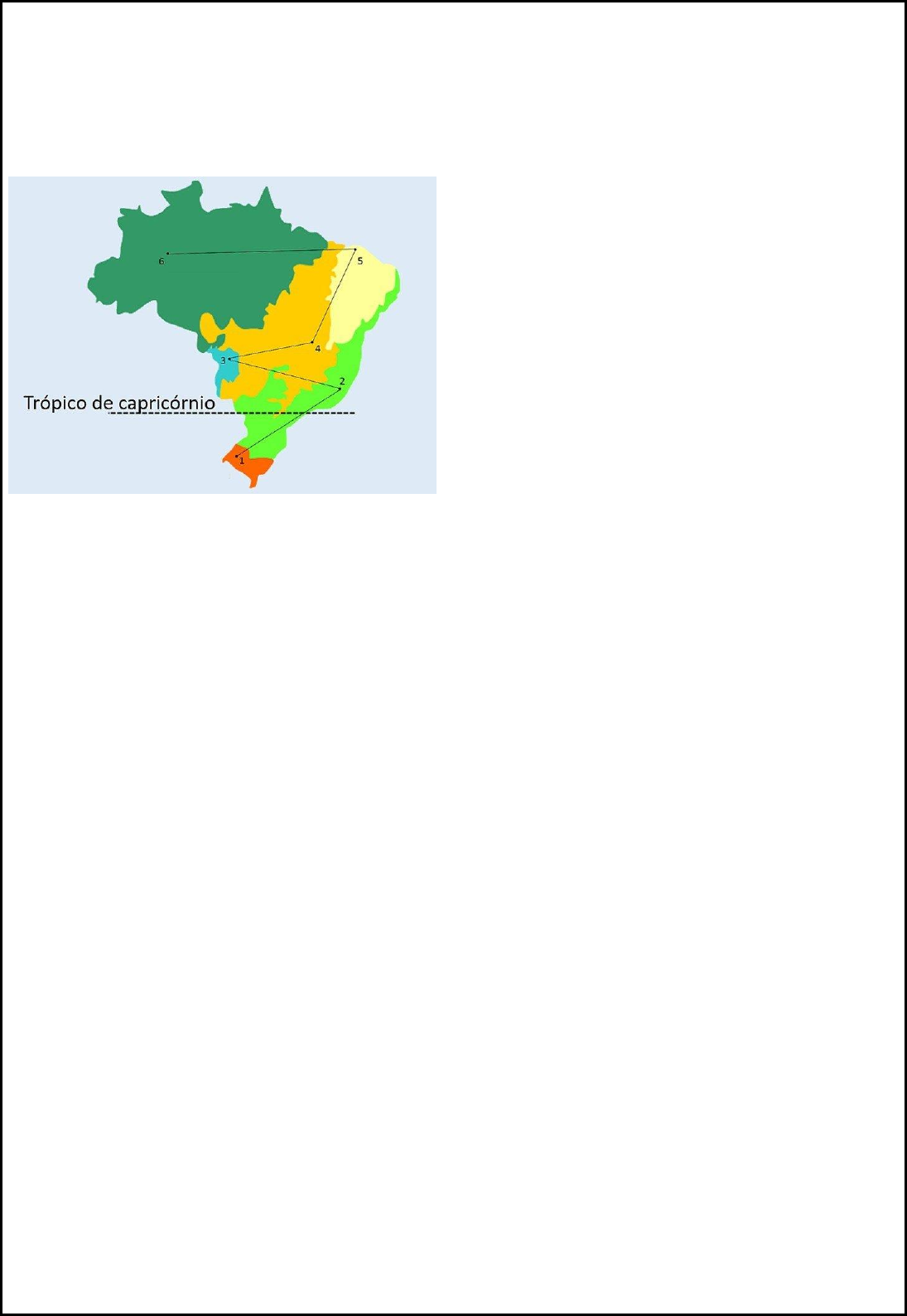 AVALIAÇÃO CONCLUSIVA – 1° BIMESTRE 1. Uma pessoa decidiu aproveitar suas férias e visitar seis cidades para conhecer de perto os biomas brasileiros. O percurso realizado está representado no mapa a seguir. Sabendo que a pessoa partiu do Rio Grande do Sul (1) e teve como destino final o estado do Amazonas (6), a sequência dos biomas visitados foram: a) Pantanal, Caatinga, Cerrado, Mata Atlântica, Pampa e Amazônia. b) Pantanal, Pampa, Mata Atlântica, Cerrado, Caatinga e Amazônia. c) Pampa, Mata Atlântica, Pantanal, Cerrado, Caatinga e Amazônia. d) Pampa, Cerrado, Caatinga, Mata Atlântica, Pantanal e Amazônia. 2. A existência do bioma Caatinga está associada à ocorrência do clima: a) Desértico. b) Semiárido. c) Mediterrâneo. d) Subtropical. e) Equatorial. 3. O bioma Pantanal é encontrado em estados brasileiros localizados na região: a) Sul. b) Sudeste. c) Centro-Oeste. d) Nordeste. e) Norte. 4. O bioma Pampa é o único tipo vegetacional brasileiro que ocorre somente em uma única unidade da federação. Esse estado é o: a) Paraná. b) Mato Grosso. c) Rio Grande do Sul. d) Pernambuco. e) Tocantins. 5. A extração de madeira, especialmente do pau-brasil, os ciclos do açúcar e café e o desmatamento para instalação de indústrias são eventos de nossa história que contribuíram para a degradação desse bioma. O texto refere-se ao bioma: a) Mata Atlântica. b) Caatinga. c) Cerrado. d) Pantanal. 6. A Amazônia é um dos principais biomas brasileiros e ocupa uma grande área do território do país. Em qual dos estados, dentre os listados abaixo, não há vegetação amazônica? a) Tocantins. b) Maranhão. c) Pernambuco. d) Rondônia. 7. O Cerrado é o segundo maior bioma do território brasileiro em área, sendo superado apenas pela: a) Caatinga. b) Amazônia. c) Mata Atlântica. d) Pampa. 8. É uma característica do solo da Caatinga: a) Elevada presença de pedregulhos. b) Acelerada lixiviação do solo. c) Grande presença de argila. d) Pequena fertilidade do subsolo. 9. O clima típico do Pampa é: a) tropical semiúmido b) equatorial c) tropical semiárido d) subtropical