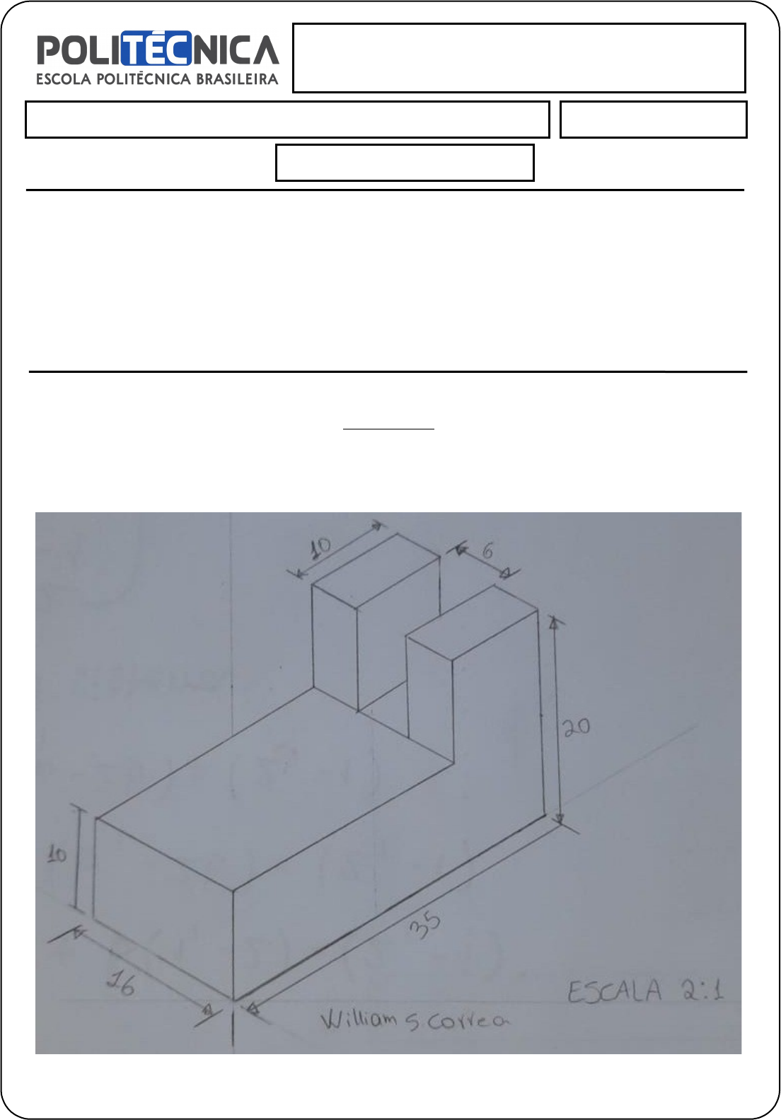 Interpretação de Desenho Técnico Aluno (a): Data: 01 / 05 /2024 Atividade de Pesquisa 02 ORIENTAÇÕES: Esta Atividade contém 02 questões, totalizando 10 pontos. Ler atentamente as instruções contidas no documento é de fundamental importância na realização da avaliação. Você deve preencher dos dados no Cabeçalho para sua identificação - Nome / Data de entrega Ao terminar grave o arquivo com o nome Atividade de Envio (nome do aluno). A nota será lançada no sistema. O prazo de correção é de até 07 (sete) dias úteis. Envie o arquivo pelo sistema em formato digital em PDF ou WORD. Todos os desenhos devem ser feitos a mão. Bons Estudos! William dos Santos Correa QUESTÕES 1. Construir a Perspectiva Isométrica da peça a partir das vistas ortográficas (usando lápis, régua, compasso, etc.): Obs.: Desenho com Cotas em mm. 2. Construir a Perspectiva Isométrica da peça dada manualmente (usando lápis, régua, compasso, etc.): Obs.: Desenho com Cotas em mm. Atividade de Pesquisa 02: Interpretação de Desenho Técnico image1.png image2.png image3.jpeg image4.png image5.jpeg