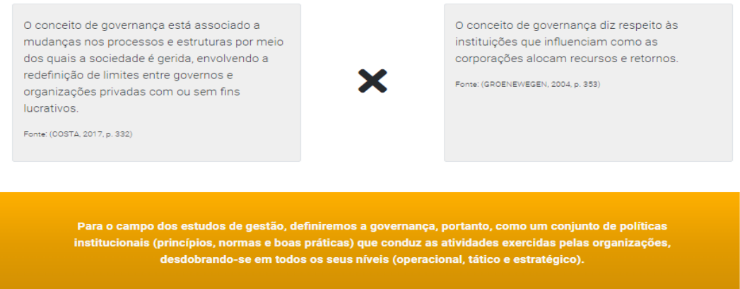 Tema 7 Governança Corporativa no Brasil e no Mundo Módulo 1 Definir a governança corporativa e a sua importância para o sucesso das organizações ORIGEM DE GOVERNANÇA Governança é um termo derivado da palavra “governo”. Assunto rotineiro nas discussões organizacionais, o sentido de governança pode ter diferentes abordagens e perspectivas. A palavra surge, em especial, graças a reflexões propostas pelo Banco Mundial (BM). Por ser uma agência de fomento, ou seja, de empréstimos, o BM impõe contrapartidas aos países financiados com os recursos da instituição. Desse modo, exigir boas práticas das instituições governamentais e do mercado privado de determinada nação passa a configurar um dos requisitos para a concessão de financiamentos. Essas contrapartidas do BM significam, na realidade, a exigência de boas práticas — nos governos, nas instituições ou na iniciativa privada — para a concessão de empréstimos. Essas boas práticas exigidas correspondem ao sentido da palavra governança. Governança e poder Em seu relatório Governance and the law (em português, a governança e a lei), o BM define a governança como “o processo pelo qual os atores estatais e não estatais interagem para projetar e implementar políticas dentro de um dado conjunto de regras formais e informais que moldam e são moldadas pelo poder”. Fonte: (THE WORLD BANK, 2017, p. 41) Esse documento (2017) ainda oferece uma definição de poder como a “capacidade de grupos e indivíduos para fazerem com que outros ajam segundo seus interesses e para trazer resultados específicos”. Nota-se que os sentidos de governança e poder estão correlacionados, pois o exercício de persuasão requer minimamente uma ação de convencimento. Nas organizações, o convencimento é produzido por meio da governança, que leva determinada instituição a seguir as diretrizes e as práticas. Ela o faz a partir de um discurso capaz de proporcionar uma identificação tanto emocional quanto racional por parte dos colaboradores. A percepção do conceito de governança difere entre alguns autores: Governança vs. governabilidade Em muitos momentos, a governança é confundida com o termo “governabilidade”. Mas ambas possuem diferenças fundamentais. Governança Este termo trata da adoção de boas práticas com os públicos interno e externo à organização no intuito de executar sua missão cada vez melhor. Ele possui um caráter filosófico e de princípios. Governabilidade Já a governabilidade corresponde à legitimidade e à estabilidade de um grupo para dirigir determinada organização. Tem vinculação direta com a política de sustentação de presidentes de companhias ou de executivos dos mais diversos ramos organizacionais ou empresariais. Sobre a governabilidade, verificamos que sua existência depende das condições de sustentação (apoios) de um poder de mando e de decisão. TIPOS DE GOVERNANÇA Os tipos de governança se organizam da seguinte forma: 1. Por atividades: 2. Sustentabilidade 3. Comunitária 4. De tecnologia da informação 5. Legal 6. Contábil Por finalidade: 1. Governança pública 2. Governança corporativa Com relação à classificação por finalidade da organização, Secchi (2013) aponta que a governança pública é a forma de interação horizontal entre atores estatais e não estatais no processo de construção de políticas públicas. Ou seja, essa governança representa os princípios pelos quais as diversas instituições do Estado se estruturam, apontando a filosofia que fundamenta o relacionamento – que, neste caso, é externo – com seu público. Este tipo se difere da governança corporativa em boa parte pelo fato de sua atividade-fim ser diferente. Enquanto as entidades privadas visam ao lucro, as públicas buscam a criação de valor público para a sociedade. Por conta disso, as empresas são estruturadas de maneira a garantir esse valor em primeiro lugar. Na governança corporativa, por outro lado, existe a direção que uma instituição privada almeja seguir para o alcance dos resultados: o lucro e o retorno para os acionistas como atividades-fim, além de seu equilíbrio econômico-financeiro. A pública conta com o mesmo intento, mas espera-se que os resultados culminem no bem comum e na criação de valor público, o qual, aliás, pode ser traduzido na adequada prestação de serviços à população. A GOVERNANÇA CORPORATIVA Imagine que você seja um investidor e precise decidir em qual empresa colocar seus recursos. Provavelmente, você decidiria investir naquela em que confiasse plenamente. Usualmente, os investidores levam em consideração não apenas a situação atual da empresa, mas também suas perspectivas de futuro, seus potenciais de ganho e a segurança que elas passam. A governança corporativa surge como um conjunto de mecanismos que permite aos investidores estarem mais confiantes em relação ao bom uso dos recursos da empresa. Ela cria, portanto, as medidas que possibilitam mais transparência e a garantia de que as organizações funcionam de maneira ética, ainda que elas sempre busquem o lucro. A governança corporativa foi introduzida no Brasil por influência do Instituto Brasileiro de Governança Corporativa (IBGC). Listaremos a seguir os setes princípios norteadores da boa governança: 1. Participação 2. Estado de direito 3. Transparência 4. Responsabilidade 5. Orientação por consenso 6. Igualdade e inclusividade 7. Efetividade e eficiência Embora a literatura especializada destaque a existência de sete princípios norteadores da boa governança, destacaremos apenas – pela relevância do IBGC para a prática da governança no Brasil – as quatro bases que, segundo o instituto, são fundamentais para a boa governança corporativa: A) TRANSPARÊNCIA Ela consiste no desejo de disponibilizar para as partes interessadas informações que sejam do seu interesse – e não apenas aquelas impostas por dispos