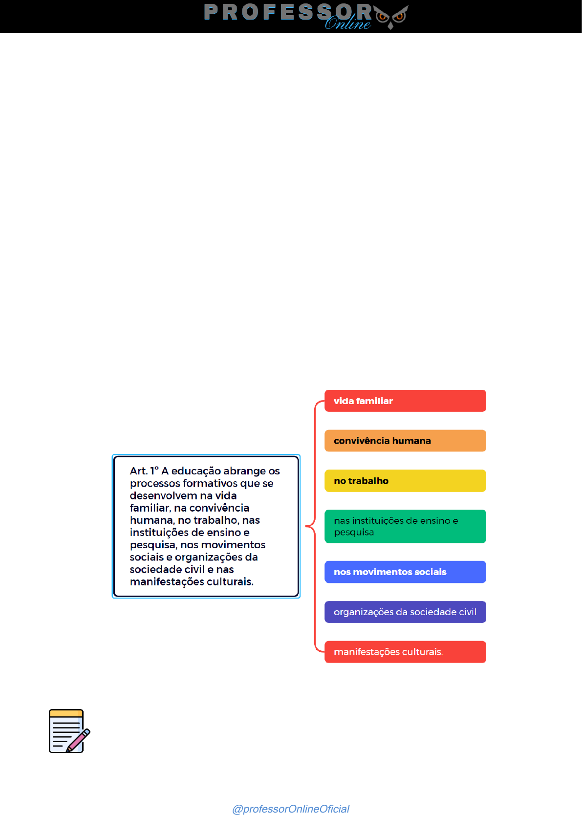 TÍTULO I Da Educação Nos termos do artigo 1º a educação ocorre de forma ampla e por meio de ações coletivas. QUESTÕES E MAPAS @professorOnlineOficial Como as bancas costumam cobrar este assunto em Provas de Concursos? 01 - AVANÇASP - Prof (AmericanaEducação Infantil/2023 A Lei de Diretrizes e Bases da Educação (Lei 9.394/96) é a principal Norma da Educação Brasileira, pois organiza a sua estrutura e regulamenta seus princípios, mecanismos e bases. Segundo a LDB, “Art. 1º A educação abrange ______________________ que se desenvolvem na vida familiar, na convivência humana, no trabalho, nas instituições de ensino e pesquisa, nos movimentos sociais e organizações da sociedade civil e nas manifestações culturais.” a) as manifestações culturais. b) os processos formativos. c) os saberes acadêmicos. d) todas as pessoas. e) os conhecimentos e princípios. 02 - CEV URCA - DAE (Pref Iguatu) 2021 A Lei de Diretrizes e Bases da Educação Nacional (LDBEN 9.394/96) em seu Art. 1º assegura que a educação abrange os processos formativos que se desenvolvem: a) na educação infantil e nos anos iniciais do ensino fundamental. b) na vida familiar, na convivência humana, no trabalho, nas instituições de ensino e pesquisa, nos movimentos sociais e organizações da sociedade civil e nas manifestações culturais. c) na vida cultural das grandes metrópoles. d) na vida do campo e nas indústrias. e) na vida escolar, na convivência com os mais jovens, nas indústrias e na forma da lei. @professorOnlineOficial 03 - QUADRIX - Prof ST (SEDF) 2021 A Lei de Diretrizes e Bases (LDB), Lei n.o 9.394, foi promulgada em 20 de dezembro de 1996. Desde então, ela vem abrangendo os mais diversos tipos de educação: educação infantil; ensino fundamental; e ensino médio, além de outras modalidades do ensino, como a educação especial, a educação indígena, a educação no campo e o ensino a distância. Cabe a nós, brasileiros, segui-la, tornando a educação muito mais humana e formativa. Internet: <http://cptstatic.s3.amazonaws.com> (com adaptações). A respeito dos direcionamentos dados na Lei de Diretrizes e Bases (LDB), Lei n.o 9.394/1996, em relação à educação, julgue o item. Segundo o artigo 1.o da LDB, a educação deve abranger os processos formativos que se desenvolvem na vida familiar, na convivência humana, no trabalho, nas instituições de ensino e pesquisa, nos movimentos sociais, nas organizações da sociedade civil e nas manifestações culturais. o Certo o Errado 04 - IUDS - Ass Alun (IF RJ)/IF RJ/2021 De acordo com o artigo 1 da Lei de Diretrizes e Bases da Educação (LDB), a educação abrange os processos que se desenvolvem, na vida familiar, na convivência humana, , nas instituições de ensino e pesquisa, nos movimentos sociais e organizações da sociedade civil e nas manifestações . Assinale a alternativa que completa, correta e respectivamente, as lacunas do texto: a) Formativos - do Trabalho - Culturais. @professorOnlineOficial b) Formativos - da Escola - Sociais. c) Pedagógicos - do Trabalho - Culturais. d) Pedagógicos - da Escola - Sociais. 05 - EDUCA PB - Prof (Pref C Índios) Educação Básica I/2020 De acordo com a Lei de Diretrizes e Bases da Educação Nacional, Lei nº 9.394, de 20 de dezembro de 1996, em seu art. 1º estabelece que a educação abrange os processos formativos que se desenvolvem na: I. Vida familiar. II. Convivência humana. III. Trabalho. IV. Instituições de ensino e pesquisa. V. Movimentos sociais e organizações da sociedade civil. VI. Manifestações culturais. Estão CORRETAS: a) I, II, III e IV apenas. b) II, III, IV e V apenas. c) III, IV, V e VI apenas. d) I, IV, V e VI apenas. e) I, II, III, IV, V e VI. @professorOnlineOficial 06 - Instituto Consulplan - Prof (Pref Orlândia) 2019 A educação pode ser definida como sendo o processo de socialização dos indivíduos e seu processo é materializado em uma série de habilidades e valores, que ocasionam mudanças intelectuais, emocionais e sociais no indivíduo. No Brasil, a Lei de Diretrizes e Bases nº 9394/96 disciplina a educação escolar que se desenvolve por meio do ensino: a) Preferencialmente, em instituições próprias. b) Predominantemente, em instituições próprias. c) Exclusivamente, em instituições públicas e/ou particulares. d) Predominantemente, em instituições próprias ou no domicílio da criança. Escolas, creches, faculdades... @professorOnlineOficial 07 - FUNDATEC - Prof (Cariacica)2021 A Lei nº 9.394/1996 disciplina a educação escolar que se desenvolve, a) predominantemente, por meio do ensino, em instituições próprias. b) predominantemente, no núcleo familiar, através do currículo oculto. c) exclusivamente, através do ensino informal, nas organizações sociais. d) exclusivamente, por meio das manifestações culturais, de forma espontânea. e) exclusivamente, através de movimentos políticos e instituições confessionais. @professorOnlineOficial 08 - Prof (Americana) Educação Infantil/2023 Ainda sobre o Art. 1º da Lei de Diretrizes e Bases da Educação (BRASIL, 1996), a educação escolar se desenvolve, predominantemente, por meio do ensino, em instituições próprias e deverá vincular-se: a) a família e a sociedade. b) ao educando e ao educador. c) ao cuidar e educar. d) às habilidades e competências. e) ao mundo do trabalho e à prática social. 09 - AVANÇASP - Mon (Pref Americana)2023 Segundo a Lei de Diretrizes e Bases da Educação, “A educação escolar deverá vincular-se”: a) a família e a sociedade. b) ao currículo escolar. c) ao Ministério da Educação e Cultura (MEC). d) ao mundo do trabalho e à prática social. e) ao pleno desenvolvimento do aluno. 10 - OMNI - Sec (Sta Livramento) 2020 Conforme a Lei de Diretrizes e Bases da Educação Nacional 9394 de 20 de dezembro de 1996. Analise os contextos a seguir: [1] A educação abrange os processos formativos que se desenvolvem na 
