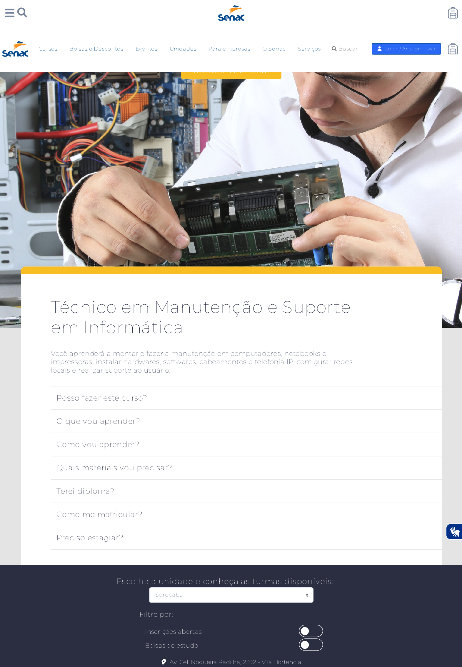 Home Cursos Técnicos〉 Curso Técnico - Técnico em Manutenç…〉 Escolha a unidade e conheça as turmas disponíveis: Av. Cel. Nogueira Padilha, 2392 - Vila Hortência Técnico em Manutenção e Suporte em Informática Você aprenderá a montar e fazer a manutenção em computadores, notebooks e impressoras, instalar hardwares, softwares, cabeamentos e telefonia IP, con�gurar redes locais e realizar suporte ao usuário. Posso fazer este curso? O que vou aprender? Como vou aprender? Quais materiais vou precisar? Terei diploma? Como me matricular? Preciso estagiar? Sorocaba Filtre por: Inscrições abertas Bolsas de estudo Cursos Técnicos Buscar Cursos Bolsas e Descontos Eventos Unidades Para empresas O Senac Serviços Login / Área Exclusiva https://www.sp.senac.br/ https://www.sp.senac.br/cursos-tecnicos https://www.sp.senac.br/cursos-tecnicos/curso-tecnico-em-manutencao-e-suporte-em-informatica https://www.google.com.br/maps/place/Senac+Sorocaba/@-23.5126968,-47.4340048,17z/data=!3m1!4b1!4m2!3m1!1s0x94cf6035213bb2b9:0xf788703501c35c95?shorturl=1 https://www.sp.senac.br/ https://www.sp.senac.br/ https://eventos.sp.senac.br/?ad=sitesenac Quer receber um av iso por e-mail sobre novas turmas? Sim, me avise Cursos que você pode gostar Turmas Próxima 〉 A turma pode ser cancelada ou ter alterações do número de vagas, datas e horários. Tem dúvidas sobre bolsas de estudo? Saiba como funciona 〈 Anterior 〈 Período: 1º/3/2023 a 24/5/2024 Horário e dias das aulas: Segunda a sexta: 13h30 às 17h30 Onde as aulas vão acontecer? Bolsas de estudo Inscrições para bolsas a partir de 09/02 às 12 horas Saiba mais sobre: Descontos e parcelamento COMPRAR Investimento: 32x R$ 99,00 De: R$ 9.312,17 Por: R$ 3.168,00 Período: 1º/8/2023 a 23/ 10/2024 Horário e dias das aulas: Segunda a sexta: 19h às 22h30 Onde as aulas vão acontecer? Bolsas de estudo Inscrições para bolsas a partir de 12/07 às 12 horas Saiba mais sobre: Descontos e parcelamento COMPRAR Investimento: 32x R$ 99,00 De: R$ 9.312,17 Por: R$ 3.168,00 〉 〈 Livre Assistente de Operação de Redes de Computadores Inscrições abertas Bolsas Livre Assistente de Tecnologias da Informação Inscrições abertas Bolsas Livre Formação em Hardware Inscrições abertas Bolsas Livre Gerenciamento de Redes com Windows Server Inscrições abertas Bolsas 〉 • • Siga-nos Unidades e Campi Sobre o Senac Fale com a gente Senac EAD Editora Hotéis Trabalhe Conosco Licitação Descontos e Parcelamento Biblioteca Blog Blog Senac Moda Informação Podcast Senac SP Buscar Cursos Bolsas e Descontos Eventos Unidades Para empresas O Senac Serviços Login / Área Exclusiva https://www.sp.senac.br/bolsas-de-estudo/como-funciona https://www.facebook.com/senacsaopaulo http://twitter.com/intent/follow?source=followbutton&variant=1.0&screen_name=senacsaopaulo https://www.linkedin.com/company/senac/ https://www.youtube.com/c/senacsaopaulo?sub_confirmation=1 https://www.instagram.com/senacsaopaulo https://br.pinterest.com/senacsaopaulo https://open.spotify.com/user/1vyc0sv0mpz525agrtmcpjxzr?si=357de46f39104839 https://www.tiktok.com/@senac.sp https://www.sp.senac.br/unidades https://www.sp.senac.br/sobre-o-senac https://www.sp.senac.br/fale-com-a-gente https://www.ead.senac.br/ https://www.editorasenacsp.com.br/ https://grandehotelsenac.com.br/ http://www.sp.senac.br/recruPortal/portal/mural http://www.sp.senac.br/jsp/default.jsp?newsID=a17344.htm&testeira=457 https://www.sp.senac.br/descontos https://www.sp.senac.br/jsp/default.jsp?newsID=a18511.htm&testeira=386 https://www.sp.senac.br/blog/ http://www.senacmoda.info/ https://materiais.blogsenacsp.com.br/podcast-senac-sp https://www.sp.senac.br/ https://www.sp.senac.br/ https://eventos.sp.senac.br/?ad=sitesenac Copyright © 2020. Todos os Direitos Reservados Serviço Nacional de Aprendizagem Comercial - SP CNPJ: 03.709.814/0001-98 Política de Privacidade. Buscar Cursos Bolsas e Descontos Eventos Unidades Para empresas O Senac Serviços Login / Área Exclusiva https://www.sp.senac.br/politica-de-privacidade https://materiais.blogsenacsp.com.br/podcast-senac-sp https://www.sp.senac.br/ https://www.sp.senac.br/ https://eventos.sp.senac.br/?ad=sitesenac