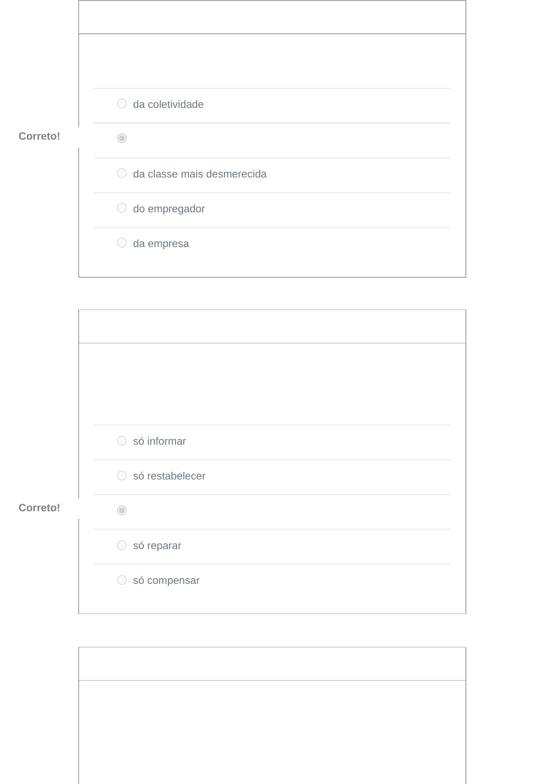 0,2 / 0,2 ptsPergunta 1 A finalidade precípua do Direito do Trabalho é a proteção: da coletividade do trabalhador Correto!Correto! da classe mais desmerecida do empregador da empresa 0,2 / 0,2 ptsPergunta 2 A finalidade da responsabilidade civil é ______________________ a forma que era antes do dano, dano este que foi suportado pela vítima. só informar só restabelecer restabelecer, reparar ou compensar Correto!Correto! só reparar só compensar 0,2 / 0,2 ptsPergunta 3 O prazo de proteção do desenho industrial é de: 6/23/24, 9:06 PM PRV - Prova: 2024B - Fundamentos Jurídicos (70470) - Eng. Civil https://ucaead.instructure.com/courses/70470/quizzes/384449 1/6 5 anos a partir da data do depósito do pedido, não podendo o mesmo ser prorrogado. 10 anos a partir da data do depósito do pedido, podendo o mesmo ser prorrogado no máximo por 3 vezes pelo período de 5 anos cada. Correto!Correto! 10 anos a partir da data do depósito do pedido, podendo o mesmo ser prorrogado no máximo por 2 vezes pelo período de 5 anos cada. 10 anos a partir da data do depósito do pedido, podendo o mesmo ser prorrogado no máximo por uma única vez. 10 anos a partir da data do depósito do pedido, não podendo o mesmo ser prorrogado. 0,2 / 0,2 ptsPergunta 4 Dentre as alternativas, quais as principais alterações na Nova Lei de Licitações: não exigir qualquer tipo de seguro – garantia para obras grandes. facilitar a aquisição de produtos de luxo. exigir seguro – garantia para obras grandes e impedir a aquisição de produtos de luxo. Correto!Correto! 6/23/24, 9:06 PM PRV - Prova: 2024B - Fundamentos Jurídicos (70470) - Eng. Civil https://ucaead.instructure.com/courses/70470/quizzes/384449 2/6 manter as modalidades de licitação, mas impedir a aquisição de produtos de luxo. manter as modalidades de licitação, sem criar nenhuma. 0,2 / 0,2 ptsPergunta 5 A matéria de Direito do Trabalha, é uma matéria: independente, mas não autônoma das demais matérias do ramo da ciência jurídica. dependente e autônoma das demais matérias do ramo da ciência jurídica. dependente, mas não e autônoma das demais matérias do ramo da ciência jurídica. independente e autônoma das demais matérias do ramo da ciência jurídica. Correto!Correto! não é independente e nem autônoma, mas interdisciplinar com relação as demais matérias do ramo da ciência jurídica. 0,2 / 0,2 ptsPergunta 6 O princípio que define que: é o guardião de todos os princípios fundamentais dos trabalhadores, é direção e norteia todo o sentido da criação do Direito do Trabalho, no sentido de proteger 6/23/24, 9:06 PM PRV - Prova: 2024B - Fundamentos Jurídicos (70470) - Eng. Civil https://ucaead.instructure.com/courses/70470/quizzes/384449 3/6 a parte mais frágil na relação jurídica – o trabalhador, é o princípio: da boa fé da legalidade da razoabilidade da proteção Correto!Correto! da dignidade humana 0,2 / 0,2 ptsPergunta 7 Prazo para a proteção da Marca: de 15 anos contados a partir da concessão do registro, podendo este ser prorrogado por períodos de 15 anos iguais e sucessivas vezes. de 10 anos contados a partir da concessão do registro, não podendo este ser prorrogado. de 15 anos contados a partir da concessão do registro, não podendo este ser prorrogado. Não há prazo. de 10 anos contados a partir da concessão do registro, podendo este ser prorrogado por períodos de 10 anos iguais e sucessivas vezes. Correto!Correto! 6/23/24, 9:06 PM PRV - Prova: 2024B - Fundamentos Jurídicos (70470) - Eng. Civil https://ucaead.instructure.com/courses/70470/quizzes/384449 4/6 0,2 / 0,2 ptsPergunta 8 Alguns dos fundamentos da Reforma Trabalhista de 2017 foram: considerar o empregado uma pessoa incapaz de direitos e obrigações não permitir que os sindicatos negociam dificultar os meios alternativos de solução de conflitos prejudicar as negociações coletivas reduzir o número de ações trabalhistas Correto!Correto! 0,2 / 0,2 ptsPergunta 9 Pela Lei dos Direitos Autorais, no artigo 18, não pode ser patenteado: parte dos seres vivos, exceto parte dos seres vivos e os microorganismos transgênicos. o que for contrário à moral e aos bons costumes exceto à segurança, à ordem e à saúde públicas. o que for contrário à moral, aos bons costumes e à segurança, à ordem e à saúde públicas. Correto!Correto! 6/23/24, 9:06 PM PRV - Prova: 2024B - Fundamentos Jurídicos (70470) - Eng. Civil https://ucaead.instructure.com/courses/70470/quizzes/384449 5/6 as substâncias, matérias, misturas, elementos ou produtos de qualquer espécie, bem como a modificação de suas propriedades físico-químicas e os respectivos processos de obtenção ou modificação, exceto quando resultantes de transformação do núcleo atômico. o todo ou parte dos seres vivos e os microorganismos transgênicos. 0,2 / 0,2 ptsPergunta 10 O direito ao domínio das obras na Leis dos Direitos Autorais é por tempo: pelo tempo que o autor desejar determinado Correto!Correto! determinado ou indeterminado, quem decide é o autor pelo tempo que o registrador desejar indeterminado 6/23/24, 9:06 PM PRV - Prova: 2024B - Fundamentos Jurídicos (70470) - Eng. Civil https://ucaead.instructure.com/courses/70470/quizzes/384449 6/6