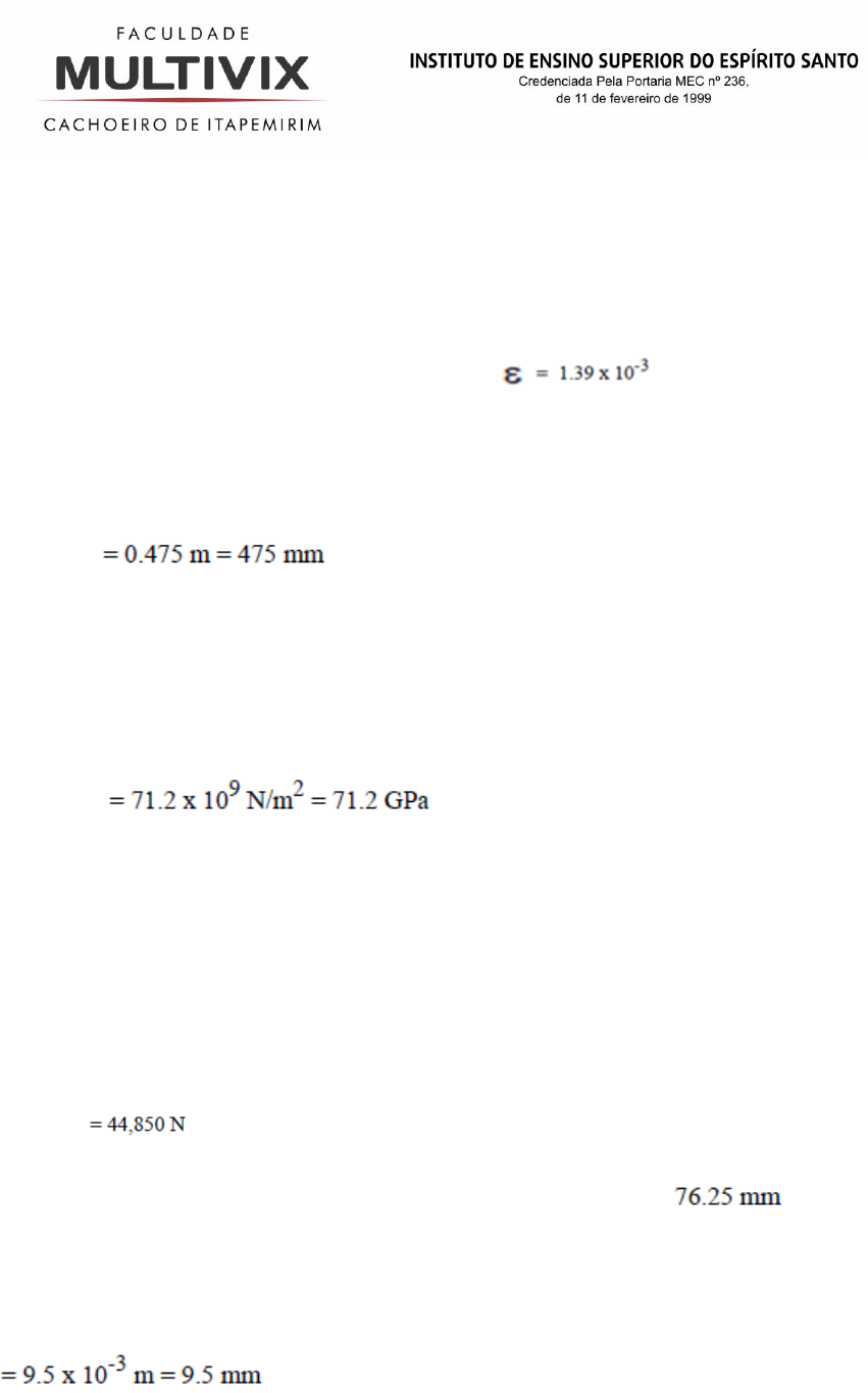 Nome: Data: Exercícios- Resistência dos Materiais 1)Um corpo de prova de cobre com seção transversal retangular de 15,2mm x 19,1mm é tracionado com um força de 44500N, produzindo apenas uma deformação elástica. Calcule a deformação resultante.Dados: E cobre= 110 x 10^9N/m² Resposta: 2)Um corpo de prova cilíndrico feito em uma liga de níquel, que possui um módulo de elasticidade de 207GPa e um diâmetro original de 10,2mm, irá sofrer apenas deformação elástica quando uma carga de tração de 8900N for aplicada. Calcule o comprimento máximo do corpo de prova antes da deformação, se o alongamento máximo admissível é de 0,25mm. Resposta 3)Uma barra de alumínio com 125mm de comprimento e que possui uma seção transversal quadrada com 16,5mm de aresta é tracionada com uma carga de 66700N e apresenta um alongamento de 0,43mm. Assumindo que a deformação seja inteiramente elástica, calcule o módulo de elasticidade do alumínio. Resposta: 4)Considere um arame cilíndrico de níquel com 2mm de diâmetro e 3 x 10^4mm de comprimento. Calcule o seu alongamento quando uma carga de 300N é aplicada. Assuma que a deformação seja totalmente elástica. Dados: E níquel= 207 x 10^9 N/m² Resposta: 13,8mm ou 0,0138m 5) Para uma liga de latão, a tensão na qual a deformação plástica tem seu início é de 345MPa e o módulo de elasticidade é de 103GPa. a)Qual é a carga máxima que pode ser aplicada a um corpo de prova com uma área transversal de 130mm² sem que ocorra deformação plástica? Resposta b) Se o comprimento original do corpo de prova é de 76mm, qual é o comprimento máximo ao qual ele poderá ser esticado sem causar deformação plástica? Resposta = 6)Um bastão cilíndrico de aço (E=207GPa) que possui um limite de escoamento de 310MPa deve ser submetido a uma carga de 11100N. Se o comprimento do bastão é de 500mm, qual deve ser o seu diâmetro para permitir um alongamento de 0,38mm? Resposta 7)Considere um corpo de prova cilíndrico feito em uma liga de aço com 8,5mm de diâmetro e 80mm de comprimento que é tracionado. Determine a tensão quando uma carga de 65250N for aplicada. Resposta = 1150 MPa 8)Um corpo de prova cilíndrico feito em aço, que possui um diâmetro de 15,2mm e um comprimento de 250mm é deformado elasticamente em tração com uma força de 48900N. Usando os dados fornecidos na Tabela a seguir (6.1), determine o seguinte: a) O valor segundo o qual esse corpo de prova irá se alongar na direção da tensão aplicada. Resposta: b) A variação no diâmetro do corpo de prova. O diâmetro irá aumentar ou diminuir? Resposta 9)Uma barra cilíndrica de alumínio com 19mm deve ser deformado elasticamente pela aplicação de uma força ao longo de seu eixo. Usando os dados da Tabela 6.1, determine a força que irá produzir um redução elástica de 2,5x10^-3mm no diâmetro. Resposta 10)Um corpo de prova cilíndrico feito em uma dada liga metálica com 10mm de diâmetro, é tensionado elasticamente em tração. Uma força de 15000N produz uma redução no diâmetro do corpo de prova de 7x10^-3mm. Calcule o coeficiente de Poisson para esse material se o seu módulo de elasticidade é de 100GPa. Resposta 11)Um corpo de prova cilíndrico de uma liga metálica hipotética é tensionada em compressão. Se os seus diâmetros original e final são de 30,00 e 30,04mm, respectivamente, e se o seu comprimento final é de 105,20mm, calcule o seu comprimento original se a deformação ocorrida foi totalmente elástica. Os módulos de elasticidade e de cisalhamento para essa liga são de 65,5GPa e 25,4GPa, respectivamente. Resposta= 12)Considere um corpo de prova cilíndrico de alguma liga metálica hipotética que possui um diâmetro de 10mm. Uma força de tração de 1500N produz uma redução elástica no diâmetro de 6,7x10^-4mm. Calcule o módulo de elasticidade para essa liga, dado que o coeficiente de Poisson é de 0,35. Resposta= 13) A Figura 6.21 mostra o comportamento tensão-deformação de engenharia em tração para uma liga de aço. a) Qual é o módulo de elasticidade? R= b) Qual é o limite de proporcionalidade? R= c) Qual é o limite de escoamento para uma pré-deformação de 0,002?R= d) Qual é o limite de resistência a tração? R= 14)Uma carga de 140000N é aplicada em um corpo de prova cilíndrico feito de uma liga de aço (cujo comportamento tensão-deformação está mostrado na Figura 6.21 que tem um diâmetro de 10mm. a) O corpo de prova irá apresentar deformação elástica e/ou plástica? Porque? R= b) Se o comprimento original do corpo de prova for de 500mm, quanto ele irá aumentar em comprimento quando essa carga for aplicada? R= 15)Um corpo de prova cilíndrico feito em aço inoxidável e que possui um diâmetro de 12,8mm e um comprimento útil de 50,8mm é tracionado. Use as características carga-alongamento que se seguem para completar as partes (a) a (f) desse problema. a) Plote os dados como tensão de engenharia em função da deformação de engenharia b) Calcule o módulo de elasticidade c) Determine a tensão de escoamento para um pré-deformação de 0,002. R= d) Determine o limite de resistência à tração para essa liga. R= e) Qual é a ductilidade aproximada em termos de alongamento percentual? R= f) Calcule o módulo de resiliência. R 16) Um corpo de prova feito de magnésio e que possui uma seção transversal retangular com dimensões de 3,2mmx19,1mm é deformado em tração. Usando os dados carga-alongamento a seguir, complete as partes (a) a (f) desse problema. a)Plote os dados como tensão de engenharia em função da deformação de engenharia b)Calcule o módulo de elasticidade. R= c) Determine a tensão de escoamento para uma pré-deformação de 0,002. R= d)Determine o limite de resistência à tração para essa liga. R= e)Calcule o módulo de resiliência. R f)Qual é a ductilidade em termos do alongamento percentual? R= 17) Para uma liga metálica, uma tensão verdadeira de 345MPa produz 