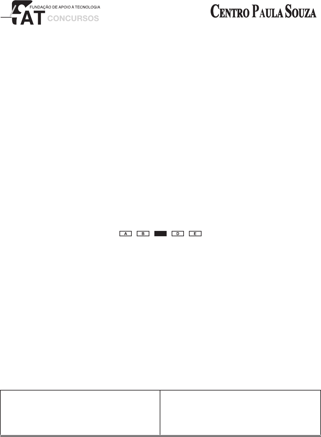 VESTIBULINHO ETEC - 2º SEM/11 ExaME: 19/06/11 (dOMINgO), àS 13H30MIN CadERNO dE QUESTÕES Nome do(a) candidato(a): ________________________________________________ Nº de inscrição: ________________ Prezado(a) candidato(a): Antes de iniciar a prova, leia atentamente as instruções a seguir. 1. Este caderno contém 50 (cinquenta) questões em forma de teste. 2. A prova terá duração de 4 (quatro) horas. 3. Após o início do Exame, você deverá permanecer no mínimo até as 15h30min dentro da sala do Exame, podendo, ao deixar este local, levar consigo este caderno de questões. 4. Você receberá do Fiscal a Folha de Respostas Definitiva. Verifique se está em ordem e com todos os dados impressos corretamente. Caso contrário, notifique o Fiscal, imediatamente. 5. Após certificar-se de que a Folha de Respostas Definitiva é sua, assine-a com caneta esferográfica de tinta preta ou azul no local em que há a indicação: “ASSINATURA DO(A) CANDIDATO(A)”. 6. Após o recebimento da Folha de Respostas Definitiva, não a dobre e nem a amasse, manipulando-a o mínimo possível. 7. Cada questão contém 5 (cinco) alternativas (A, B, C, D, E) das quais somente uma atende às condições do enunciado. 8. Responda a todas as questões. Para cômputo da nota, serão considerados apenas os acertos. 9. Os espaços em branco contidos neste caderno de questões poderão ser utilizados para rascunho. 10. Estando as questões respondidas neste caderno, você deverá primeiramente passar as alternativas escolhidas para a Folha de Respostas Intermediária, que se encontra na última página deste caderno de questões. 11. Posteriormente, você deverá transcrever todas as alternativas assinaladas na Folha de Respostas Intermediária para a Folha de Respostas Definitiva, utilizando caneta esferográfica de tinta preta ou azul. 12. Questões com mais de uma alternativa assinalada, rasurada ou em branco serão anuladas. Portanto, ao preencher a Folha de Respostas Definitiva, faça-o cuidadosamente. Evite erros, pois a Folha de Respostas não será substituída. 13. Preencha as quadrículas da Folha de Respostas Definitiva, com caneta esferográfica de tinta preta ou azul e com traço forte e cheio, conforme o exemplo a seguir 14. Quando você terminar a prova, avise o Fiscal, pois ele recolherá a Folha de Respostas Definitiva, na sua carteira. Ao término da prova, você somente poderá retirar-se da sala do Exame após entregar a sua Folha de Respostas Definitiva, devidamente assinada, ao Fiscal. 15. Enquanto você estiver realizando o Exame, é terminantemente proibido utilizar calculadora, computador, telefone celular, radiocomunicador ou aparelho eletrônico similar, chapéu, boné, lenço, gorro, óculos escuros, corretivo líquido ou quaisquer outros materiais (papéis) estranhos à prova. 16. O desrespeito às normas que regem o presente Processo Seletivo Vestibulinho, bem como a desobediência às exigências registradas no Manual do Candidato, além de sanções legais cabíveis, implicam a desclassificação do candidato. 17. Será eliminado do Exame o candidato que: ∗ não apresentar um dos documentos de identidade originais exigidos; ∗ sair da sala sem autorização ou desacompanhado do Fiscal, com ou sem o caderno de questões e/ou a Folha de Respostas Definitiva; ∗ deixar de assinar a lista de presença e a sua Folha de Respostas Definitiva; ∗ utilizar-se de qualquer tipo de equipamento eletrônico e/ou de livros e apontamentos durante a prova; ∗ perturbar, de qualquer modo, a ordem dos trabalhos; ∗ for surpreendido se comunicando ou tentando se comunicar com outro candidato durante a prova; ∗ ausentar-se do prédio durante a realização da prova, independente do motivo exposto; ∗ realizar a prova fora do local determinado pela Etec / Extensão de Etec; ∗ zerar na prova-teste. 18. Aguarde a ordem do Fiscal para iniciar o Exame. BOA PROVA! Gabarito oficial O gabarito oficial da prova será divulgado a partir das 18 horas do dia 19/06/11, no site www.vestibulinhoetec.com.br Resultado • Divulgação da lista de classificação geral para os cursos técnicos com prova de aptidão a partir do dia 06/07/11. • Divulgação da lista de classificação geral dos demais cursos técnicos a partir do dia 13/07/11. 2 Vestibulinho 2º sem/11 ● ETEC Caro Candidato O objetivo deste vestibulinho é aproximá-lo de pessoas superinteressantes que, curiosas e atrevidas, se dedicaram e têm se dedicado a descobrir, a inventar e a transformar o mundo, pois desde que o ser humano existe sobre a face da Terra, a vida tem lhe apresentado problemas e obstáculos que, com sua genialidade, ele procura superar. Muitas descobertas e invenções, algumas totalmente acidentais, é que deram ao mundo o “jeitão” que ele possui hoje. O domínio do fogo, para nos aquecer e preparar alimentos; os automóveis e os aviões, que nos inserem em um louco vaivém; a diversão do rádio e do cinema; a fotografia, que registra para sempre um momento único; ou as engenhosas explicações para os fenômenos do universo, que se expressam por teoremas, leis e princípios, são exemplos de que o mundo está constantemente se modificando, pois os desejos de desvendar o desconhecido e de se sobrepor às limitações que nos cercam nunca abandonam o ser humano, portanto sempre haverá um indivíduo pronto para gritar, como fez Arquimedes ao descobrir um dos princípios da hidrostática: Eureka! Eureka! Descobri! Descobri! Bom traBalho! Assinale a alternativa que completa, correta e respectivamente, o texto a seguir. Lava-arroz Em 1958, uma dona de casa, a brasileira Therezinha Zorowich, notou que, ________ cozinhava, desperdiçava muito arroz durante a lavagem dos grãos ______, além disso, estava cansada também de desentupir o ralo da pia. Por esse motivo inventou, para surpresa da própria família, o lava-arroz, hoje comercializado em todo o mundo. Therezinha tinha 26 anos na época da invenção e, 