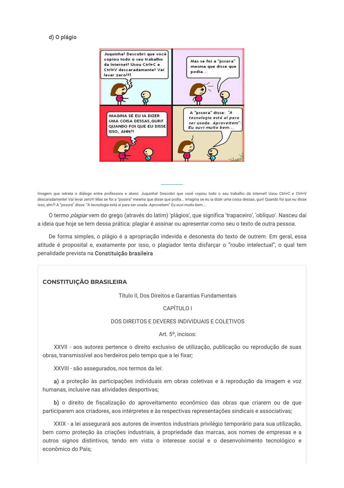 d) O plágio Fonte [2] Imagem que retrata o diálogo entre professora e aluno: Juquinha! Descobri que você copiou todo o seu trabalho da internet! Usou Ctrl+C e Ctrl+V descaradamente! Vai levar zero!!! Mas se foi a “pssora” mesma que disse que podia... Imagina se eu ia dizer uma coisa dessas, guri! Quando foi que eu disse isso, ahn?! A “pssora” disse: “A tecnologia está aí para ser usada. Aproveitem” Eu ouvi muito bem... O termo plagiar vem do grego (através do latim) 'plágios', que significa 'trapaceiro', 'oblíquo'. Nasceu daí a ideia que hoje se tem dessa prática: plagiar é assinar ou apresentar como seu o texto de outra pessoa. De forma simples, o plágio é a apropriação indevida e desonesta do texto de outrem. Em geral, essa atitude é proposital e, exatamente por isso, o plagiador tenta disfarçar o “roubo intelectual”, o qual tem penalidade prevista na Constituição brasileira CONSTITUIÇÃO BRASILEIRA Título II, Dos Direitos e Garantias Fundamentais CAPÍTULO I DOS DIREITOS E DEVERES INDIVIDUAIS E COLETIVOS Art. 5º, incisos: XXVII - aos autores pertence o direito exclusivo de utilização, publicação ou reprodução de suas obras, transmissível aos herdeiros pelo tempo que a lei fixar; XXVIII - são assegurados, nos termos da lei: a) a proteção às participações individuais em obras coletivas e à reprodução da imagem e voz humanas, inclusive nas atividades desportivas; b) o direito de fiscalização do aproveitamento econômico das obras que criarem ou de que participarem aos criadores, aos intérpretes e às respectivas representações sindicais e associativas; XXIX - a lei assegurará aos autores de inventos industriais privilégio temporário para sua utilização, bem como proteção às criações industriais, à propriedade das marcas, aos nomes de empresas e a outros signos distintivos, tendo em vista o interesse social e o desenvolvimento tecnológico e econômico do País; 147