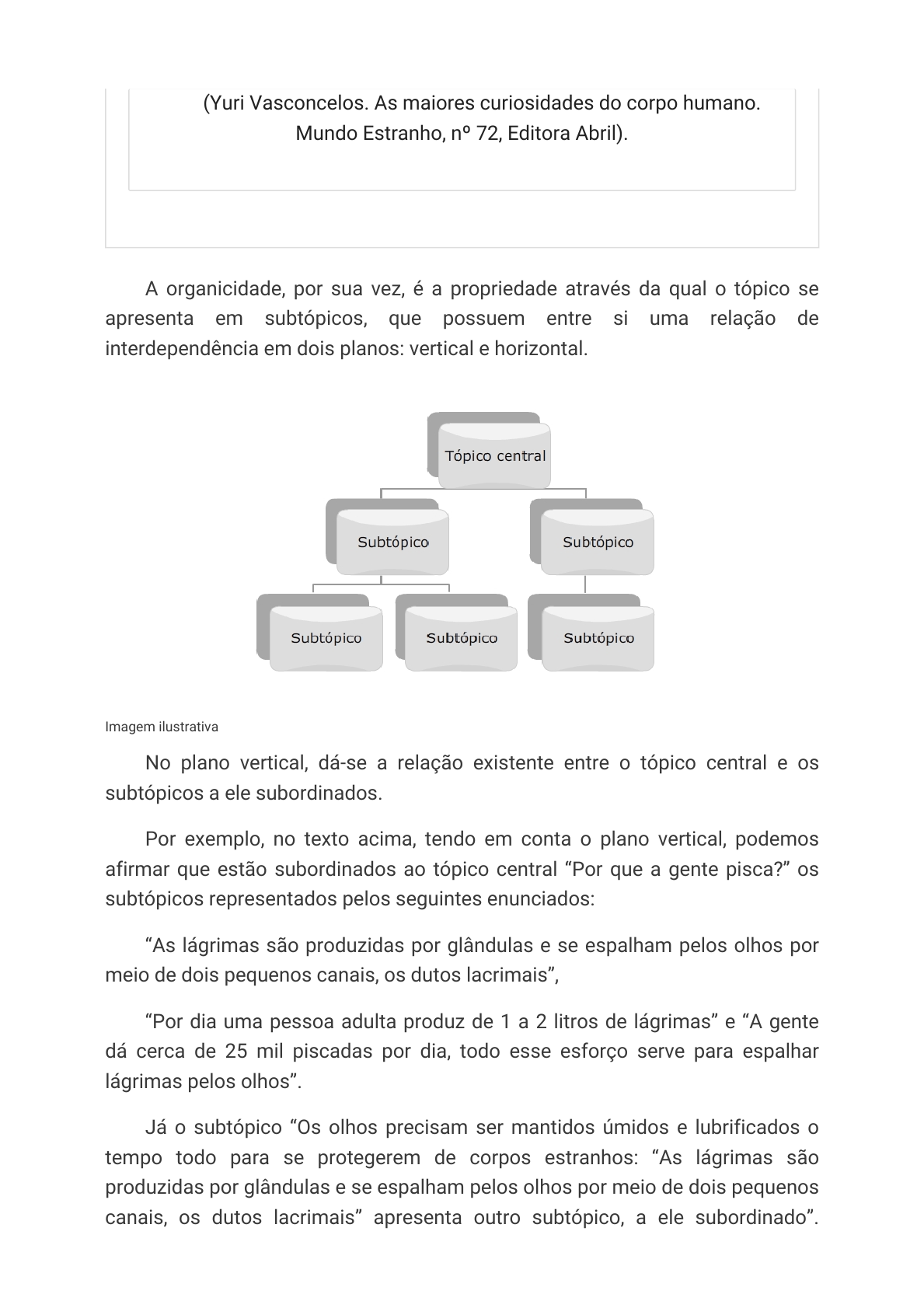 (Yuri Vasconcelos. As maiores curiosidades do corpo humano. Mundo Estranho, nº 72, Editora Abril). A organicidade, por sua vez, é a propriedade através da qual o tópico se apresenta em subtópicos, que possuem entre si uma relação de interdependência em dois planos: vertical e horizontal. Imagem ilustrativa No plano vertical, dá-se a relação existente entre o tópico central e os subtópicos a ele subordinados. Por exemplo, no texto acima, tendo em conta o plano vertical, podemos afirmar que estão subordinados ao tópico central “Por que a gente pisca?” os subtópicos representados pelos seguintes enunciados: “As lágrimas são produzidas por glândulas e se espalham pelos olhos por meio de dois pequenos canais, os dutos lacrimais”, “Por dia uma pessoa adulta produz de 1 a 2 litros de lágrimas” e “A gente dá cerca de 25 mil piscadas por dia, todo esse esforço serve para espalhar lágrimas pelos olhos”. Já o subtópico “Os olhos precisam ser mantidos úmidos e lubrificados o tempo todo para se protegerem de corpos estranhos: “As lágrimas são produzidas por glândulas e se espalham pelos olhos por meio de dois pequenos canais, os dutos lacrimais” apresenta outro subtópico, a ele subordinado”. 73
