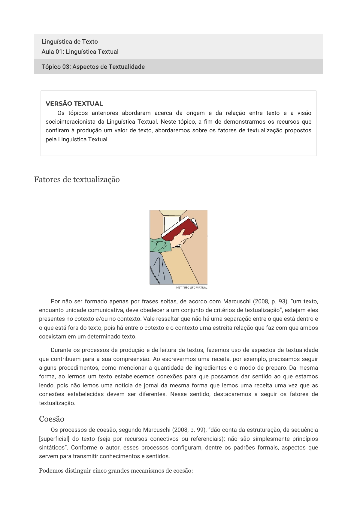 Linguística de Texto Aula 01: Linguística Textual Tópico 03: Aspectos de Textualidade VERSÃO TEXTUAL Os tópicos anteriores abordaram acerca da origem e da relação entre texto e a visão sociointeracionista da Linguística Textual. Neste tópico, a fim de demonstrarmos os recursos que confiram à produção um valor de texto, abordaremos sobre os fatores de textualização propostos pela Linguística Textual. Fatores de textualização Por não ser formado apenas por frases soltas, de acordo com Marcuschi (2008, p. 93), “um texto, enquanto unidade comunicativa, deve obedecer a um conjunto de critérios de textualização”, estejam eles presentes no cotexto e/ou no contexto. Vale ressaltar que não há uma separação entre o que está dentro e o que está fora do texto, pois há entre o cotexto e o contexto uma estreita relação que faz com que ambos coexistam em um determinado texto. Durante os processos de produção e de leitura de textos, fazemos uso de aspectos de textualidade que contribuem para a sua compreensão. Ao escrevermos uma receita, por exemplo, precisamos seguir alguns procedimentos, como mencionar a quantidade de ingredientes e o modo de preparo. Da mesma forma, ao lermos um texto estabelecemos conexões para que possamos dar sentido ao que estamos lendo, pois não lemos uma notícia de jornal da mesma forma que lemos uma receita uma vez que as conexões estabelecidas devem ser diferentes. Nesse sentido, destacaremos a seguir os fatores de textualização. Coesão Os processos de coesão, segundo Marcuschi (2008, p. 99), “dão conta da estruturação, da sequência [superficial] do texto (seja por recursos conectivos ou referenciais); não são simplesmente princípios sintáticos”. Conforme o autor, esses processos configuram, dentre os padrões formais, aspectos que servem para transmitir conhecimentos e sentidos. Podemos distinguir cinco grandes mecanismos de coesão: 6