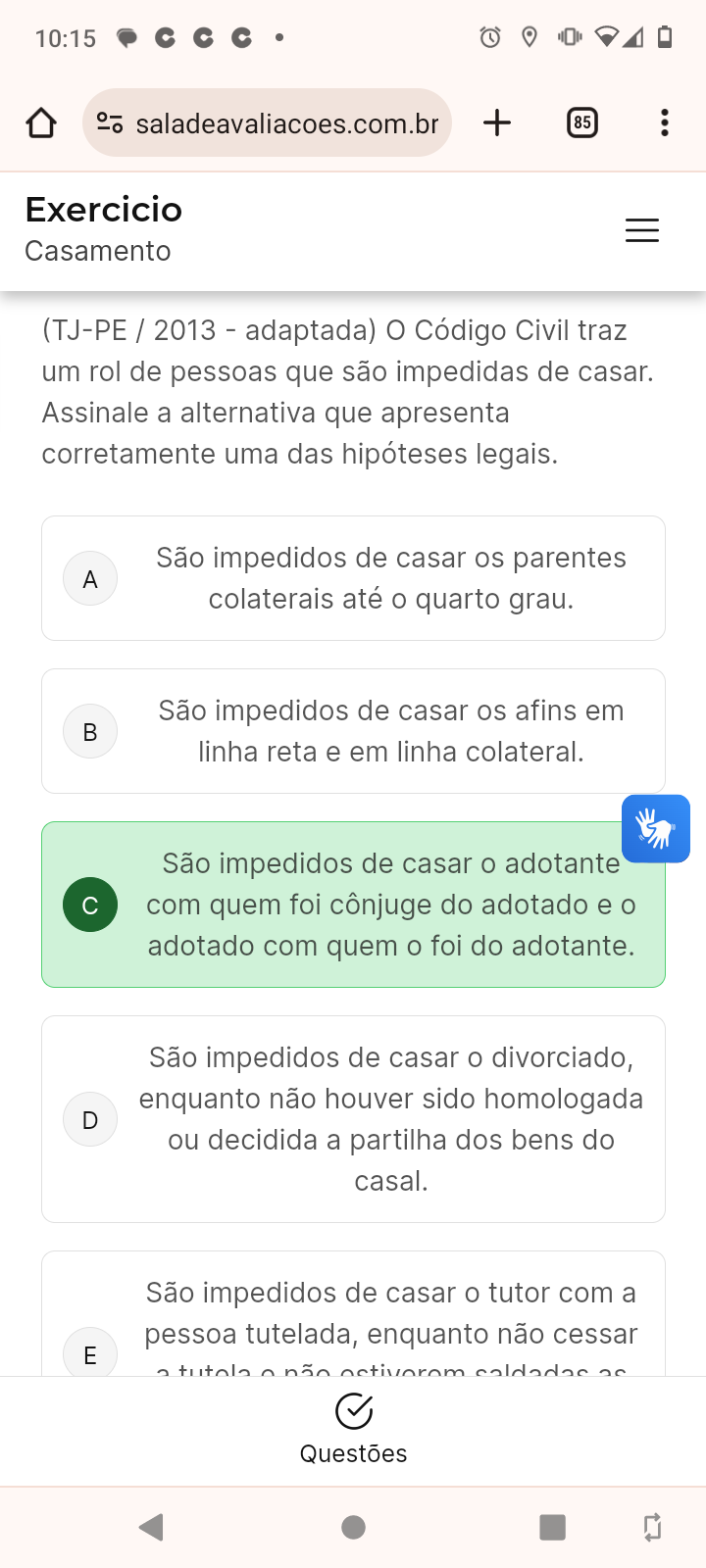 Código Civil traz um rol de pessoas que são impedidas de casar. Assinale a alternativa que apresenta corretamente uma das hipóteses legais. A. São impedidos de casar os parentes colaterais até o quarto grau. B. São impedidos de casar os afins em linha reta e em linha colateral. C. São impedidos de casar o adotante com quem foi cônjuge do adotado e o adotado com quem o foi do adotante. D. São impedidos de casar o divorciado, enquanto não houver sido homologada ou decidida a partilha dos bens do casal. E. São impedidos de casar o tutor com a pessoa tutelada, enquanto não cessar.