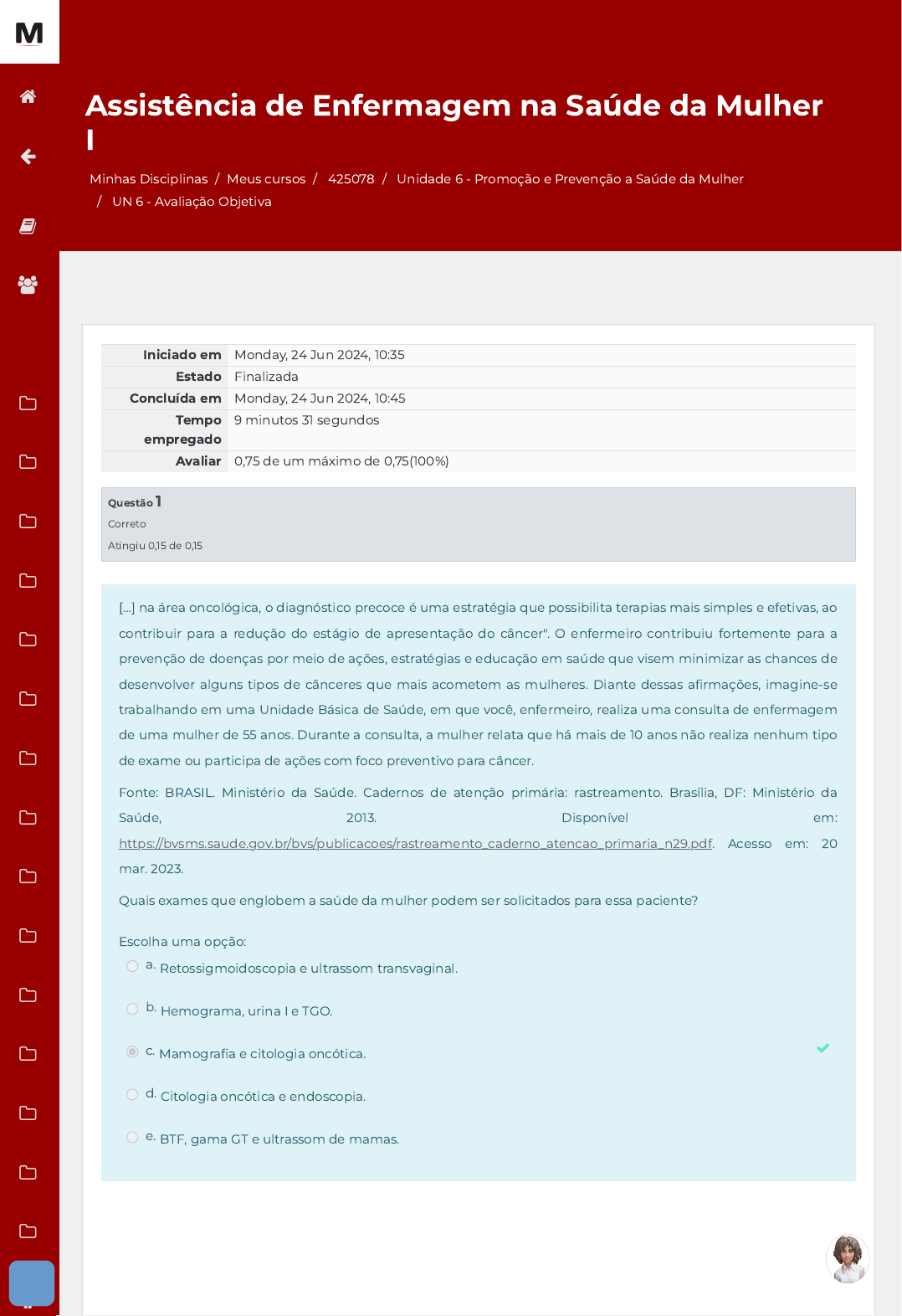 Minhas Disciplinas / Meus cursos / 425078 / Unidade 6 - Promoção e Prevenção a Saúde da Mulher / UN 6 - Avaliação Objetiva Assistência de Enfermagem na Saúde da Mulher I Iniciado em Monday, 24 Jun 2024, 10:35 Estado Finalizada Concluída em Monday, 24 Jun 2024, 10:45 Tempo empregado 9 minutos 31 segundos Avaliar 0,75 de um máximo de 0,75(100%) Questão 1 Correto Atingiu 0,15 de 0,15 […] na área oncológica, o diagnóstico precoce é uma estratégia que possibilita terapias mais simples e efetivas, ao contribuir para a redução do estágio de apresentação do câncer". O enfermeiro contribuiu fortemente para a prevenção de doenças por meio de ações, estratégias e educação em saúde que visem minimizar as chances de desenvolver alguns tipos de cânceres que mais acometem as mulheres. Diante dessas a�rmações, imagine-se trabalhando em uma Unidade Básica de Saúde, em que você, enfermeiro, realiza uma consulta de enfermagem de uma mulher de 55 anos. Durante a consulta, a mulher relata que há mais de 10 anos não realiza nenhum tipo de exame ou participa de ações com foco preventivo para câncer. Fonte: BRASIL. Ministério da Saúde. Cadernos de atenção primária: rastreamento. Brasília, DF: Ministério da Saúde, 2013. Disponível em: https://bvsms.saude.gov.br/bvs/publicacoes/rastreamento_caderno_atencao_primaria_n29.pdf. Acesso em: 20 mar. 2023. Quais exames que englobem a saúde da mulher podem ser solicitados para essa paciente? Escolha uma opção: a. Retossigmoidoscopia e ultrassom transvaginal. b. Hemograma, urina I e TGO. c. Mamogra�a e citologia oncótica. d. Citologia oncótica e endoscopia. e. BTF, gama GT e ultrassom de mamas. https://avap.multivix.edu.br/my/ https://avap.multivix.edu.br/course/view.php?id=26578 https://avap.multivix.edu.br/course/view.php?id=26578§ion=7 https://avap.multivix.edu.br/mod/quiz/view.php?id=1644802 https://bvsms.saude.gov.br/bvs/publicacoes/rastreamento_caderno_atencao_primaria_n29.pdf https://avap.multivix.edu.br/my/ https://avap.multivix.edu.br/course/view.php?id=26578 https://avap.multivix.edu.br/user/index.php?id=26578 https://avap.multivix.edu.br/course/view.php?id=26578§ion=1 https://avap.multivix.edu.br/course/view.php?id=26578§ion=2 https://avap.multivix.edu.br/course/view.php?id=26578§ion=3 https://avap.multivix.edu.br/course/view.php?id=26578§ion=4 https://avap.multivix.edu.br/course/view.php?id=26578§ion=5 https://avap.multivix.edu.br/course/view.php?id=26578§ion=6 https://avap.multivix.edu.br/course/view.php?id=26578§ion=7 https://avap.multivix.edu.br/course/view.php?id=26578§ion=8 https://avap.multivix.edu.br/course/view.php?id=26578§ion=9 https://avap.multivix.edu.br/course/view.php?id=26578§ion=10 https://avap.multivix.edu.br/course/view.php?id=26578§ion=11 https://avap.multivix.edu.br/course/view.php?id=26578§ion=12 https://avap.multivix.edu.br/course/view.php?id=26578§ion=13 https://avap.multivix.edu.br/course/view.php?id=26578§ion=14 https://avap.multivix.edu.br/course/view.php?id=26578§ion=15 https://avap.multivix.edu.br/hooks/portal/ https://avap.multivix.edu.br/ https://avap.multivix.edu.br/ https://avap.multivix.edu.br/ https://avap.multivix.edu.br/ https://avap.multivix.edu.br/ https://avap.multivix.edu.br/ Questão 2 Correto Atingiu 0,15 de 0,15 O câncer de mama é o tipo de câncer mais comum entre as mulheres no mundo e no Brasil, �cando atrás somente do câncer de pele não melanoma. Corresponde, atualmente, há cerca de 28% dos casos novos de câncer em mulheres. Também acomete homens, porém o aparecimento neles representa menos de 1% do total de casos da doença. Fonte: BRASIL. Ministério da saúde. Boletim temático da biblioteca do Ministério da Saúde: prevenção ao câncer de mama. Brasília, DF: Ministério da Saúde, 2021. Disponível em: https://bvsms.saude.gov.br/bvs/boletim_tematico/prevencao_cancer_mama_outubro_2021.pdf. Acesso em: 19 mar. 2023. Quais orientações acerca da doença você daria para uma paciente que procura a Unidade Básica de Saúde? Assinale a alternativa correta. Escolha uma opção: a. A realização correta e periódica do autoexame das mamas exclui a necessidade de realização de outros exames diagnósticos. b. O acometimento por câncer de mama só se dará em pessoas com histórico familiar da doença. c. Próteses de silicone nas mamas são consideradas fatores de risco para o câncer de mama. d. O uso de anticoncepcionais é considerado fator de proteção contra o câncer de mama. e. O aleitamento materno é considerado fator de proteção contra o câncer de mama. https://bvsms.saude.gov.br/bvs/boletim_tematico/prevencao_cancer_mama_outubro_2021.pdf https://avap.multivix.edu.br/my/ https://avap.multivix.edu.br/course/view.php?id=26578 https://avap.multivix.edu.br/user/index.php?id=26578 https://avap.multivix.edu.br/course/view.php?id=26578§ion=1 https://avap.multivix.edu.br/course/view.php?id=26578§ion=2 https://avap.multivix.edu.br/course/view.php?id=26578§ion=3 https://avap.multivix.edu.br/course/view.php?id=26578§ion=4 https://avap.multivix.edu.br/course/view.php?id=26578§ion=5 https://avap.multivix.edu.br/course/view.php?id=26578§ion=6 https://avap.multivix.edu.br/course/view.php?id=26578§ion=7 https://avap.multivix.edu.br/course/view.php?id=26578§ion=8 https://avap.multivix.edu.br/course/view.php?id=26578§ion=9 https://avap.multivix.edu.br/course/view.php?id=26578§ion=10 https://avap.multivix.edu.br/course/view.php?id=26578§ion=11 https://avap.multivix.edu.br/course/view.php?id=26578§ion=12 https://avap.multivix.edu.br/course/view.php?id=26578§ion=13 https://avap.multivix.edu.br/course/view.php?id=26578§ion=14 https://avap.multivix.edu.br/course/view.php?id=26578§ion=15 https://avap.multivix.edu.br/hooks/portal/ https://avap.multivix.edu.br/ https://avap.multivix.edu.br/ https://avap.multivix.edu.br/ https://avap.multivix.edu.br/ https://avap.multivix.edu.br/ https://avap.multivix.edu.br/ Questão 3 C