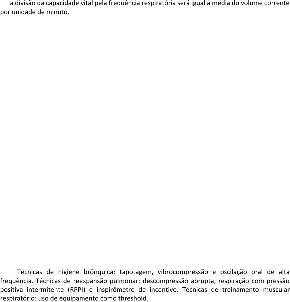 1) A ventilometria é uma técnica de avaliação pulmonar mecânica cujos objetivos são medir o volume minuto, o volume corrente e a relação entre a frequência respiratória e o volume corrente, em litros. Sobre essa técnica é correto afirmar que: (A) a capacidade vital pode ser verificada solicitando ao paciente que realize uma expiração profunda, partindo de uma inspiração breve. (B) a divisão da capacidade vital pela frequência respiratória será igual à média do volume corrente por unidade de minuto. (C) a divisão do volume minuto pela frequência respiratória será igual à média do volume corrente por unidade de minuto. (D) o aparelho indicará a frequência respiratória atingida em cada minuto e o volume corrente deve ser contado em cada minuto. 2)A fisioterapia respiratória inclui uma variedade de modalidades de tratamento destinadas a prevenir ou corrigir alguma disfunção pulmonar instalada. O fisioterapeuta deve avaliar o paciente, determinar a técnica, iniciar a terapêutica mais eficaz e apropriada. As técnicas de fisioterapia respiratória são classificadas de acordo com o objetivo do tratamento em: higiene brônquica, reexpansão pulmonar e treinamento muscular respiratório. Quais são os procedimentos (técnicas) adequados para cada classificação? a) Técnicas de higiene brônquica: tapotagem, vibrocompressão e respiração com pressão positiva intermitente (RPPI). Técnicas de reexpansão pulmonar: bloqueio, descompressão abrupta e inspirômetro de incentivo. Técnicas de treinamento muscular respiratório: equipamento como threshold e Flutter. b) Técnicas de higiene brônquica: tapotagem, vibrocompressão e drenagem postural. Técnicas de reexpansão pulmonar: descompressão abrupta, respiração com pressão positiva intermitente (RPPI) e Flutter. Técnicas de treinamento muscular respiratório: equipamento como threshold e inspirômetro de incentivo. c) Técnicas de higiene brônquica: tapotagem, drenagem postural e oscilação oral de alta frequência. Técnicas de reexpansão pulmonar: descompressão abrupta e inspirômetro de incentivo. Técnicas de treinamento muscular respiratório: respiração com pressão positiva intermitente (RPPI) e uso de equipamento como threshold. d) Técnicas de higiene brônquica: tapotagem, vibrocompressão e oscilação oral de alta frequência. Técnicas de reexpansão pulmonar: descompressão abrupta, respiração com pressão positiva intermitente (RPPI) e inspirômetro de incentivo. Técnicas de treinamento muscular respiratório: uso de equipamento como threshold e bloqueio. e) Técnicas de higiene brônquica: tapotagem, vibrocompressão e oscilação oral de alta frequência. Técnicas de reexpansão pulmonar: descompressão abrupta, respiração com pressão positiva intermitente (RPPI) e inspirômetro de incentivo. Técnicas de treinamento muscular respiratório: uso de equipamento como threshold. janin Realce janin Lápis janin Lápis janin Realce 3)Um paciente do sexo masculino de 74 anos de idade está internado na enfermaria de uma unidade hospitalar, no 3º pós-operatório (PO) de laparotomia. Apresenta-se consciente, orientado e colaborativo. Mantém-se eupneico em ar ambiente, com saturação de hemoglobina em 96%, hemodinamicamente estável. A radiografia de tórax posteroanterior, apresentada abaixo, revelou área de atelectasias laminares na base do hemitórax esquerdo. A ausculta pulmonar revela diminuição discreta do murmúrio vesicular nas bases, sem ruídos adventícios. Considerando que as complicações respiratórias são responsáveis por aproximadamente 40% dos óbitos que ocorrem em pacientes com idade superior a 65 anos com alterações da função pulmonar após procedimento cirúrgico, a terapêutica adequada para o atendimento desse paciente deverá ser a: a) utilização das técnicas de reexpansão pulmonar. b) utilização de técnicas de fortalecimento muscular. c) aplicação de manobras torácicas de desobstrução brônquica. d) aplicação de técnica de desobstrução das vias aéreas superiores. e) utilização da cinesioterapia passiva dos membros superiores e inferiores. 4) A tosse é um ato reflexo que também pode ser reproduzido e controlado de forma voluntária. Correspondem às fases da tosse, na ordem em que ocorrem: a) irritação – expulsão – propulsão – eliminação b) propulsão – deslocamento – impulsão – eliminação c) irritação – inspiração – compressão – expulsão d) inspiração – irritação – aceleração – expectoração e) inspiração – propulsão – expulsão – eliminação janin Realce janin Lápis janin Realce 5) O huffing é considerado uma técnica de expiração forçada, na qual ocorre com a combinação da com a glote aberta. Dessa forma, é correto afirmar que: a) o huffing pode promover colapso das vias aéreas, e por isso não promove mobilização de secreções. b) o huffing a baixos volumes pulmonares mobiliza a secreção mais periférica das vias aéreas. c) o huffing a baixos volumes pulmonares mobiliza a secreção mais proximal das vias aéreas. d) o huffing não promove mobilização de secreções, sendo, portanto, considerada apenas como exercício de treinamento muscular respiratório. e) o huffing a altos volumes pulmonares mobiliza a secreção mais periférica das vias aéreas. 6) Paciente, 48 anos, em PO laparotomia exploratória, iniciou terapia com threshold IMT em 12 cmH2O, ou seja, com 30% da força muscular. Pode-se dizer que o paciente apresenta uma PImax de a) 40 cmH2O, ou seja, fraqueza muscular. b) 24 cmH2O, ou seja, falência muscular. c) 54 cmH2O, ou seja, fraqueza muscular. d) 36 cmH2O, ou seja, fraqueza muscular. e) 45 cmH2O, ou seja, fadiga muscular. 7) Paciente P.R.D, masculino, 70 anos, com história de doença pulmonar obstrutiva crônica. Analise os dados obtidos através da avaliação da força muscular. PIMax -40 cmH2O e PE +45 cmH2O. Sobre esta situa