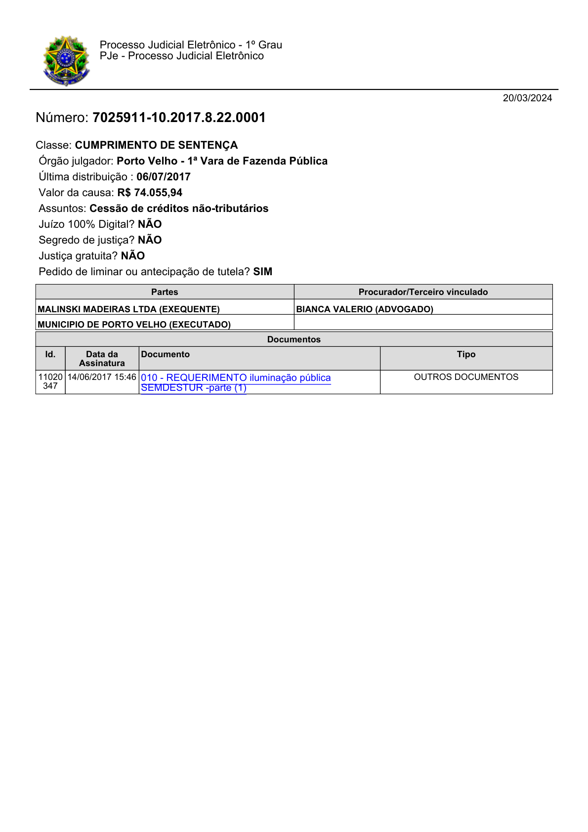20/03/2024 Número: 7025911-10.2017.8.22.0001 Classe: CUMPRIMENTO DE SENTENÇA Órgão julgador: Porto Velho - 1ª Vara de Fazenda Pública Última distribuição : 06/07/2017 Valor da causa: R$ 74.055,94 Assuntos: Cessão de créditos não-tributários Juízo 100% Digital? NÃO Segredo de justiça? NÃO Justiça gratuita? NÃO Pedido de liminar ou antecipação de tutela? SIM Processo Judicial Eletrônico - 1º Grau PJe - Processo Judicial Eletrônico Partes Procurador/Terceiro vinculado MALINSKI MADEIRAS LTDA (EXEQUENTE) BIANCA VALERIO (ADVOGADO) MUNICIPIO DE PORTO VELHO (EXECUTADO) Documentos Id. Data da Assinatura Documento Tipo 11020 347 14/06/2017 15:46 010 - REQUERIMENTO iluminação pública SEMDESTUR -parte (1) OUTROS DOCUMENTOS EXCELENTÍSSIMO SENHOR ANTÔNIO GERALDO AFONSO Secretário Municipal de Desenvolvimento Socioeconômico e Turismo – Semdestur PORTO VELHO – RO MALINSKI MADEIRAS LTDA, pessoa jurídica de direito privado, inscrita no CNPJ sob nº 97.493.373/0008-50, com endereço na Av. Francisco Chiquilito Erse – Distrito Industrial – Porto Velho - Rondônia, neste ato representada pelo seu sócio proprietário PAULO VICENTE MALINSKI, brasileiro, empresário, inscrito no CPF/MF sob o nº 433.787.570-00, residente e domiciliado na cidade de Curitibanos, estado de Santa Catarina, vem por meio do presente REQUERER que seja realizado a instalação de luminárias e rede de iluminação pública no acesso a empresa localizada no referido endereço, junto a área Industrial. Como se observa no relatório e informações em anexo ao presente pedido, a empresa ora requerente, vem realizando a implantação de uma nova Unidade Industrial nesta cidade de Porto Velho, sendo que irá investir cerca de R$ 45 milhões na referida unidade. Ocorre que o local carece de serviços públicos, como água, pavimentação e até mesmo a rede de energia elétrica teve que ser custeada pela empresa. Assim, se requer que a Prefeitura Municipal promova melhorias na estrada de acesso ao local e realize a instalação de Iluminação Pública até o local, hoje totalmente desprovida. Esperando o atendimento do presente pedido, subscrevemos, o presente, deixando e-mail de contatos: paulo@malinski.com.br e ricardo@malinski.com.br Nestes termos pede e espera deferimento. Porto Velho(RO), 15 de julho de 2016 MALINSKI MADEIRAS LTDA CNPJ/MF nº 97.493.373/0001-83 PAULO VICENTE MALINSKI CPF/MF nº 433.787.570-00 Num. 11020347 - Pág. 1 OXBXWWdSUmpPNHRQZGtPTE5VMzhPcEJ6NmxDeUdQT3l0bmhxSjlGRVRFbXJGT0ZYLzJnWEVpVTZjUzBPQ0pZcWNDdnVoZUl3NmlJPQ== Assinado eletronicamente por: BIANCA VALERIO - 14/06/2017 15:47:01 https://pjepg.tjro.jus.br:443/Processo/ConsultaDocumento/listView.seam?x=17061415453939900000010261123 Número do documento: 17061415453939900000010261123 DEMONSTRATIVO DO TRECHO E LOCALIZAÇÃO ÁREA INDUSTRIAL VIA PÚBLICA SEM ILUMINAÇÃO (distância de 1.000 m) Num. 11020347 - Pág. 2 OXBXWWdSUmpPNHRQZGtPTE5VMzhPcEJ6NmxDeUdQT3l0bmhxSjlGRVRFbXJGT0ZYLzJnWEVpVTZjUzBPQ0pZcWNDdnVoZUl3NmlJPQ== Assinado eletronicamente por: BIANCA VALERIO - 14/06/2017 15:47:01 https://pjepg.tjro.jus.br:443/Processo/ConsultaDocumento/listView.seam?x=17061415453939900000010261123 Número do documento: 17061415453939900000010261123 DEMONSTRATIVO FOTOGRÁFICO DOS INVESIMENTOS JÁ REALIZADOS NA ÁREA Vista da Área no advento de seu recebimento pela MALINSKI Num. 11020347 - Pág. 3 OXBXWWdSUmpPNHRQZGtPTE5VMzhPcEJ6NmxDeUdQT3l0bmhxSjlGRVRFbXJGT0ZYLzJnWEVpVTZjUzBPQ0pZcWNDdnVoZUl3NmlJPQ== Assinado eletronicamente por: BIANCA VALERIO - 14/06/2017 15:47:01 https://pjepg.tjro.jus.br:443/Processo/ConsultaDocumento/listView.seam?x=17061415453939900000010261123 Número do documento: 17061415453939900000010261123 Vista da área no início da Implantação com destaque para o Acesso (como era o Logradouro) Operação de Supressão da cobertura da Área Operação de Limpeza Mecanizada da Área Num. 11020347 - Pág. 4 OXBXWWdSUmpPNHRQZGtPTE5VMzhPcEJ6NmxDeUdQT3l0bmhxSjlGRVRFbXJGT0ZYLzJnWEVpVTZjUzBPQ0pZcWNDdnVoZUl3NmlJPQ== Assinado eletronicamente por: BIANCA VALERIO - 14/06/2017 15:47:01 https://pjepg.tjro.jus.br:443/Processo/ConsultaDocumento/listView.seam?x=17061415453939900000010261123 Número do documento: 17061415453939900000010261123 Operação de Limpeza Mecanizada da Área Num. 11020347 - Pág. 5 OXBXWWdSUmpPNHRQZGtPTE5VMzhPcEJ6NmxDeUdQT3l0bmhxSjlGRVRFbXJGT0ZYLzJnWEVpVTZjUzBPQ0pZcWNDdnVoZUl3NmlJPQ== Assinado eletronicamente por: BIANCA VALERIO - 14/06/2017 15:47:01 https://pjepg.tjro.jus.br:443/Processo/ConsultaDocumento/listView.seam?x=17061415453939900000010261123 Número do documento: 17061415453939900000010261123 Operação de Terraplenagem (Lançamento de material argiloso) Num. 11020347 - Pág. 6 OXBXWWdSUmpPNHRQZGtPTE5VMzhPcEJ6NmxDeUdQT3l0bmhxSjlGRVRFbXJGT0ZYLzJnWEVpVTZjUzBPQ0pZcWNDdnVoZUl3NmlJPQ== Assinado eletronicamente por: BIANCA VALERIO - 14/06/2017 15:47:01 https://pjepg.tjro.jus.br:443/Processo/ConsultaDocumento/listView.seam?x=17061415453939900000010261123 Número do documento: 17061415453939900000010261123 Operação de Escavação e Carga de material argiloso (No local se formará lago para captação e armazenamento de águas pluviais) Num. 11020347 - Pág. 7 OXBXWWdSUmpPNHRQZGtPTE5VMzhPcEJ6NmxDeUdQT3l0bmhxSjlGRVRFbXJGT0ZYLzJnWEVpVTZjUzBPQ0pZcWNDdnVoZUl3NmlJPQ== Assinado eletronicamente por: BIANCA VALERIO - 14/06/2017 15:47:01 https://pjepg.tjro.jus.br:443/Processo/ConsultaDocumento/listView.seam?x=17061415453939900000010261123 Número do documento: 17061415453939900000010261123 Operação de Formação de Corpo de Aterro (Movimento de Terra) Operação de Controle e Acompanhamento do Lançamento de Terra em Camadas Num. 11020347 - Pág. 8 OXBXWWdSUmpPNHRQZGtPTE5VMzhPcEJ6NmxDeUdQT3l0bmhxSjlGRVRFbXJGT0ZYLzJnWEVpVTZjUzBPQ0pZcWNDdnVoZUl3NmlJPQ== Assinado eletronicamente por: BIANCA VALERIO - 14/06/2017 15:47:01 https://pjepg.tjro.jus.br:443/Processo/ConsultaDocumento/listView.seam?x=1706141545393990000001026112