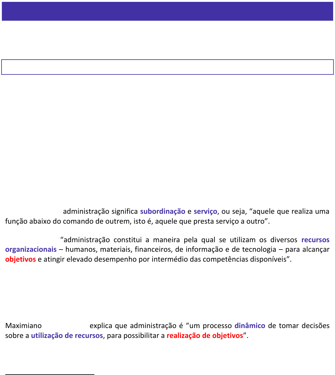 CONCEITOS FUNDAMENTAIS E INTRODUTÓRIOS Nesta aula, veremos diversos conceitos introdutórios que servirão de base para todo o nosso curso. 1 - O que é Administração? Nada mais natural do que começarmos nosso curso entendendo o que é administração. Administrar, meu amigo, é algo muito natural. Todos nós somos administradores. Imagino que no seu dia-a-dia você deva ter de administrar seu tempo (separar horas de estudo, de trabalho, de sono...), seu dinheiro (separar dinheiro para pagar contas, comprar comida, comprar roupas...), e, até mesmo, algumas pessoas tem de administrar outras pessoas (quem tem filho pequeno precisa administrar a hora da criança comer, fazer o dever de casa, tomar banho...). Pois é, em algum momento, todos nós somos administradores. Vamos trazer, agora, nosso foco para o ambiente organizacional. Nesse momento, gostaria de lhe apresentar o conceito de administração na visão de dois importantes doutrinadores brasileiros. Para Chiavenato, administração significa subordinação e serviço, ou seja, “aquele que realiza uma função abaixo do comando de outrem, isto é, aquele que presta serviço a outro”.1 Segundo ele, a “administração constitui a maneira pela qual se utilizam os diversos recursos organizacionais – humanos, materiais, financeiros, de informação e de tecnologia – para alcançar objetivos e atingir elevado desempenho por intermédio das competências disponíveis”.2 Administrar, para Chiavenato, “não significa executar tarefas ou operações, mas sim fazer com que elas sejam executadas por outras pessoas em conjunto. O administrador não é aquele que faz, mas sim o que faz fazer. A administração faz as coisas acontecerem por meio das pessoas para conduzir as organizações ao sucesso”.3 Maximiano, por sua vez, explica que administração é “um processo dinâmico de tomar decisões sobre a utilização de recursos, para possibilitar a realização de objetivos”.4 1 CHIAVENATO, Idalberto. Administração para não administradores: a gestão de negócios ao alcance de todos, 2ª edição. Barueri, Manole: 2011, p. 13. 2 CHIAVENATO, Idalberto. Administração nos novos tempos: os novos horizontes em administração, 3ª edição. Barueri, Manole: 2014, p. 4. 3 Id., 2014, p. 4. 4 MAXIMIANO, Antonio Cesar Amaru. Introdução à Adminstração, 8ª edição. São Paulo, Atlas: 2011, p. 12 Késia Késia Késia Késia Chiavenato reúne uma série de conceitos de administração, na visão de diversos renomados autores. Vejamos: -Administração é o processo de planejar, organizar, liderar e controlar o trabalho dos membros organizacionais e de utilizar todos os seus recursos disponíveis para alcançar objetivos organizacionais estabelecidos5. -Administração é o processo de alcançar objetivos pelo trabalho com e por intermédio de pessoas e outros recursos organizacionais6. -Administração é o processo de planejar, organizar, liderar e controlar o uso de recursos para alcançar objetivos de desempenho7. -Administração é o alcance de objetivos organizacionais de maneira eficaz e eficiente graças ao planejamento, à organização, à liderança e ao controle dos recursos organizacionais8. -Administração é o ato de trabalhar com e por intermédio de outras pessoas para realizar os objetivos da organização, bem como de seus membros9. -Administração envolve atividades compreendidas por uma ou mais pessoas no sentido de coordenar as atividades das outras para perseguir fins que não podem ser alcançados por uma só10. 5 James A. F. Stoner, R. Edward Freeman, Daniel A. Gil- bert Jr. Management. Englewood Cliffs, Prentice Hall, 1995, p. 7-9 apud CHIAVENATO, Idalberto. Administração nos novos tempos: os novos horizontes em administração, 3ª edição. Barueri, Manole: 2014, p. 29. 6 Samuel C.Certo. Modern management: diversity, quali- ty, ethics, and the global environment. Boston, Allyn & Bacon, 1994, p. 6. apud Id., 2014, p. 29. 7 John R. Schermerhorn, Jr. Management. Nova York, John Wiley & Sons, 1996, p. 5. apud CHIAVENATO, Idalberto. Administração nos novos tempos: os novos horizontes em administração, 3ª edição. Barueri, Manole: 2014, p. 29. 8 Richard L. Daft. Management. Fort Worth, The Dryden, 1993, p. G6. apud Id., 2014, p. 29. 9 Patrick J. Montana, Bruce H. Charnov. Administração. São Paulo, Saraiva, 2003, p. 2. apud Id., 2014, p. 29. 10 James L. Donnelly, John M. Gibson, James H. Ivancevich. Organizac ̧ões: comportamento, estrutura, processos. São Paulo, Atlas, 1986. apud Id., 2014, p. 29. LEITURA OBRIGATÓRIA! Você não precisa decorar todos esses conceitos. Só quero que você perceba que todos eles convergem para um mesmo sentido, qual seja: Administração é a utilização de todos os recursos organizacionais (pessoas, equipamentos, dinheiro, etc.), de forma planejada, organizada, dirigida e controlada, para o alcance dos objetivos da organização, que não poderiam ser alcançados por uma só pessoa (de forma autônoma). Para finalizamos, também gostaria de trazer a visão de administração para Henry Mintzberg, outro autor que é bastante consagrado pelas bancas organizadoras. Para ele, administração pode ser vista dentro de um triângulo no qual a arte, a habilidade prática e a utilização da ciência se encontram. A arte traz as ideias e a integração (o administrador deve interpretar cada situação, de forma criativa e inovadora); a habilidade prática faz as conexões, alicerçadas em experiências tangíveis (é a aplicação prática das teorias cientificas); e a ciência utiliza a análise sistemática do conhecimento para criar a ordem (a administração repousa em fundamentos científicos; analisa-se metódica e sistematicamente os fatos e evidências; são definidas as relações de “causa e efeito”).11 11 MINTZBERG, Henry. Managing: desvendando o dia a dia da gestão / Tradução: Francisco Araújo da Costa / Revisão Técnica: Roberto Fachin, 4ª
