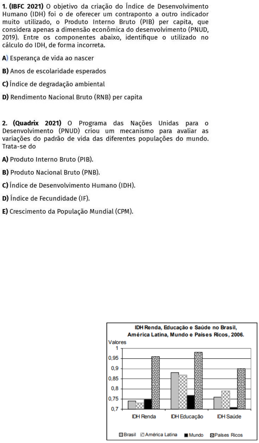 ATIVIDADES NÚCLEO DE INOVAÇÃO MATEMÁTICA E SABERES E INVESTIGAÇÃO DA NATUREZA 3) Assinale abaixo um critério utilizado para classificar o nível de desenvolvimento de um país: A) densidade demográfica B) produto interno bruto C) saldo total de migração D) taxa de analfabetismo E) índice de endividamento 4) Qual dos aspectos abaixo remete a uma característica de um país desenvolvido? A) Presença crescente de emigração B) Acentuado índice de fecundidade C) Ocorrência de crises migratórias D) Crescente fenômeno de xenofobia E) Elevado nível de industrialização 5) Observe o gráfico a seguir. O índice de desenvolvimento humano (IDH) sintetiza indicadores como renda, saúde e educação, com o objetivo de aferir a qualidade de vida da população de um determinado lugar. Tendo por referência a leitura e interpretação do gráfico, verifica-se que o IDH relativo à saúde no Brasil é A)menor do que o IDH renda e maior do que o IDH educação do Brasil, o qual tem IDH de, aproximadamente, 0,88. B) menor do que o do mundo e maior do que o da América Latina, cujo IDH é de, aproximadamente, 0,79. C) maior do que o da América Latina e menor do que o do mundo, o qual tem IDH de, aproximadamente, 0,71. D) maior do que o do mundo e menor do que o dos países ricos, cujo IDH é de, aproximadamente, 0,9. E) maior do que o IDH renda dos países ricos e do que o IDH educação do mundo, o qual tem IDH de, aproximadamente, 0,77. 6) O Índice de Desenvolvimento Humano (IDH) é uma medida comparativa usada para classificar a qualidade de vida oferecida por um país aos seus habitantes, levando em consideração três dimensões básicas do desenvolvimento humano: renda, educação e saúde. O IDH vai de 0 a 1. Quanto mais próximo de 1, mais desenvolvido é o país. Analise a tabela a seguir: Pode-se concluir corretamente que A - a Etiópia, por contar com qualidade nos serviços de saúde e de saneamento ambiental, ampliou a expectativa de vida de seus habitantes. B - o Zimbábue apresenta a média de anos de escolaridade igual à do Brasil e tem o Rendimento Nacional Bruto superior ao da Etiópia. C - Cuba, apesar de ter o rendimento nacional bruto elevado, não investe no setor educacional e na saúde de sua população. D - a Noruega tem a maior classificação no IDH por, entre outros fatores, garantir vários anos de escolaridade para seus habitantes.