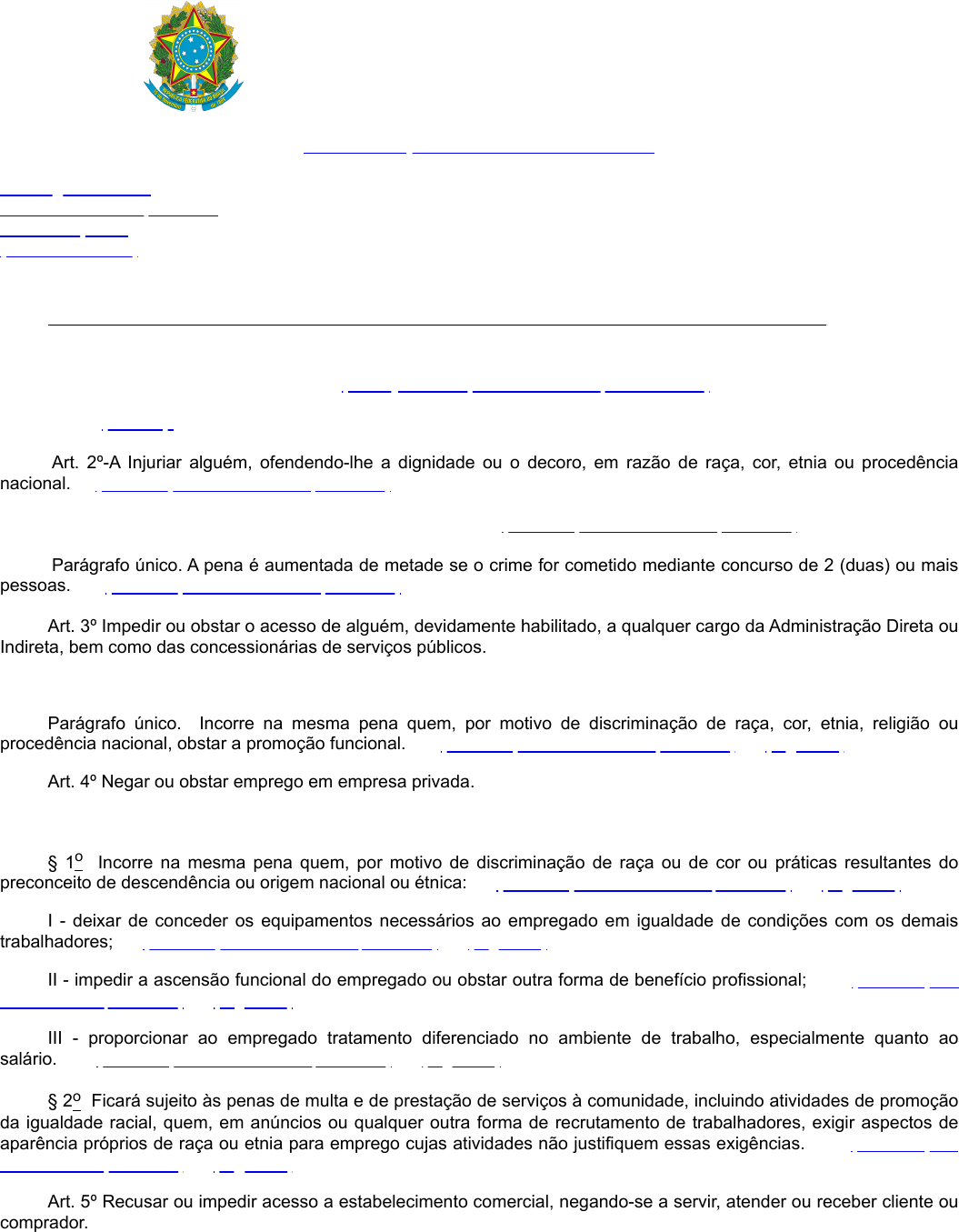 Presidência da República Casa Civil Subchefia para Assuntos Jurídicos LEI Nº 7.716, DE 5 DE JANEIRO DE 1989. Mensagem de veto Vide Lei nº 12.735, de 2012 Texto compilado (Vide ADO Nº 26) Define os crimes resultantes de preconceito de raça ou de cor. O PRESIDENTE DA REPÚBLICA, faço saber que o Congresso Nacional decreta e eu sanciono a seguinte Lei: Art. 1º Serão punidos, na forma desta Lei, os crimes resultantes de preconceitos de raça ou de cor. Art. 1º Serão punidos, na forma desta Lei, os crimes resultantes de discriminação ou preconceito de raça, cor, etnia, religião ou procedência nacional. (Redação dada pela Lei nº 9.459, de 15/05/97) Art. 2º (Vetado). Art. 2º-A Injuriar alguém, ofendendo-lhe a dignidade ou o decoro, em razão de raça, cor, etnia ou procedência nacional. (Incluído pela Lei nº 14.532, de 2023) Pena: reclusão, de 2 (dois) a 5 (cinco) anos, e multa. (Incluído pela Lei nº 14.532, de 2023) Parágrafo único. A pena é aumentada de metade se o crime for cometido mediante concurso de 2 (duas) ou mais pessoas. (Incluído pela Lei nº 14.532, de 2023) Art. 3º Impedir ou obstar o acesso de alguém, devidamente habilitado, a qualquer cargo da Administração Direta ou Indireta, bem como das concessionárias de serviços públicos. Pena: reclusão de dois a cinco anos. Parágrafo único. Incorre na mesma pena quem, por motivo de discriminação de raça, cor, etnia, religião ou procedência nacional, obstar a promoção funcional. (Incluído pela Lei nº 12.288, de 2010) (Vigência) Art. 4º Negar ou obstar emprego em empresa privada. Pena: reclusão de dois a cinco anos. § 1o Incorre na mesma pena quem, por motivo de discriminação de raça ou de cor ou práticas resultantes do preconceito de descendência ou origem nacional ou étnica: (Incluído pela Lei nº 12.288, de 2010) (Vigência) I - deixar de conceder os equipamentos necessários ao empregado em igualdade de condições com os demais trabalhadores; (Incluído pela Lei nº 12.288, de 2010) (Vigência) II - impedir a ascensão funcional do empregado ou obstar outra forma de benefício profissional; (Incluído pela Lei nº 12.288, de 2010) (Vigência) III - proporcionar ao empregado tratamento diferenciado no ambiente de trabalho, especialmente quanto ao salário. (Incluído pela Lei nº 12.288, de 2010) (Vigência) § 2o Ficará sujeito às penas de multa e de prestação de serviços à comunidade, incluindo atividades de promoção da igualdade racial, quem, em anúncios ou qualquer outra forma de recrutamento de trabalhadores, exigir aspectos de aparência próprios de raça ou etnia para emprego cujas atividades não justifiquem essas exigências. (Incluído pela Lei nº 12.288, de 2010) (Vigência) Art. 5º Recusar ou impedir acesso a estabelecimento comercial, negando-se a servir, atender ou receber cliente ou comprador. Pena: reclusão de um a três anos. Art. 6º Recusar, negar ou impedir a inscrição ou ingresso de aluno em estabelecimento de ensino público ou privado de qualquer grau. Pena: reclusão de três a cinco anos. Parágrafo único. Se o crime for praticado contra menor de dezoito anos a pena é agravada de 1/3 (um terço). http://legislacao.planalto.gov.br/legisla/legislacao.nsf/Viw_Identificacao/lei%207.716-1989?OpenDocument https://www.planalto.gov.br/ccivil_03/leis/Mensagem_Veto/anterior_98/VEP-LEI-7716-1989.pdf https://www.planalto.gov.br/ccivil_03/_Ato2011-2014/2012/Lei/L12735.htm https://www.planalto.gov.br/ccivil_03/leis/L7716compilado.htm https://portal.stf.jus.br/processos/detalhe.asp?incidente=4515053 https://www.planalto.gov.br/ccivil_03/leis/L9459.htm#art1 https://www.planalto.gov.br/ccivil_03/leis/Mensagem_Veto/anterior_98/VEP-LEI-7716-1989.pdf https://www.planalto.gov.br/ccivil_03/_Ato2023-2026/2023/Lei/L14532.htm#art1 https://www.planalto.gov.br/ccivil_03/_Ato2023-2026/2023/Lei/L14532.htm#art1 https://www.planalto.gov.br/ccivil_03/_Ato2023-2026/2023/Lei/L14532.htm#art1 https://www.planalto.gov.br/ccivil_03/_Ato2007-2010/2010/Lei/L12288.htm#art60 https://www.planalto.gov.br/ccivil_03/_Ato2007-2010/2010/Lei/L12288.htm#art65 https://www.planalto.gov.br/ccivil_03/_Ato2007-2010/2010/Lei/L12288.htm#art60 https://www.planalto.gov.br/ccivil_03/_Ato2007-2010/2010/Lei/L12288.htm#art65 https://www.planalto.gov.br/ccivil_03/_Ato2007-2010/2010/Lei/L12288.htm#art60 https://www.planalto.gov.br/ccivil_03/_Ato2007-2010/2010/Lei/L12288.htm#art65 https://www.planalto.gov.br/ccivil_03/_Ato2007-2010/2010/Lei/L12288.htm#art60 https://www.planalto.gov.br/ccivil_03/_Ato2007-2010/2010/Lei/L12288.htm#art60 https://www.planalto.gov.br/ccivil_03/_Ato2007-2010/2010/Lei/L12288.htm#art65 https://www.planalto.gov.br/ccivil_03/_Ato2007-2010/2010/Lei/L12288.htm#art60 https://www.planalto.gov.br/ccivil_03/_Ato2007-2010/2010/Lei/L12288.htm#art65 https://www.planalto.gov.br/ccivil_03/_Ato2007-2010/2010/Lei/L12288.htm#art60 https://www.planalto.gov.br/ccivil_03/_Ato2007-2010/2010/Lei/L12288.htm#art60 https://www.planalto.gov.br/ccivil_03/_Ato2007-2010/2010/Lei/L12288.htm#art65 mathe Realce mathe Realce mathe Realce mathe Realce mathe Realce mathe Realce mathe Realce mathe Realce mathe Realce mathe Realce mathe Realce Art. 7º Impedir o acesso ou recusar hospedagem em hotel, pensão, estalagem, ou qualquer estabelecimento similar. Pena: reclusão de três a cinco anos. Art. 8º Impedir o acesso ou recusar atendimento em restaurantes, bares, confeitarias, ou locais semelhantes abertos ao público. Pena: reclusão de um a três anos. Art. 9º Impedir o acesso ou recusar atendimento em estabelecimentos esportivos, casas de diversões, ou clubes sociais abertos ao público. Pena: reclusão de um a três anos. Art. 10. Impedir o acesso ou recusar atendimento em salões de cabeleireiros, barbearias, termas ou casas de massagem ou estabelecimento com as mesmas finalidades. Pena: reclusão de um a três anos. Art. 11. Impedir o acesso às entradas sociais em edifícios públicos ou residencia