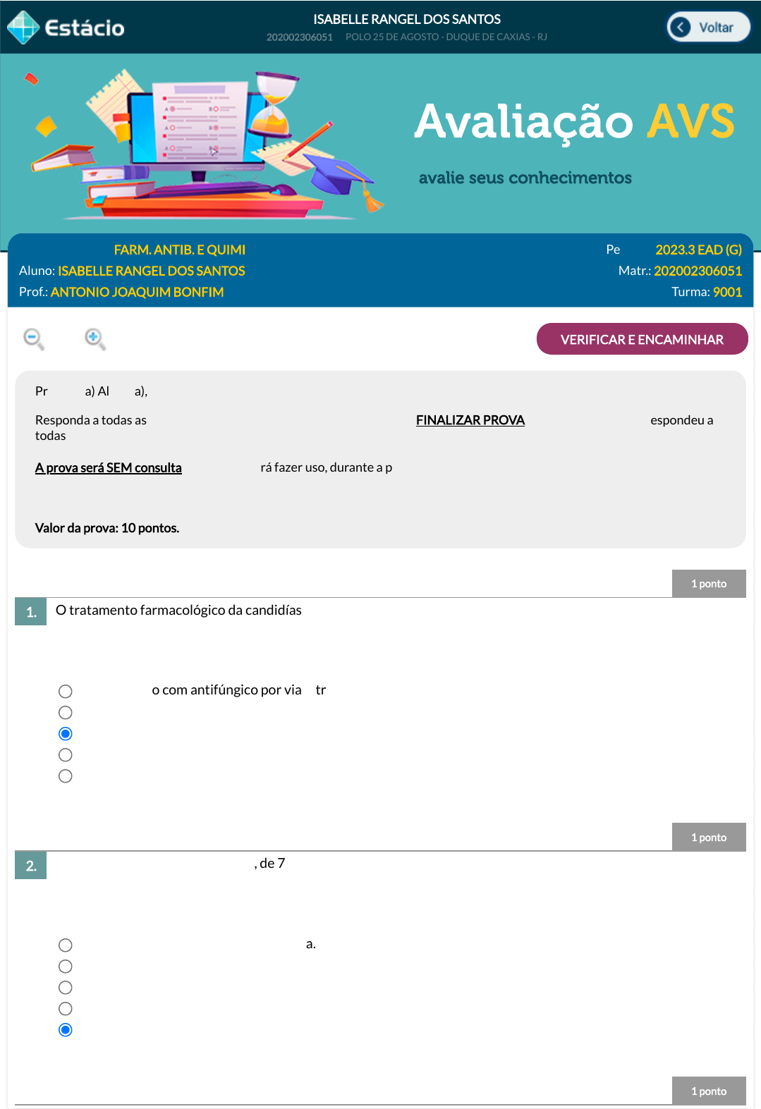 25/11/2023, 22:53 EPS https://simulado.estacio.br/alunos/ 1/4 ISABELLE RANGEL DOS SANTOS Avaliação AVS 202002306051 POLO 25 DE AGOSTO - DUQUE DE CAXIAS - RJ avalie seus conhecimentos 1 ponto O tratamento farmacológico da candidíase aguda pseudomembranosa, que é a forma mais comum de candidíase oral, consiste em: (Ref.: 202007722049) 1 ponto Considerando a Portaria nº 3.125, de 7 de outubro de 2010, é correto a�rmar que a poliquimioterapia padronizada para o tratamento da hanseníase multibacilar (MB) em adultos é composta por: (Ref.: 202007728069) 1 ponto Disc.: SDE4506 - FARM. ANTIB. E QUIMI Período: 2023.3 EAD (G) Aluno: ISABELLE RANGEL DOS SANTOS Matr.: 202002306051 Prof.: ANTONIO JOAQUIM BONFIM Turma: 9001 Lupa VERIFICAR E ENCAMINHAR Prezado(a) Aluno(a), Responda a todas as questões com atenção. Somente clique no botão FINALIZAR PROVA ao ter certeza de que respondeu a todas as questões e que não precisará mais alterá-las. A prova será SEM consulta. O aluno poderá fazer uso, durante a prova, de uma folha em branco, para rascunho. Nesta folha não será permitido qualquer tipo de anotação prévia, cabendo ao aplicador, nestes casos, recolher a folha de rascunho do aluno. Valor da prova: 10 pontos. 1. Tratamento com antifúngico por via intravenosa. Uso de antibióticos sistêmicos. Remoção cirúrgica da lesão. Administração oral de �uconazol e aplicação tópica de nistatina. Uso de griseofulvina orais. 2. Isoniazida, rifampicina e pirazinamida. Dapsona, etambutol e rifampicina. Isoniazida, rifampicina e dapsona. Rifampicina, clofazimina e pirazinamida. Rifampicina, dapsona e clofazimina. javascript:voltar(); javascript:voltar(); javascript:diminui(); javascript:diminui(); javascript:aumenta(); javascript:aumenta(); Lourdes Destacar Lourdes Destacar Lourdes Destacar Lourdes Nenhum definido por Lourdes Lourdes Destacar Lourdes Destacar Lourdes Destacar 25/11/2023, 22:53 EPS https://simulado.estacio.br/alunos/ 2/4 Fármaco capaz de reduzir a transmissão vertical do HIV quando utilizado na mãe durante o trabalho de parto e no bebê recém-nascido: (Ref.: 202007722063) 1 ponto A leishmaniose visceral ou calazar é uma doença transmitida pelo mosquito-palha que, ao picar, introduz na circulação do hospedeiro o protozoário Leishmania. O paciente pode apresentar sintomas como febre, fraqueza, anemia, palidez, aumento do baço e do fígado, comprometimento da medula óssea, problemas respiratórios e diarreia. Qual dos seguintes fármacos está disponível como medicação para o tratamento da leishmaniose visceral? (Ref.: 202007722067) 1 ponto A Cloroquina é um derivado da 4-aminoquinolona que se concentra seletivamente nos eritrócitos parasitados, utilizada no tratamento e pro�laxia de malária em regiões onde a doença é susceptível ao seu efeito. Assinale a alternativa que corresponda ao principal efeito antimalárico da Cloroquina. (Ref.: 202007725111) 1 ponto Marque a alternativa que corresponda ao fármaco que antagoniza os efeitos da substância P em receptores do tipo NK1, sendo excelente para o controle de náuseas e vômito relacionados a quimioterápico com alto potencial emético: (Ref.: 202007637989) 1 ponto 3. Ribavirina Zidovudina Efavirenz Peginterferona α-2a Amantadina 4. Atovaquona Nitazoxanida Artesunato Antimoniato de meglumina Permetrina 5. Inibição da polimerização do heme, o que aumenta o heme solúvel, tóxico ao parasita. Inibição da polimerização da β-tubulina. Produção de radicais livres e modi�cações das proteínas do parasita, tóxicas para os plasmódios. Inibe a síntese de bases pirimidínicas e interfere no transporte mitocondrial de elétrons dos plasmódios. É antagonista do folato, capaz de inibir a di-hidrofolato redutase. 6. Rolapitanto Racecadotrila Palonosetrona Alizaprida Prometazina 7. Lourdes Destacar Lourdes Destacar Lourdes Destacar Lourdes Destacar 25/11/2023, 22:53 EPS https://simulado.estacio.br/alunos/ 3/4 Os anticorpos monoclonais e os inibidores de tirosina-quinase podem compartilhar como alvo o mesmo domínio de membrana - um no ambiente intracelular e o outro no ambiente extracelular. A que se deve esta característica? (Ref.: 202007635171) 1 ponto Solução ou emulsão composta basicamente de carboidratos, aminoácidos, lipídios, vitaminas e minerais, destinada à administração intravenosa em pacientes desnutridos. A frase acima apresenta uma breve de�nição de: (Ref.: 202007635363) 1 ponto Sobre o acondicionamento das bolsas de nutrição parenteral é correto a�rmar que: (Ref.: 202007629460) 1 ponto Paciente M.M.O, 49 anos, sexo feminino, tabagista, etilista, portadora de neoplasia maligna do estômago, necessitou realizar procedimento cirúrgico para retirada de um tumor local, o que tornou inviável sua alimentação por via oral. Felizmente, a referida paciente não teve maiores complicações nutricionais pois o serviço onde foi atendida contava com uma Equipe Multidisciplinar de Terapia Nutricional bem de�nida e bastante atuante. Foi decidido em consulta que a paciente deveria alimentar-se via sonda, inserida cirurgicamente no abdômen e direcionada ao intestino. Assinale abaixo o tipo de sonda eleita para paciente M.M.O: (Ref.: 202007641003) Hidrossolubilidade das moléculas Tamanho das moléculas Reatividade das moléculas Lipo�licidade das moléculas pH do meio 8. Nutrição emulsionada. Nutrição funcional. Nutrição enteral. Nutrição repositiva. Nutrição parenteral. 9. Deve ser acondicionada em temperatura até 25 °C. A nutrição parenteral não sofre in�uência da temperatura. O transporte pode ser realizado durante no máximo 24 horas, independentemente da temperatura. O transporte pode ser realizado durante no máximo 24 horas (se sob refrigeração). Deve ser mantida sob refrigeração, de 2 a 8 °C. 10. Urostomia Traqueostomia Gastrostomia Sonda nasoentérica Jejunostomia VERIFICAR E ENCAMINHAR Lourdes Destacar Lourdes Destacar Lourdes Des