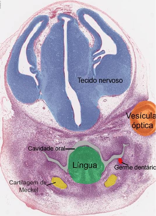 Fases da ontogênese Desenvolvimento – 1 Cabeça de embrião. Coloração: HE. Vista panorâmica. Corte frontal de cabeça de embrião , sendo possível observar o encéfalo em desenvolvimento (azul), vesícula óptica (laranja) que dará origem ao futuro olho, cavidade oral (cinza), língua em formação (verde), cartilagem de Meckel (amarelo) que terá papel importante na formação da mandíbula. Há presença de pelo menos um germe dentário na fase de botão (vermelho). Cortes histológicos de tecido ósseo e de dentes Devido à sua consistência rígida, o tecido duros requerem metodologias especiais para a obtenção de cortes histológicos. FASE 2 DO DESENVOLVIMENTO Corte frontal de cabeça de um embrião em estágio de desenvolvimento mais avançado do que o anterior. Nele observamos a língua (verde), a cartilagem de Meckel (amarelo) e germes dentários na fase de capuz (azul) e fase de botão (vermelho). DESENVOLVIMENTO 3 Corte frontal de cabeça de um embrião em estágio de desenvolvimento mais avançado do que o anterior. Nele observamos os olhos já com o cristalino formado (laranja), a língua e seus feixes musculares com diferentes orientações (verde), a cartilagem de Meckel (amarelo) guiando a ossificação intramembranosa da mandíbula e germes dentários na fase de campânula ou sino (vermelho). DESENVOLVIMENTO – 4 Na quinta semana de vida intrauterina o epitélio oral primitivo começa a proliferar, invadindo o ectomesênquima subjacente dando origem a banda epitelial primária, essa tem forma de ferradura (o que dará forma aos futuros arcos dentários da maxila e mandíbula) . A banda epitelial primária continua a proliferar e se subdivide em lâmina dentária vestibular e lâmina dentária. DESENVOLVIMENTO – 5: FASE DE BOTÃO image1.png image2.jpeg image3.png image4.png image5.png