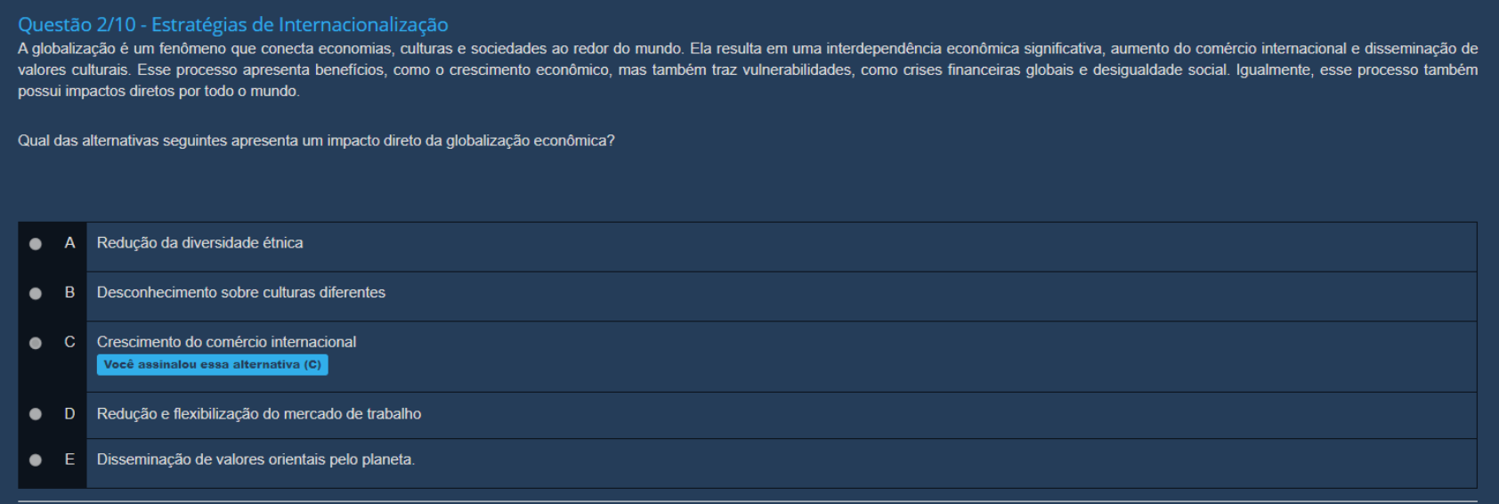 Questão 9/10 - Estratégias de Internacionalização Ler em voz alta O processo de internacionalização de empresas requer a identificação de interme...