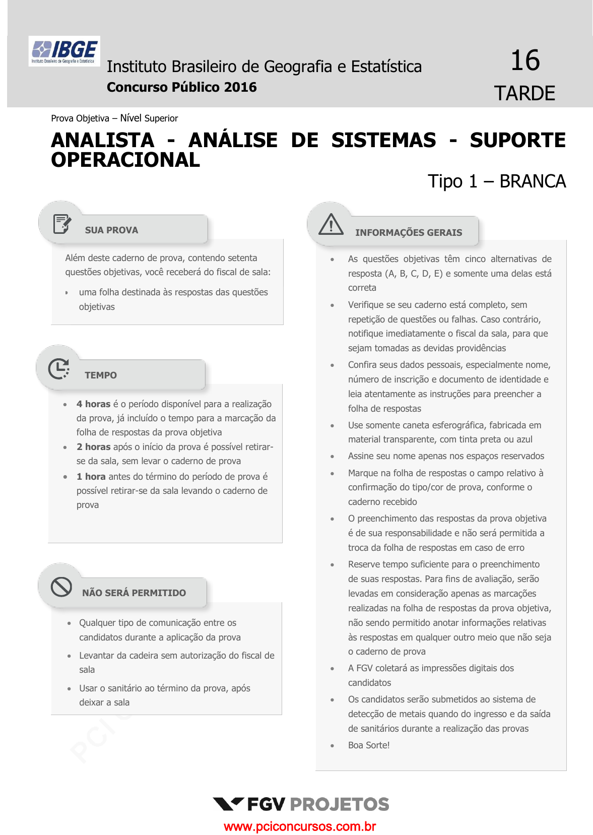 pcimarkpci MjgwNDowMTRkOmJhYTA6OGZiZDo0ZGMwOmNlZjc6YzgzZTozZTI2:VHVlLCAxMyBGZWIgMjAyNCAxNzozNDo1OSAtMDMwMA== www.pciconcursos.com.br Instituto Brasileiro de Geografia e Estatística 16 Concurso Público 2016 TARDE Prova Objetiva – Nível Superior ANALISTA - ANÁLISE DE SISTEMAS - SUPORTE OPERACIONAL Tipo 1 – BRANCA Além deste caderno de prova, contendo setenta questões objetivas, você receberá do fiscal de sala: uma folha destinada às respostas das questões objetivas As questões objetivas têm cinco alternativas de resposta (A, B, C, D, E) e somente uma delas está correta Verifique se seu caderno está completo, sem repetição de questões ou falhas. Caso contrário, notifique imediatamente o fiscal da sala, para que sejam tomadas as devidas providências Confira seus dados pessoais, especialmente nome, número de inscrição e documento de identidade e leia atentamente as instruções para preencher a folha de respostas Use somente caneta esferográfica, fabricada em material transparente, com tinta preta ou azul Assine seu nome apenas nos espaços reservados Marque na folha de respostas o campo relativo à confirmação do tipo/cor de prova, conforme o caderno recebido O preenchimento das respostas da prova objetiva é de sua responsabilidade e não será permitida a troca da folha de respostas em caso de erro Reserve tempo suficiente para o preenchimento de suas respostas. Para fins de avaliação, serão levadas em consideração apenas as marcações realizadas na folha de respostas da prova objetiva, não sendo permitido anotar informações relativas às respostas em qualquer outro meio que não seja o caderno de prova A FGV coletará as impressões digitais dos candidatos Os candidatos serão submetidos ao sistema de detecção de metais quando do ingresso e da saída de sanitários durante a realização das provas Boa Sorte! 4 horas é o período disponível para a realização da prova, já incluído o tempo para a marcação da folha de respostas da prova objetiva 2 horas após o início da prova é possível retirar- se da sala, sem levar o caderno de prova 1 hora antes do término do período de prova é possível retirar-se da sala levando o caderno de prova Qualquer tipo de comunicação entre os candidatos durante a aplicação da prova Levantar da cadeira sem autorização do fiscal de sala Usar o sanitário ao término da prova, após deixar a sala SUA PROVA TEMPO NÃO SERÁ PERMITIDO INFORMAÇÕES GERAIS www.pciconcursos.com.br pcimarkpci MjgwNDowMTRkOmJhYTA6OGZiZDo0ZGMwOmNlZjc6YzgzZTozZTI2:VHVlLCAxMyBGZWIgMjAyNCAxNzozNDo1OSAtMDMwMA== www.pciconcursos.com.br www.pciconcursos.com.br pcimarkpci MjgwNDowMTRkOmJhYTA6OGZiZDo0ZGMwOmNlZjc6YzgzZTozZTI2:VHVlLCAxMyBGZWIgMjAyNCAxNzozNDo1OSAtMDMwMA== www.pciconcursos.com.br Instituto Brasileiro de Geografia e Estatística FGV Projetos Analista - Análise de Sistemas - Suporte Operacional Tipo 1 – Cor BRANCA – Página 3 Conhecimentos Básicos Texto – A eficácia das palavras certas Havia um cego sentado numa calçada em Paris. A seus pés, um boné e um cartaz em madeira escrito com giz branco gritava: “Por favor, ajude-me. Sou cego”. Um publicitário da área de criação, que passava em frente a ele, parou e viu umas poucas moedas no boné. Sem pedir licença, pegou o cartaz e com o giz escreveu outro conceito. Colocou o pedaço de madeira aos pés do cego e foi embora. Ao cair da tarde, o publicitário voltou a passar em frente ao cego que pedia esmola. Seu boné, agora, estava cheio de notas e moedas. O cego reconheceu as pegadas do publicitário e perguntou se havia sido ele quem reescrevera o cartaz, sobretudo querendo saber o que ele havia escrito. O publicitário respondeu: “Nada que não esteja de acordo com o conceito original, mas com outras palavras”. E, sorrindo, continuou o seu caminho. O cego nunca soube o que estava escrito, mas seu novo cartaz dizia: “Hoje é primavera em Paris e eu não posso vê-la”. (Produção de Texto, Maria Luíza M. Abaurre e Maria Bernadete M. Abaurre) 1 O título dado ao texto: (A) resume a história narrada no corpo do texto; (B) afirma algo que é contrariado pela narrativa; (C) indica um princípio que é demonstrado no texto; (D) mostra um pensamento independente do texto; (E) denuncia um princípio negativo de convencimento. 2 A frase abaixo que exemplifica uma incoerência é: (A) “O que vem fácil, vai fácil”. (Geoffrey Chaucer); (B) “Se você deseja atingir o ponto mais alto, comece pelo mais baixo”. (Ciro, o Jovem); (C) “Perseverança não é uma corrida longa, são muitas corridas curtas, uma após a outra”. (Walter Elliot); (D) “Nossa maior glória não é nunca cair, mas sim levantar toda vez que caímos”. (Oliver Goldsmith); (E) “Seja breve, não importa quanto tempo isto leve”. (Saul Gorn). 3 “Havia um cego sentado numa calçada em Paris. A seus pés, um boné e um cartaz em madeira escrito com giz branco gritava: “Por favor, ajude-me. Sou cego”. Um publicitário da área de criação, que passava em frente a ele, parou e viu umas poucas moedas no boné. Sem pedir licença, pegou o cartaz e com o giz escreveu outro conceito. Colocou o pedaço de madeira aos pés do cego e foi embora”. O texto pertence ao modo narrativo de organização discursiva, caracterizado pela evolução cronológica das ações. O segmento que comprova essa evolução é: (A) “Havia um cego sentado numa calçada em Paris. A seus pés, um boné e um cartaz em madeira escrito com giz branco gritava”; (B) “Por favor, ajude-me. Sou cego”; (C) “Um publicitário da área de criação, que passava em frente a ele”; (D) “parou e viu umas poucas moedas no boné”; (E) “Sem pedir licença, pegou o cartaz”. 4 A frase abaixo em que o emprego do demonstrativo sublinhado está inadequado é: (A) “As capas deste livro que você leva são muito separadas”. (Ambrose Bierce); (B) “Quando alguém pergunta a um autor o que este quis dize