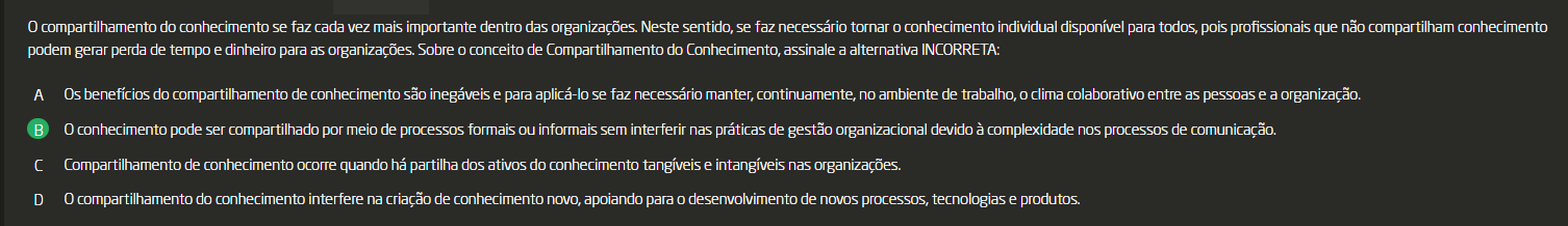 Compartilhamento do conhecimento se faz cada vez mais importante dentro das organizações. Neste sentido, se faz necessário tornar conhecimento individual disponível para todos, pois profissionais que não compartilham conhecimento podem gerar perda de tempo e dinheiro para as organizações. Sobre o conceito de Compartilhamento do Conhecimento, assinale a alternativa INCORRETA: A Os benefícios do compartilhamento de conhecimento são inegáveis e para aplicá-lo se faz necessário manter, continuamente, no ambiente de trabalho, clima colaborativo entre as pessoas e a organização. B O conhecimento pode ser compartilhado por meio de processos formais ou informais sem interferir nas práticas de gestão organizacional devido à complexidade nos processos de comunicação. C Compartilhamento de conhecimento ocorre quando há partilha dos ativos do conhecimento tangíveis e intangíveis nas organizações. D O compartilhamento do conhecimento interfere na criação de conhecimento novo, apoiando para desenvolvimento de novos processos, tecnologias e produtos.