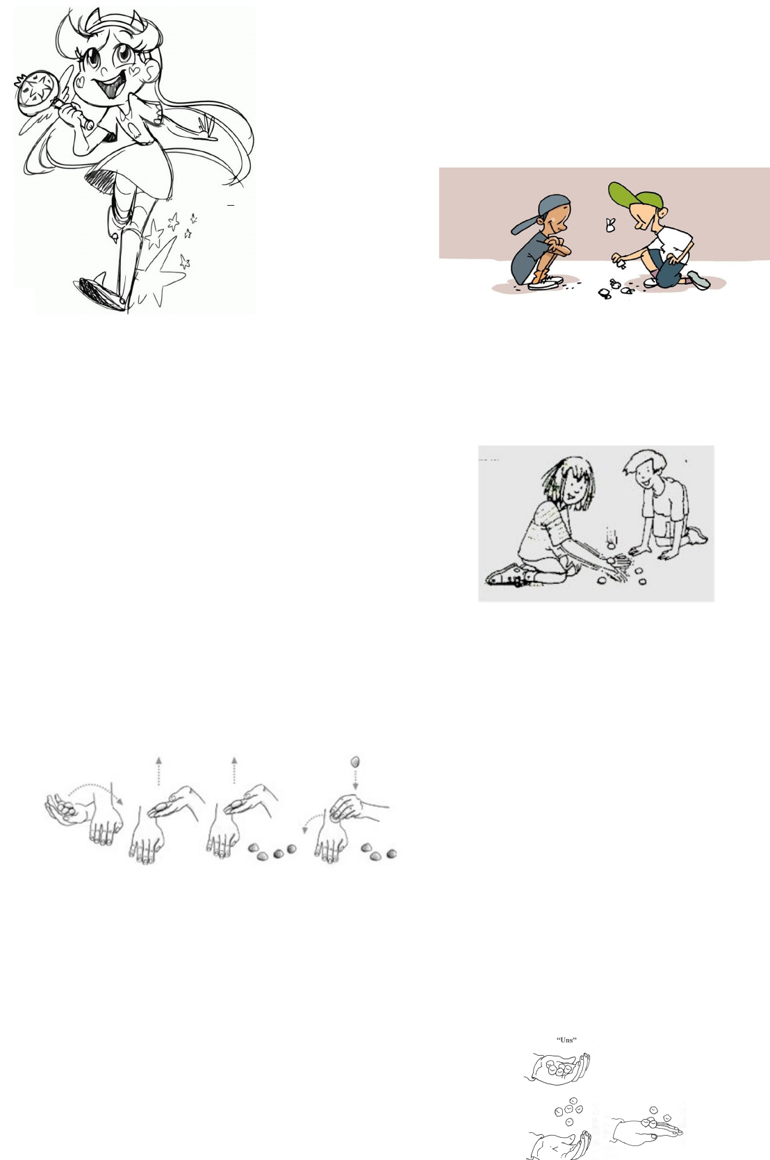 1. Material: - 5 pedrinhas ou saquinhos de arroz Nº de participantes: mais de 1 2. O primeiro jogador lança as 5 pedrinhas (ou sa- quinhos de arroz) deixando-os cair espalhados pelo chão. 3. Depois o jogador escolhe uma das cinco pe- drinhas e a lança para cima. Ele tem que pegar uma das pedrinha e a pedrinha que lançou para cima com a mesma mão e antes que a pedrinha toque o chão. 4. Depois ele recoloca a pedrinha no local onde ela estava. Em seguida lança de novo a pedrinha que havia jogado para cima e tenta pegar duas pedrinhas e a que está caindo com a mesma mão. 5. O jogo segue até que o jogador pegue as quatro pedrinhas e a que estava no ar ou que erre e deixe a pedrinha cair no chão. Então passa a vez para o jogador seguinte. 6. Toda vez que o jogador deixar cair a pedrinha no chão (ou não conseguir pegar a quantidade de pedrinhas da vez) ele perde o jogo e passa a vez para o jogador seguinte. 7. Ganha o jogo quem conseguir completar as cinco pedrinhas mais vezez. Uma variação do jogo é colocar as pedrinhas com a palma virada para baixo, jogá-las para cima e pegar as cinco com a mesma mão. 5 Marias É tarde, é tarde! Tao tarde até que arde! ALO, Adeus! É tarde, é tarde, é tarde, é tarde, é tarde! 5 marias 8anos de Maya 5a magia de Mewni