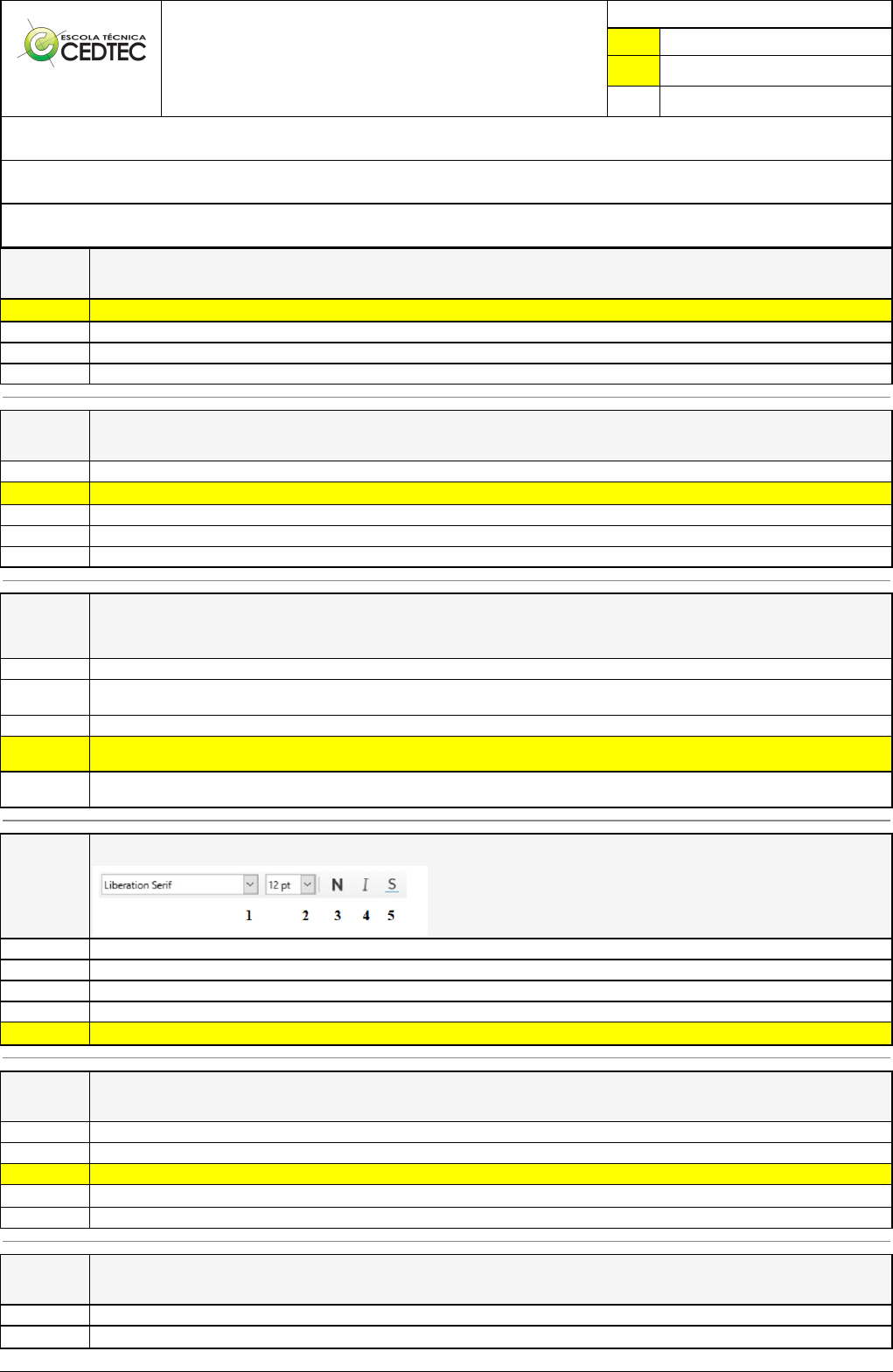 Pincel Atômico - 25/06/2024 13:13:43 1/2 KESIA BRITO DA SILVEIRA Exercício Avaliativo (SALA EAD) Atividade finalizada em 19/04/2023 14:35:54 (893085 / 1) LEGENDA Resposta correta na questão # Resposta correta - Questão Anulada X Resposta selecionada pelo Aluno Disciplina: INFORMÁTICA [492244] - Avaliação com 10 questões, com o peso total de 10,00 pontos [capítulos - Todos] Turma: Curso Técnico: Segurança do Trabalho - Grupo: AGOSTO/22 PRES - N.SEG.TRAB.Ago.22 [70739] Aluno(a): 91340590 - KESIA BRITO DA SILVEIRA - Respondeu 7 questões corretas, obtendo um total de 7,00 pontos como nota [349964_6872] Questão 001 Qual desses abaixo não é um formato de arquivo de imagem? X .exe .png .bmp .jpeg [349964_922] Questão 002 Qual das fórmulas abaixo está correta? =SOMA()A1()A2) X =SOMA(B1;B2) SOMA=SOMA(A1:A5) =A1+B1=SOMA(A1+B1) =Média(A1>B1) [349964_5350 0] Questão 003 Sobre o LibreOffice Impress é correto afirmar que: É um sistema operacional de auxilia o computador na criação de telas. É um programa que auxilia na formatação de fórmulas científicas ematemáticas de maneira equivalente ao Equation Editor, ferramenta presente na suíte da Microsoft É o processador de textos da suíte, semelhante ao Word, presente na suíte de escritório Microsoft Office. X É um programa de apresentação de slides similar ao PowerPoint, encontrado na suíte da Microsoft, e destina-se a criar e a apresentar slides, sendo possível inserir plano de fundo, títulos, marcadores, imagens, vídeos, efeitos de transição de slides, dentre outras opções. É um gerenciador de banco de dados, semelhante ao Access, disponível no Microsoft Office, e destina-se à criação e gerenciamento de bancos de dados. [349964_1416 68] Questão 004 No LibreOffice Writer, há diversas possibilidades para formatação do texto. A imagem a seguir mostra algumas delas. Selecione a alternativa que relaciona corretamente os números indicados e suas respectivas funções: 1 - nome do documento, 2 - tamanho da margem, 3 - normalizar texto, 4 - incrementar texto, 5 - substituir palavras 1 - estilo da página, 2 - quantidade de linhas, 3 - normalizar texto, 4 - inglês, 5 - somar 1 - nome do documento, 2 - quantidade de palavras, 3 - nivelar linhas, 4 - incrementar texto, 5 - separar linhas 1 - estilo da página, 2 - quantidade de páginas, 3 - nomear documento, 4 - itálico, 5 - soletrar palavras X 1 - nome da fonte, 2 - tamanho da fonte, 3 - negrito, 4 - itálico, 5 - sublinhado [349964_926] Questão 005 Indique a fórmula escrita de forma errada: =SOMA(A1;B2) Todas as alternativas corretas =Média(A1+A4) X =A1-A2 =SE(H24>=60; “APROVADO”; “REPROVADO”) [349963_933] Questão 006 Qual a função do LibreOffice Writer? De editor e criador de Slides. X Ferramenta para criação de projetos. Pincel Atômico - 25/06/2024 13:13:43 2/2 De editor e criador de texto. Ferramenta de banco de dados. De editor e criador de planilhas eletrônicas. [349963_1416 73] Questão 007 Para realizar operações matemáticas no LibreOffice Calc, são utilizados alguns símbolos. Quais são as operações representadas pelos símbolos: % * ^ / Desigualdade, multiplicação, divisão e subtração Soma, subtração, multiplicação e divisão Potência, subtração, multiplicação e soma X Porcentagem, multiplicação, potência e divisão Potência, divisão, soma e porcentagem [349963_5350 5] Questão 008 Quando usamos o tecla ESC do teclado em seu estado padrão, estamos usando de função de: X Fechar o item ativo/selecionado Iniciar a Ajuda Confirmra a entrada no item selecionado Iniciar a verificação ortográfica Ir para o último item [349962_5511 2] Questão 009 Nos editor de texto (LibreOffice Writer e Microsoft Word) temos recursos de edição de texto muito usados por seus usuários para melhorar o visual do documento. A respeito desses, analise as seguintes afirmativas e responda: I - A inserção de cabeçalho inclui um texto na parte inferior de cada página. II - A inserção de rodapé inclui um texto no alto de cada página. III - Permite inserir números de página nos documentos. Apenas o III está correto. X II e III estão corretos. I, II e III estão corretos. I e II estão corretos. Apenas o I está correto. [349962_5355 7] Questão 010 Para formatar uma célula basta selecionar a(s) célula(s) e usar a Barra de Formatação, mostrado na imagem abaixo. Na ordem indique a função dos números 02(dois), 03(três) e 06(seis): 01 - Tamanho da Fonte: mudar o tamanho das letras. 03 - Recuos: aumentar ou diminuir o recuo do textos. 06 - Bordas: aplicam ou retiram as bordas das células (linhas ao redor). 01- Tamanho da Fonte: mudar o tamanho das letras. 03 - Nome da fonte: mudar o tipo (nome) das letras. 06 - Recuos: aumentar ou diminuir o recuo do texto. 01 - Tamanho da Fonte: mudar o tamanho das letras. 03 - Cor da fonte: para mudar a cor da fonte (letra) das células. 06 - Formato de numérico: este botão adiciona ou exclui casas decimais após a vírgula. 01 - Tamanho da Fonte: mudar o tamanho das letras. 03 - Estilos (tipo) da Fonte: mudar os estilos da letra para Negrito, Itálico e Sublinhados. 06 - Bordas: aplicam ou retiram as bordas das células (linhas ao redor). X 01 - Nome da fonte: mudar o tipo (nome) das letras. 03 - Tamanho da Fonte: mudar o tamanho das letras. 06 - Mesclar e centralizar células: unir duas ou mais células.