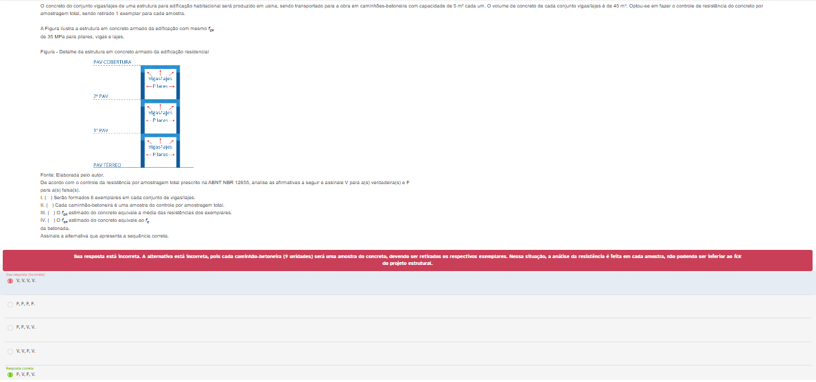 Elaborada autor. com da resistência por amostragem total prescrito ABNT NBR 12655 analise as afirmativas seguir assinale para verdadeira(s) F para formados 6 am cada de vigas/lajes Cada uma amostra do controle por total III. do concreto equivale média das resistências dos exemplares 10 estimado do concreto equivale ao da betonada sequência Sua resposta incorreta A alternativa incorreta pots cada 19 unidades) seri uma amostra do concreto, devendo retirados as respectivos exemplares. Nessa situação, a da feita em cada amostra, não podendo inferior ao fck do projeto V.V.V.V. F.F.V.V.