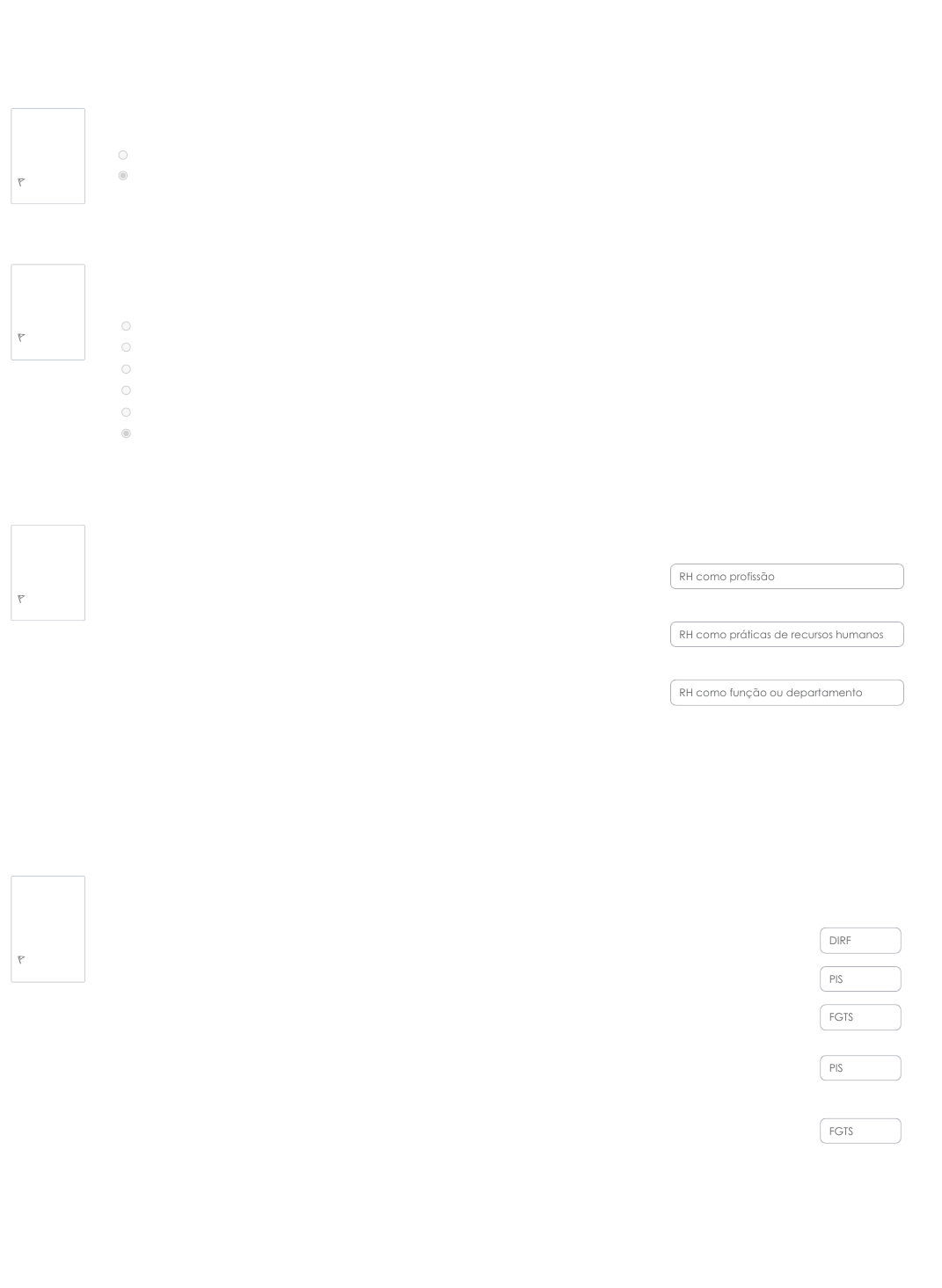 Questão 1 Correto Atingiu 1,00 de 1,00 Marcar questão Questão 2 Incorreto Atingiu 0,00 de 1,00 Marcar questão Questão 3 Incorreto Atingiu 0,00 de 1,00 Marcar questão Questão 4 Parcialmente correto Atingiu 0,40 de 1,00 Marcar questão Iniciado em terça-feira, 25 jun. 2024, 14:21 Estado Finalizada Concluída em terça-feira, 25 jun. 2024, 14:25 Tempo empregado 3 minutos 24 segundos Avaliar 2,40 de um máximo de 10,00(24%) 1.8 Teste seus conhecimentos É mais adequado utilizar o recrutamento externo quando a empresa quer valorizar seus colaboradores internos. Verdadeiro Falso A resposta correta é 'Falso'. Assinale aquela que não é considerada uma fonte de recrutamento para empresas que procuram novos funcionários com o objetivo de ter novas culturas na empresa: a. Consultorias de replacement b. Headhunters c. Agência de empregos d. Leasing de funcionários e. Mídia f. Internet A resposta correta é: Leasing de funcionários Preencha os significados do RH com seus respectivos nomes: Elemento prestador de serviços nas áreas de recrutamento, seleção, treinamento, remuneração, comunicação, higiene e segurança do trabalho, benefícios, etc. Refere-se aos profissionais que trabalham em tempo integral em papéis diretamente relacionados com recursos humanos, a saber: selecionadores, treinadores, administradores de salários e benefícios, engenheiros de segurança, médicos do trabalho, etc. Refere-se ao modo como a organização opera suas atividades de recrutamento, seleção, treinamento, remuneração, benefícios, comunicação, higiene e segurança do trabalho. RH como profissão RH como práticas de recursos humanos RH como função ou departamento A resposta correta é: Elemento prestador de serviços nas áreas de recrutamento, seleção, treinamento, remuneração, comunicação, higiene e segurança do trabalho, benefícios, etc. → RH como função ou departamento, Refere-se aos profissionais que trabalham em tempo integral em papéis diretamente relacionados com recursos humanos, a saber: selecionadores, treinadores, administradores de salários e benefícios, engenheiros de segurança, médicos do trabalho, etc. → RH como profissão, Refere-se ao modo como a organização opera suas atividades de recrutamento, seleção, treinamento, remuneração, benefícios, comunicação, higiene e segurança do trabalho. → RH como práticas de recursos humanos. Existem algumas obrigações que devem ser atendidas e cumpridas por todas as empresas por serem determinações legais. Relacione corretamente cada sigla com a obrigação descrita. São informações anuais prestadas ao governo a respeito de cada colaborador. Deve conter os ganhos e recolhimentos previdenciários, fundiários e fiscais. É uma exigência do Ministério da Fazenda através da Receita Federal. Deve constar na declaração os rendimentos pagos ou creditados a beneficiários desde que tenha tido retenção do Imposto de Renda na Fonte, referente ao ano anterior. É um direito assegurado aos colaboradores da empresa, e que representa um encargo social para a empresa. Destina-se a atender aspectos voltados para o trabalhador, como o Fundo de Amparo ao Trabalhador (FAT), Seguro Desemprego e Abono Anual, embora seu cálculo não decorra da folha de pagamento. É um comunicado enviado ao Ministério do Trabalho que identifica admissões, transferências e desligamentos (dispensa, aposentadoria, demissão ou morte), ocorridas no mês. DIRF PIS FGTS PIS FGTS A resposta correta é: São informações anuais prestadas ao governo a respeito de cada colaborador. Deve conter os ganhos e recolhimentos previdenciários, fundiários e fiscais. → RAIS, É uma exigência do Ministério da Fazenda através da Receita Federal. Deve constar na declaração os rendimentos pagos ou creditados a beneficiários desde que tenha tido retenção do Imposto de Renda na Fonte, referente ao ano anterior. → DIRF, Questão 5 Incorreto Atingiu 0,00 de 1,00 Marcar questão Questão 6 Correto Atingiu 1,00 de 1,00 Marcar questão Questão 7 Incorreto Atingiu 0,00 de 1,00 Marcar questão Questão 8 Incorreto Atingiu 0,00 de 1,00 Marcar questão Questão 9 Incorreto Atingiu 0,00 de 1,00 Marcar questão É um direito assegurado aos colaboradores da empresa, e que representa um encargo social para a empresa. → FGTS, Destina-se a atender aspectos voltados para o trabalhador, como o Fundo de Amparo ao Trabalhador (FAT), Seguro Desemprego e Abono Anual, embora seu cálculo não decorra da folha de pagamento. → PIS, É um comunicado enviado ao Ministério do Trabalho que identifica admissões, transferências e desligamentos (dispensa, aposentadoria, demissão ou morte), ocorridas no mês. → CAGED. Qual é a legislação que regula os estágios remunerados de estudantes do ensino médio e do superior? a. Lei nº 13.212, de 5 de julho de 2011. b. Lei nº 11.345, de 15 de agosto de 2010. c. Lei nº 12.990, de 10 de março de 2009. d. Lei nº 11.788, de 25 de setembro de 2008. e. Lei nº 10.567, de 30 de junho de 2007. A resposta correta é: Lei nº 11.788, de 25 de setembro de 2008. Se o empregado for dispensado antes do término do prazo do contrato de experiência, deverá o efetuar o pagamento de indenização, a razão de do(s) salário(s) que seria(m) devido(s) a partir do dia seguinte da dispensa, até o seu término, conforme previamente estipulado. injustamente empregador 50% A resposta correta é: Se o empregado for dispensado [injustamente] antes do término do prazo do contrato de experiência, deverá o [empregador] efetuar o pagamento de indenização, a razão de [50%] do(s) salário(s) que seria(m) devido(s) a partir do dia seguinte da dispensa, até o seu término, conforme previamente estipulado. O 13º salário corresponde ao benefício de uma remuneração anual a mais para o colaborador, sempre proporcionalmente aos meses trabalhados no respectivo ano, a razão de 01/12 por mês, na fração superior a 14 dias. 