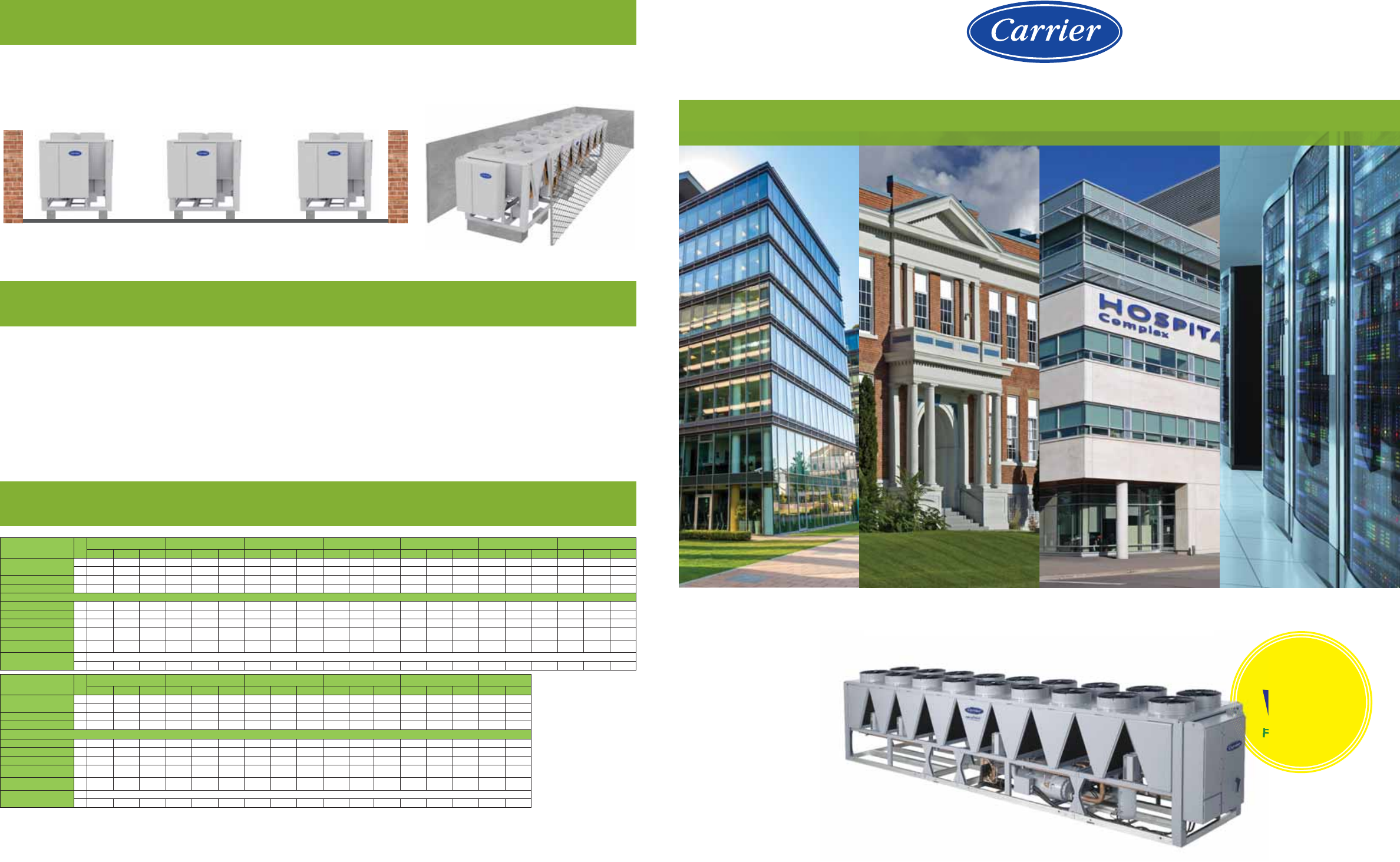 A Carrier pode lhe proporcionar a certeza de ter o chiller certo, como nenhum outro fabricante. Nosso novo software de modelagem ExpertFit™ consegue modelar qual capacidade é possível dentro do espaço disponível e qual desempenho você pode esperar do chiller. Em outras palavras, você pode ter certeza de que está adquirindo um chiller adequado para a sua aplicação. Software de Modelagem ExpertFit™ Exclusivo Um Chiller entre grade e paredes sólidas Três Chillers lado a lado com paredes de tijolos nas laterais Projetado para o amanhã. Ideal para hoje. Chiller de Parafuso AquaForce® 30XV com Condensação a Ar e sistema VFD CC - C - AquaForce 30XV - A - 08/21 VFD Fabricado no Brasil 1º Chiller Parafuso a Ar Projetado para o amanhã. Ideal para hoje. Fa Para proprietários e gerentes de obra • Operação confiável e eficiente • Custo de instalação reduzido, sem necessidade de modificações • Operação silenciosa • Alta eficiência • Recuperação rápida após falta de energia Resumo dos Benefícios Para engenheiros • Garantia de que as condições do projeto serão atendidas • Confiança em projetos críticos ao ruído • Fácil adaptação em espaços pré- existentes Para empreiteiros • Satisfação do cliente garantida • Menos reclamações por ruído • Capacidade de atender aos requisitos de espaço especificados • Menos chamadas de serviço devido à recuperação mais rápida da capacidade Características Técnicas S M H S M H S M H S M H S M H S M H S M H TR 142 145 147 162 164 165 177 183 184 197 201 203 218 222 224 259 263 264 275 278 281 kW 500 511 517 569 579 582 623 643 647 694 706 712 766 779 787 911 924 930 967 979 987 PESO EM OPERAÇÃO (Cu/Al) kg - 5298 5769 5304 5865 6327 5396 5889 6391 5902 6468 6894 6310 6788 7263 7344 7944 8488 7557 7975 8437 PESO EM OPERAÇÃO (MCHX) kg 5039 5069 5469 5069 5554 5948 5154 5587 5980 5587 6084 6442 5981 6399 6793 6992 7514 7989 7196 7541 7934 CIRCUITO A/B (Cu/Al) kg - 73/75 82/84 74/80 86/91 95/99 78/83 88/93 97/101 89/93 97/101 105/110 115/85 125/95 134/103 108/113 121/125 129/134 113/117 123/128 131/136 CIRCUITO A/B (MCHX) kg 45/48 50/52 52/55 50/57 57/61 59/64 55/59 59/64 61/66 59/64 61/66 64/68 80/61 84/66 86/68 73/77 80/84 82/86 77/82 82/86 84/89 CAPACIDADE MÍNIMA % <15 <15 <15 <15 <15 <15 <15 <15 <15 <15 <15 <15 <15 <15 <15 <15 <15 <15 <15 <15 <15 VOLUME DE ÁGUA NO EVAPORADOR l 78 85 85 85 95 95 95 103 103 103 116 116 128 135 135 135 180 189 180 189 189 VENTILADOR CONDENSADOR (Qtd.) - 4/4 4/4 5/5 4/4 5/5 6/6 4/4 5/5 6/6 5/5 6/6 7/7 6/4 7/5 8/6 6/6 7/7 8/8 6/6 7/7 8/8 mm mm 5226 5226 6420 5226 6420 7614 5226 6420 7614 6420 7614 8808 6420 7614 8808 7614 8808 10002 7614 8808 10002 S M H S M H S M H S M H S M H S M TR 284 292 295 315 321 324 347 351 352 400 404 407 454 455 458 493 502 kW 997,8 1027 1036 1108 1130 1138 1220 1233 1237 1408 1420 1433 1595 1599 1610 1734 1765 PESO EM OPERAÇÃO (Cu/Al) kg 7975 8473 8922 8473 8962 9449 9864 10696 11117 11344 11857 12278 11857 12672 13159 12672 13266 PESO EM OPERAÇÃO (MCHX) kg 7541 7965 8346 7965 8381 8803 9377 10127 10480 10777 11217 11570 11217 11955 12347 11955 12400 CIRCUITO A/B (Cu/Al) kg 123/128 134/138 142/146 134/138 144/149 152/155 167/130 184/150 192/158 174/174 184/184 192/192 184/184 199/199 207/207 199/199 219/219 CIRCUITO A/B (MCHX) kg 82/86 86/91 89/93 91/95 95/100 98/102 114/89 125/102 127/105 120/120 125/125 127/127 125/125 134/134 136/136 139/139 143/143 CAPACIDADE MÍNIMA % <15 <15 <15 <15 <15 <15 <15 <15 <15 <15 <15 <15 <15 <15 <15 <15 <15 VOLUME DE ÁGUA NO EVAPORADOR l 189 201 201 201 213 213 233 248 248 248 260 260 260 316 316 316 334 VENTILADOR CONDENSADOR (Qtd.) - 7/7 8/8 9/9 8/8 9/9 10/10 9/7 10/8 11/9 9/9 10/10 11/11 10/10 11/11 12/12 11/11 12/12 mm mm 8808 10002 11196 10002 11196 12390 10304 11498 12692 11498 12692 13886 12692 13886 15080 13886 15080 S = Eficiência Standard Valores de capacidade nominal estão conforme temperaturas descritas pela norma AHRI: M = Eficiência Medium Entrada Evap.: 6,7°C H = Eficiência High Saída Evap.: 12,2°C Temperatura Cond. Ext.: 35°C DIMENSÕES (LxA) (C) 500 2236 x 2513 2236 x 2513 REFRIGERANTE 400 DIMENSÕES (LxA) (C) 200 MODELO 30XV UN. 300 325 350 REFRIGERANTE 250 275 MODELO 30XV UN. 225 450 CAPACIDADE NOMINAL CAPACIDADE NOMINAL 140 160 180 O chiller de parafuso AquaForce® 30XV da Carrier é o chiller mais versátil do mercado. Atualmente, quando se trata de sistemas de resfriamento, o setor exige mais - e menos. Mais eficiência com menos espaço ocupado. Mais confiabilidade com menos complexidade. Mais sustentabilidade com menos ruído. Para atender a essas demandas, que aparentemente são concorrentes entre sí, não será possível resolvê-las com as mesmas soluções e tecnologias já existentes no mercado. Foi pensando nisso que os especialistas da Carrier desenvolveram o novo chiller de parafuso 30XV com resfriamento a ar e tecnologia VFD. Com uma variedade de benefícios, oferta de capacidade escalonada, recursos inovadores e muito mais, o versátil 30XV é capaz de atender a praticamente qualquer demanda de resfriamento, em qualquer lugar. O equipamento possui capacidade de 140TR até 500TR e três tipos de eficiência para atender melhor a necessidade de cada cliente. São elas: Standard, Medium e High Efficiency. O 30XV foi desenvolvido com recursos avançados para garantir desempenho e eficiência que atendam às necessidades de resfriamento dos prédios do futuro, com um design que está pronto para a implementação hoje. Recursos Inovadores para Maior Versatilidade Sistema de Gerenciamento de Ar Inovador Utiliza os ventiladores AeroAcoustic® de última geração para uma área útil instalada menor com capacidade adicional. Controle fácil de usar com tela colorida sensível ao toque, incorporando o recurso de controle autoajustável. Isso permite que o 30XV seja operado com desempenho ideal em qualquer condição. LÍDER EM EFICIÊNCIA EM TODOS OS TAMANH