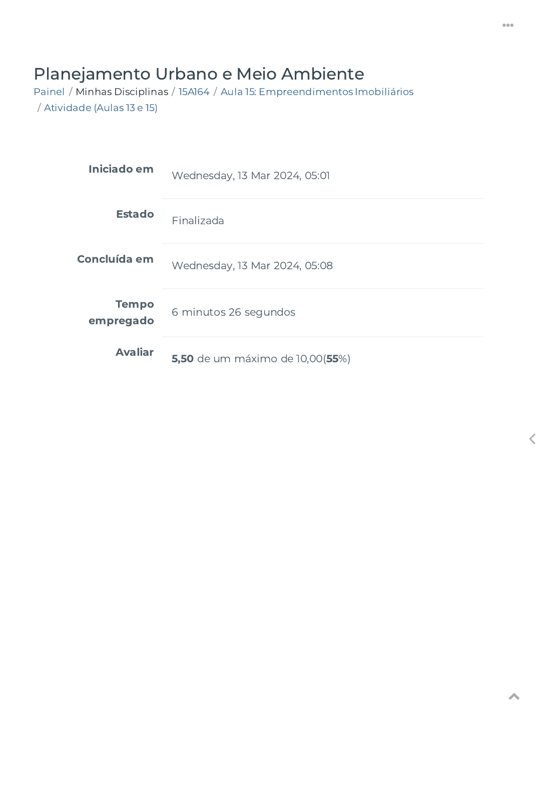 13/03/2024, 05:08 Atividade (Aulas 13 e 15) https://ava.politecnicabr.com.br/mod/quiz/review.php?attempt=6465452 1/15 Painel / Minhas Disciplinas / 15A164 / Aula 15: Empreendimentos Imobiliários / Atividade (Aulas 13 e 15) Planejamento Urbano e Meio Ambiente Iniciado em Wednesday, 13 Mar 2024, 05:01 Estado Finalizada Concluída em Wednesday, 13 Mar 2024, 05:08 Tempo empregado 6 minutos 26 segundos Avaliar 5,50 de um máximo de 10,00(55%) https://ava.politecnicabr.com.br/my/ https://ava.politecnicabr.com.br/my/ https://ava.politecnicabr.com.br/course/view.php?id=923 https://ava.politecnicabr.com.br/course/view.php?id=923#section-17 https://ava.politecnicabr.com.br/mod/quiz/view.php?id=31930 https://ava.politecnicabr.com.br/ 13/03/2024, 05:08 Atividade (Aulas 13 e 15) https://ava.politecnicabr.com.br/mod/quiz/review.php?attempt=6465452 2/15 Questão 1 Correto Atingiu 1,00 de 1,00 De acordo com artigo art. 99 do Código Civil brasileiro, são bens públicos: I - os de uso comum do povo, tais como rios, mares, estradas, ruas e praças; II - os de uso especial, tais como edifícios ou terrenos destinados a serviço ou estabelecimento da administração federal, estadual, territorial ou municipal, inclusive os de suas autarquias; III - os dominicais, que constituem o patrimônio das pessoas jurídicas de direito público, como objeto de direito pessoal, ou real, de cada uma dessas entidades. Escolha uma opção: a. I, II e III estão corretas. b. I e II estão corretas. c. III e II estão corretas. d. Todas as alternativas estão incorretas. https://ava.politecnicabr.com.br/ 13/03/2024, 05:08 Atividade (Aulas 13 e 15) https://ava.politecnicabr.com.br/mod/quiz/review.php?attempt=6465452 3/15 Questão 2 Correto Atingiu 0,50 de 0,50 Caracterizados como proprietários e titulares de direitos aquisitivos que contratem a construção de edi�cações que se destinem à constituição em condomínio, que porventura iniciarem as alienações antes da conclusão das obras: Escolha uma opção: a. Empresa Imobiliária. b. Promotor Imobiliário. c. Incorporador Bancário. d. Incorporadores Imobiliários. https://ava.politecnicabr.com.br/ 13/03/2024, 05:08 Atividade (Aulas 13 e 15) https://ava.politecnicabr.com.br/mod/quiz/review.php?attempt=6465452 4/15 Questão 3 Incorreto Atingiu 0,00 de 0,50 Resultado das diversas atuações do homem como modelador da paisagem, ou seja, executando intervenções por meio de grandes projetos, como o das hidrelétricas, que formam verdadeiros vales arti�ciais: Escolha uma opção: a. Determinismo Ambiental. b. Arranjos Espaciais. c. Território. d. Possibilismo Ambiental. https://ava.politecnicabr.com.br/ 13/03/2024, 05:08 Atividade (Aulas 13 e 15) https://ava.politecnicabr.com.br/mod/quiz/review.php?attempt=6465452 5/15 Questão 4 Correto Atingiu 1,00 de 1,00 Qual Autor considerou Território como sendo: “ Resultado de uma ação conduzida por um ator sintagmático (ator que realiza um programa) em qualquer nível. Ao se apropriar de um espaço, concreta ou abstratamente (por exemplo, pela representação), o ator territorializa o espaço”. Escolha uma opção: a. Raffestin b. Rousseau c. Monbeig d. Haesbalert https://ava.politecnicabr.com.br/ 13/03/2024, 05:08 Atividade (Aulas 13 e 15) https://ava.politecnicabr.com.br/mod/quiz/review.php?attempt=6465452 6/15 Questão 5 Incorreto Atingiu 0,00 de 0,50 Refere-se a perda de sua função, ao dano ou à ruína das estruturas físicas ou ao rebaixamento do nível do valor das transações econômicas de um determinado lugar. Escolha uma opção: a. Deterioração e degradação b. Nenhuma das altenartivas. c. Degradação d. Dano Ambiental. https://ava.politecnicabr.com.br/ 13/03/2024, 05:08 Atividade (Aulas 13 e 15) https://ava.politecnicabr.com.br/mod/quiz/review.php?attempt=6465452 7/15 Questão 6 Correto Atingiu 0,50 de 0,50 Dispõe sobre o Condomínio em Edi�cações e as Incorporações Imobiliárias: Escolha uma opção: a. Lei nº 4.728, de 14 de Julho de 1965. b. Lei nº 4.068, de 9 de Junho de 1962. c. Lei nº 4.591, de 16 de Dezembro de 1964. d. Lei nº 4.380, de 21 de Agosto de 1964. https://ava.politecnicabr.com.br/ 13/03/2024, 05:08 Atividade (Aulas 13 e 15) https://ava.politecnicabr.com.br/mod/quiz/review.php?attempt=6465452 8/15 Questão 7 Incorreto Atingiu 0,00 de 1,00 Quais eventos foram importantes para a concretização de uma estratégia nacional na consolidação de alguns espaços. Escolha uma opção: a. A criação entre os diversos modelos de gestão, caracterizados pelas parcerias feitas entre o Poder Público e a iniciativa privada como os Portos em Suape/ PE. b. As iniciativas bem-sucedidas de empresariamento urbano experimentado por diversas cidades no mundo como Barcelona, Nova Iorque, Baltimore. c. A criação de algumas cidades como Teresina, Belo Horizonte, Goiânia e Brasília, e mais recentemente alguns investimentos em portos (Suape/PE) e aeroportos d. Investimentos em Portos e Aeroportos, Criações de cidades entre elas, São Paulo. e. Nenhuma das alternativas. https://ava.politecnicabr.com.br/ 13/03/2024, 05:08 Atividade (Aulas 13 e 15) https://ava.politecnicabr.com.br/mod/quiz/review.php?attempt=6465452 9/15 Questão 8 Incorreto Atingiu 0,00 de 1,00 Quais princípios motivaram a concepção dos núcleos urbanos: Escolha uma opção: a. O atendimento às necessidades da população e, atender aos interesses de quem quer investir na cidade. b. As facilidades que a aglomeração pode proporcionar aos cidadãos. Isso sempre foi assim ao longo da história das cidades. c. As facilidades para o atendimento às necessidades de abastecimento alimentar e para a moradia. d. Asdiversidades aliadas ao mercado de trocas dos excedentes produzidos, inclusive o mercado de terras, ou seja, a regulamentação da propriedade urbana. https://ava.politecnicabr.com.br/ 13/03/2024, 05:08 Atividade (Aulas 13 e 15) https://ava.politecnicabr.com.br/mod/quiz/review.php?attempt=6465452 10/15 Questão 9